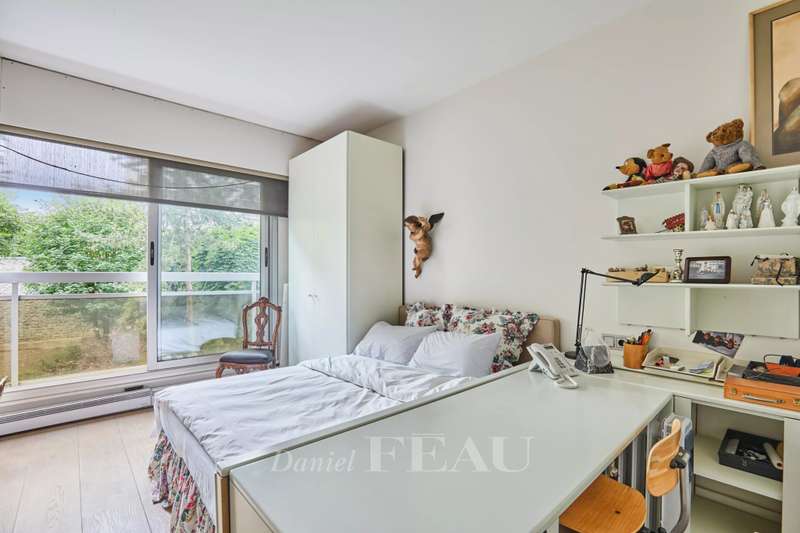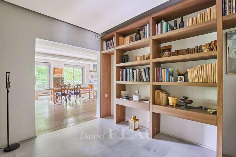 Avenue Raphael/Ranelagh Gardens. This bright and peaceful 215 sqm apartment on the 3rd floor of a luxurious relatively recent building is in very good condition. It includes an entrance hall, a spacious living/reception room opening onto a 14 sqm balcony, a dining room and kitchen overlooking Ranelagh Gardens and enjoying a view of the Eiffel Tower, three bedrooms overlooking a peaceful garden, two bathrooms with a wc, a dressing room, a utility room and a separate wc. With a 14 sqm staff bedroom in the apartment and a cellar. Two lock-up garages (one single, one double) may be acquired at extra cost.