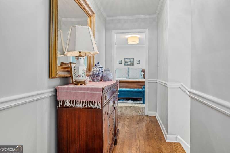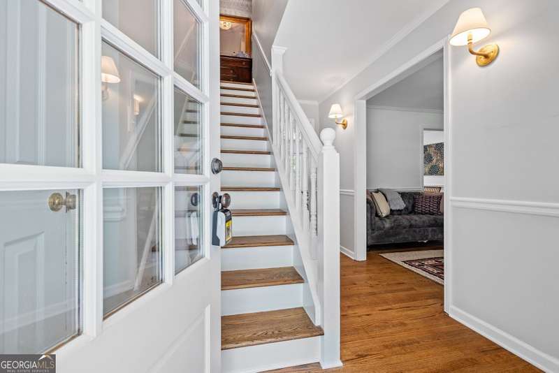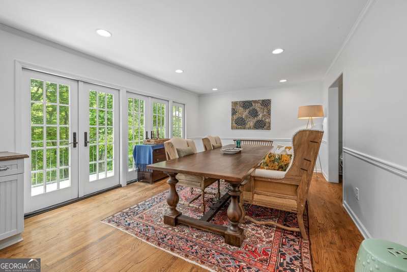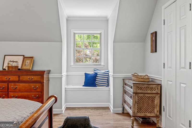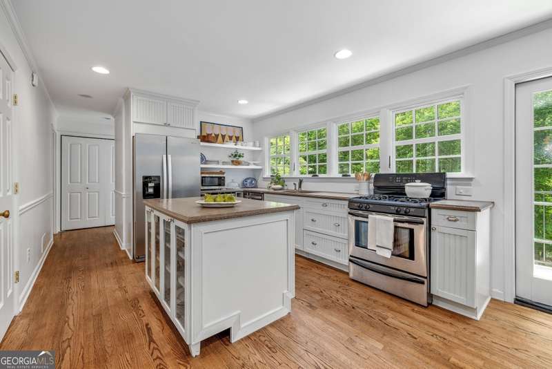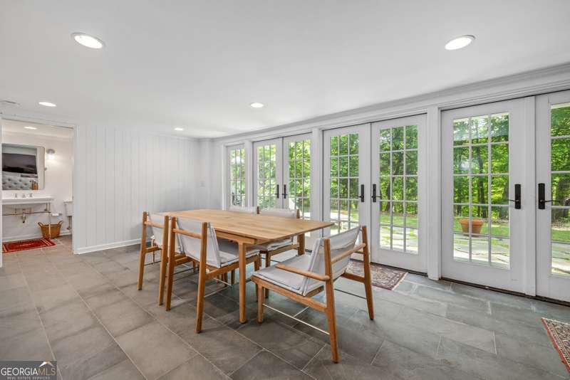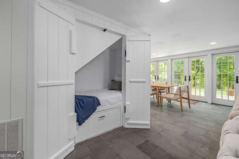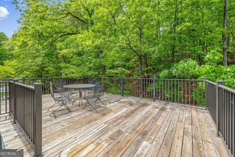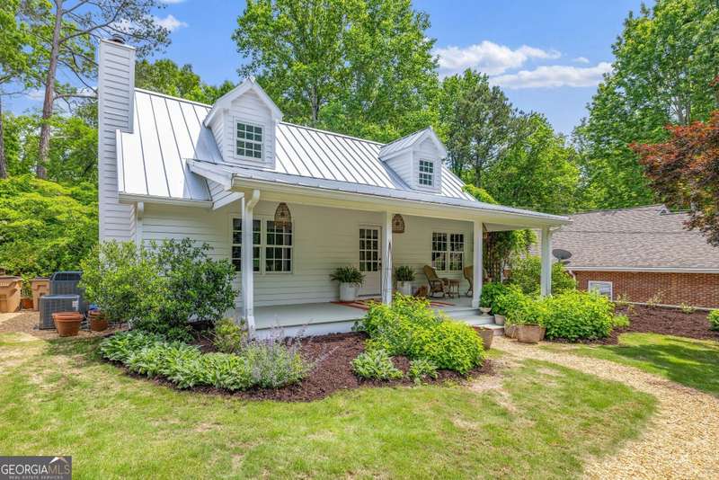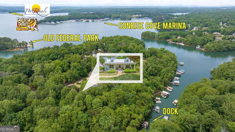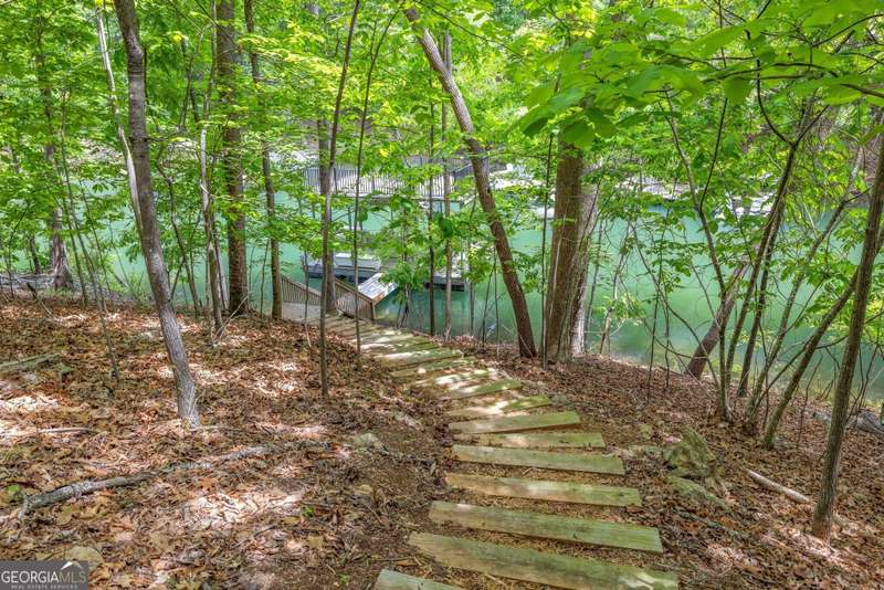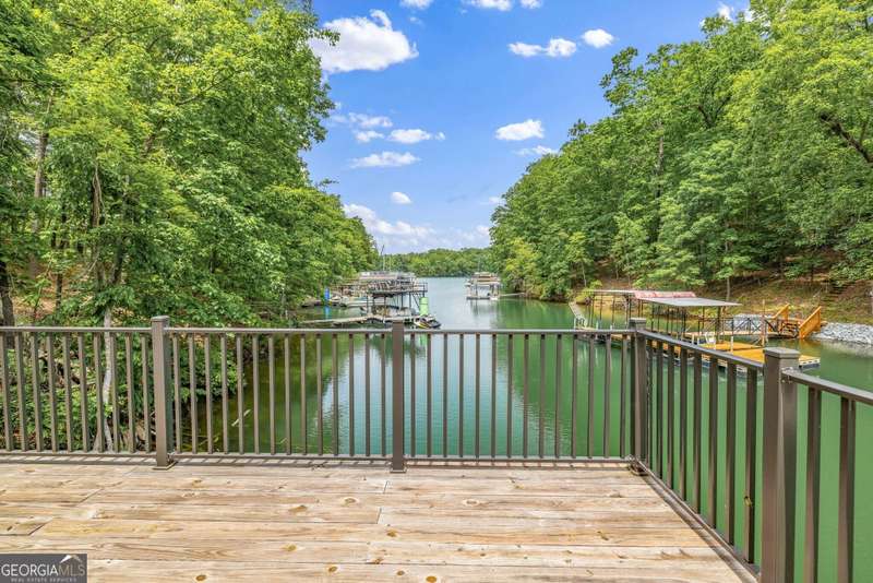 Welcome to this beautifully renovated Lake Lanier home, a rare combination of timeless charm and upscale designer finishes, complete with a single-slip deep water dock conveniently located near South Lake Lanier attractions & dining. From the moment you approach the home, Serena and Lily front porch lighting greets you and sets a precedent for the designer lighting package found throughout. Step inside to discover the character and upgrades around every corner, off the entry way find the dining room and continue to the kitchen that is open to the sitting room, spacious enough to accommodate a kitchen table and a living room amongst the wall of windows and French doors, flooding the room with natural light. The kitchen offers white cabinetry and floating shelves for convenience and storage, in addition to the pantry. The island is the perfect size for a chef's workspace. The back deck off the kitchen invites you to enjoy the private backyard setting. Additionally on the main level, you will find a bedroom that can serve as a study or media room with built ins and a fireplace, and a full bathroom updated to reflect the character and charm found throughout the home with a claw foot tub and designer lighting. Upstairs has been reimagined and renovated to feature two more bedrooms, each with private en-suites. The master suite to the right of the landing is spacious and features window bench seating. The en-suite is adorned in Restoration Hardware finishes and upgrades, including the clawfoot tub with both tub and shower fixtures and double vanity, framed in with windows overlooking the backyard. The additional upstairs bedroom suite is across the landing and offers size and ample natural light, with an en-suite that has built in storage and shelving, and a custom tiled shower. The terrace level was thoughtfully crafted and renovated with guests and entertaining in mind. Blue stone tile flooring is found throughout the entire level and continues to the back patio for a seamless blend into outdoor living space, highlighted by an expansive wall of four sets of French doors. Versatility and function throughout every inch of the terrace level, find space to accommodate a living room, dining room, and more all while accommodating guest sleeping quarters with a built-in twin-size bunk and a pull-down Queen-size Murphy bed. Pre-wired for Dolby 5.1 surround sound, everything has been considered. The full bathroom showcases a walk-in floor to ceiling tiled shower. The hidden storage closet is craft-fully tucked behind a bookcase. The finishes and craftsmanship go beyond aesthetics, with updated and replaced exterior cypress hardwood siding, insulation, and windows, along with the addition of the metal roof. Outside, the grounds have been masterfully re-landscaped with a stone wall, privacy fencing, pea gravel driveway, irrigation system. Amongst the lush Zeon Zoysia turf, find numerous established blooming plants and blossoms. The footprint allows and has been thought-out for future expansion, with space reserved for a garage or carport and a potential three-story addition. The deep water dock is equipped with electrical and pre-wired for path lighting, in addition to water connection. The single slip with a party deck provides space to dine and entertain while enjoying the view to open water. The cove position is ideal, with deep water and protection from boat traffic, yet close to open water. With Lake Lanier access at your back door, there's no shortage of activities, just a short boat ride to Aqualand Marina/Pigtails Restaurant, and easy access to other marinas, dining, and Lake Lanier Islands/Margaritaville. By car, approximately 3 miles from downtown Flowery Branch with shopping and dining.