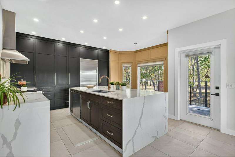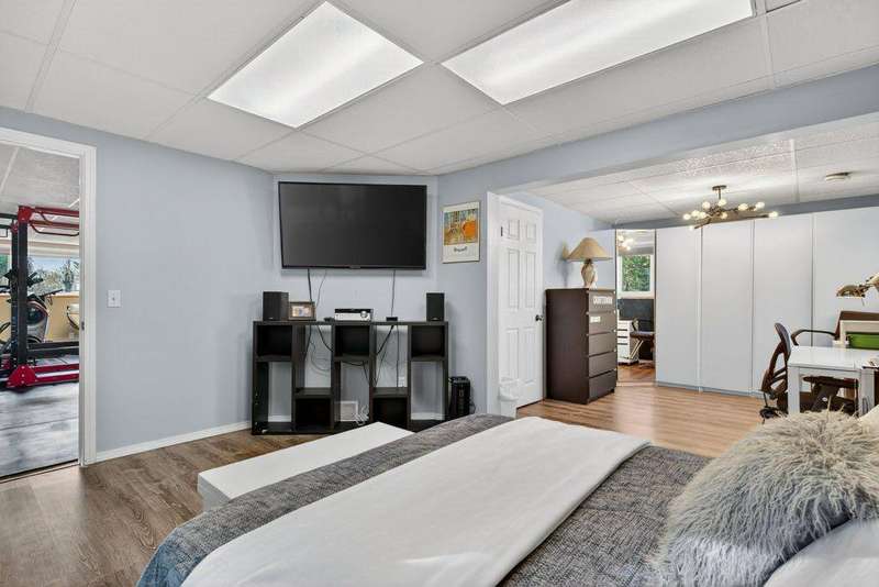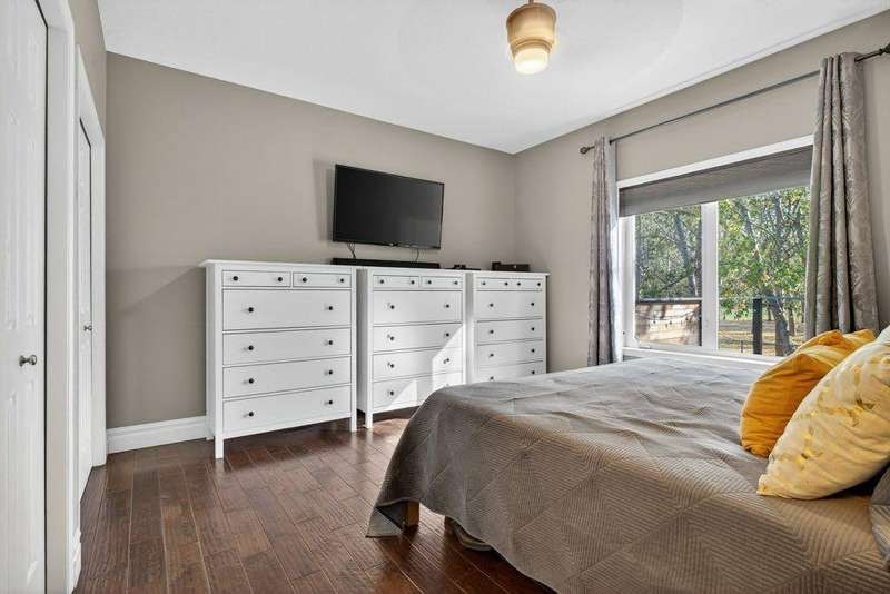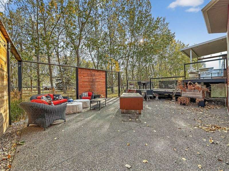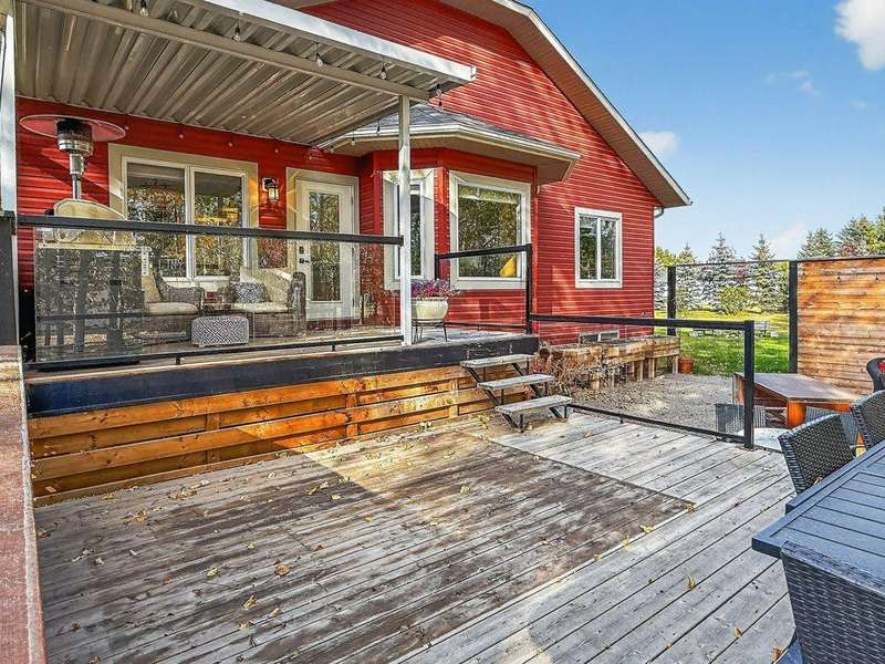 Welcome to this well-appointed acreage property set on just over two acres in Rocky View County. This big bungalow offers a thoughtful blend of comfort, function, and style, along with the conveniences of modern upgrades and reliable utilities. The main floor spans over 1,700 square feet, finished with warm, rough-hewn wood floors and anchored by a fully renovated kitchen. Here you’ll find custom cabinetry with Häfele and Blum hardware, quartz countertops, high-end stainless steel appliances, a contemporary hood vent, and a chevron tile backsplash that adds a clean, modern touch. Just off the kitchen is a spacious living room with a gas fireplace and the huge windows in the dining area flood this space with natural light. A tiled, open entryway creates an inviting first impression, while a large office located near the front door makes working from home convenient. The primary suite is generously sized, offering a private retreat with a five-piece ensuite. A large second bedroom, four piece bathroom and laundry room round out the main floor. Two additional bedrooms and a bathroom on the lower level complete the home’s total of four bedrooms and three full baths, with a fully finished basement that expands the living space and includes a second gas fireplace for cozy evenings. Practical features are well covered: central air conditioning, a septic system with tank and field, and water service through the Rocky View Water Co-operative—no well maintenance required. Car enthusiasts and hobbyists will appreciate the triple heated garage, equipped with 240 wiring, water service, mezzanine storage, and a four-post vehicle lift. In addition there's an over-height, 800 square foot, heated shop with epoxy floors and 240 wiring offering space for all kinds of hobbies. Outdoor living is easy here, with a multi-level deck that is partially covered and finished with glass rails, as well as an exposed aggregate patio. The yard is nicely landscaped with trees that provide both shade and privacy, creating a space that feels quiet and settled. With a balance of modern finishes, solid infrastructure, and room to enjoy both inside and out, this property is a comfortable place to call home in a sought-after area of Rocky View County.