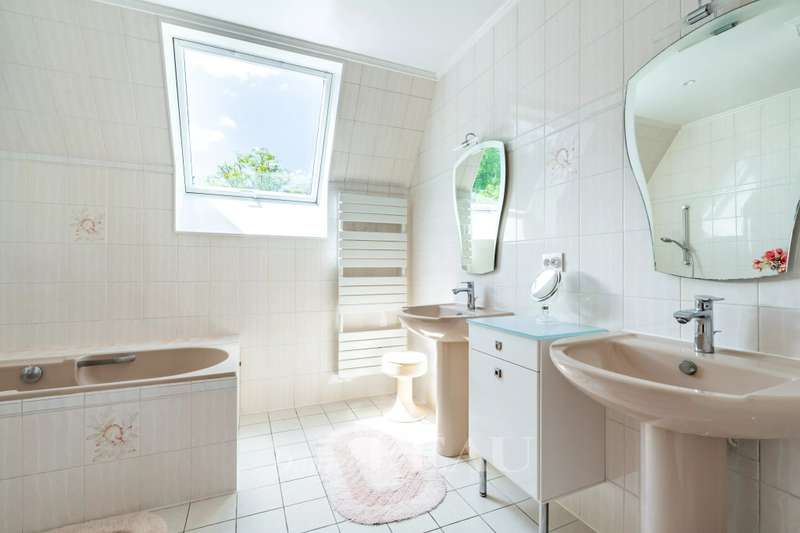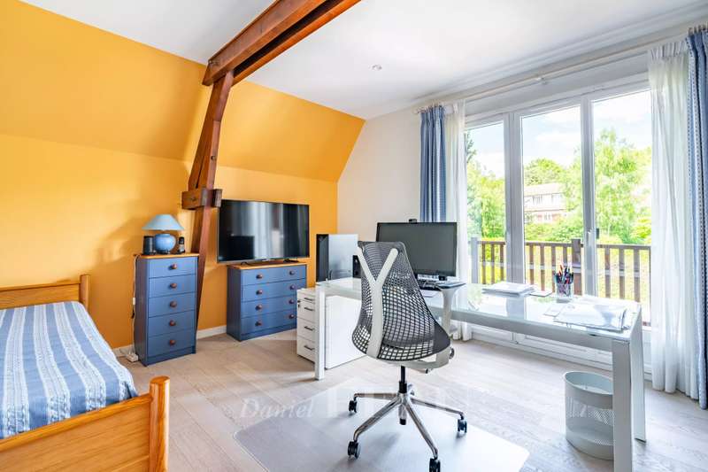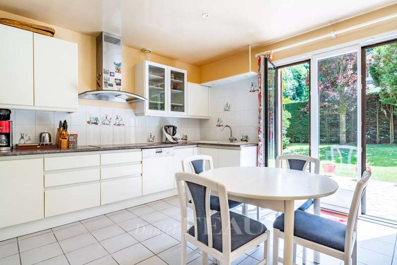 In the heart of a pretty, leafy community surrounded by the Marly forest, this spacious family home in perfect condition stands on a 935 m² wooded lot. A large entrance hall leads to an office, an eat-in kitchen, an adjoining dining room, a living room with a fireplace opening onto the garden and its south-facing terrace; a bedroom with a shower room and a guest toilet. Upstairs, there is a laundry room, two bedrooms, a shower room, a master suite with a balcony overlooking the garden, and an additional bedroom or office with a balcony. The full basement includes a games room, wine cellar, and storage, and a two-car garage. The attic space is convertible, and has been completely renovated and painted. Energy Performance Certificate (EPC) C. Saint-Nom-la-Bretèche train station is 10 minutes away for the L line or the RER A line from Saint-Germain-en-Laye. Bus line 15 is in front of the house. A micro-crèche is 50 meters away, and primary and preschools are a few minutes' walk away. Five minutes walk from the village center (market, bakery, pharmacy, mini-market, etc.)