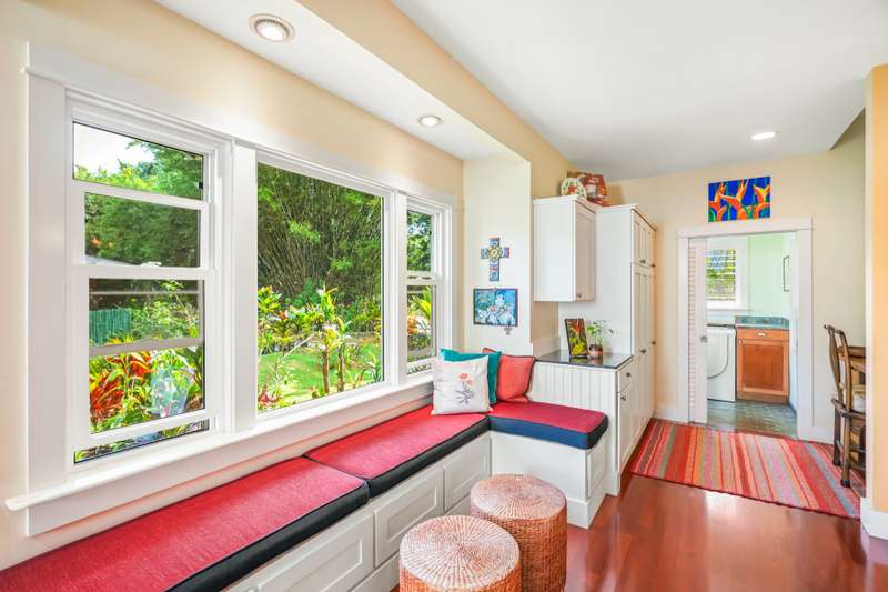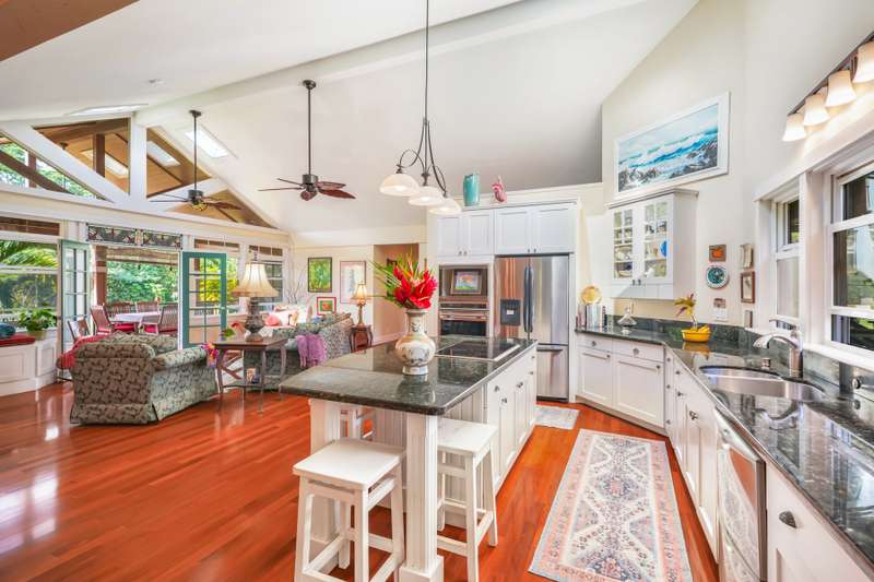 The primary residence welcomes guests with stunning rosewood hardwood floors and showcases exceptional craftsmanship throughout. Quality materials are evident from the slate entry to the travertine-tiled bath and custom finishes. The kitchen is equipped with a Wolf cooktop and oven, while additional highlights include a Whirlpool Kohler tub, charming bay windows, and Ipe-wood lanais. Both the main home and cottage benefit from solar water heating. An outdoor shower, fragrant tropical plantings, and the serene, secluded location enhance the ambiance of this unique property.