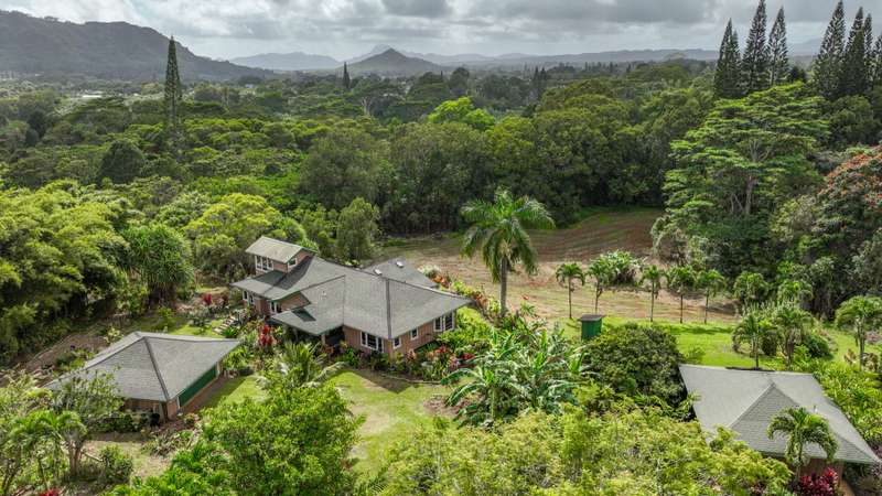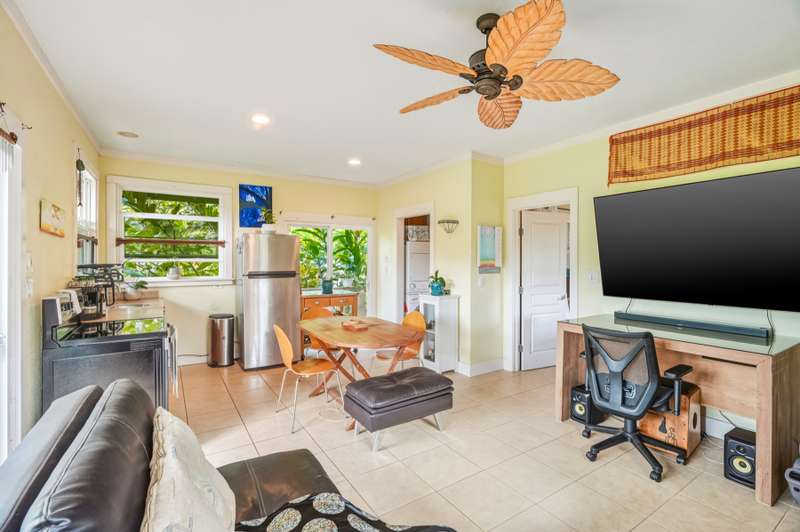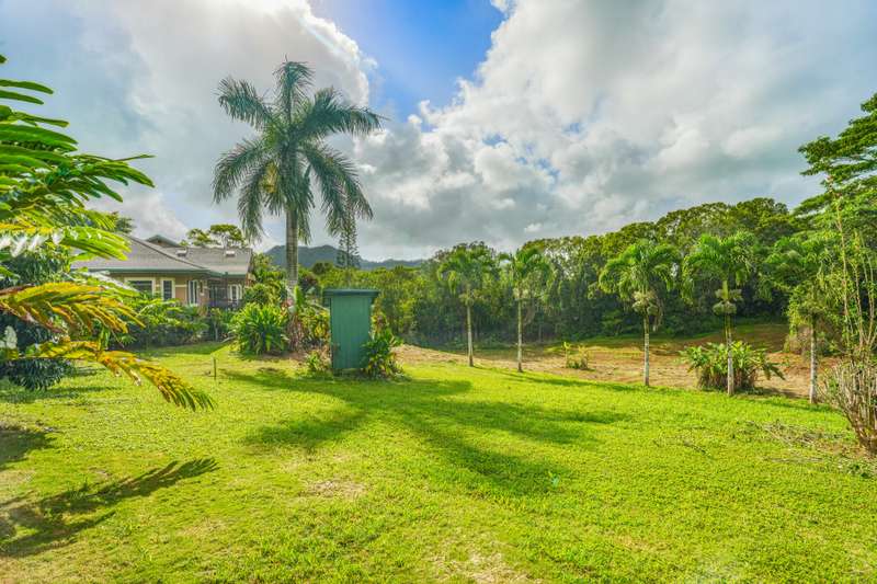 The property offers an abundant array of tropical fruit trees and botanicals, including navel orange, lemon, lime, papaya, pineapple, 11 macadamia nut trees, Samoan dwarf coconut, avocado, ginger, multiple varieties of banana, breadfruit, Surinam cherry, and tangerines. For wellness enthusiasts, the grounds also provide awapuhi ginger, noni, edible flowers, and additional culinary and medicinal plants. Flowering trees and ornamentals—including jacaranda, puakenikeni, queen crepe myrtle, coral tree, rainbow shower, and numerous orchids—allow for creating custom leis and vibrant floral arrangements.