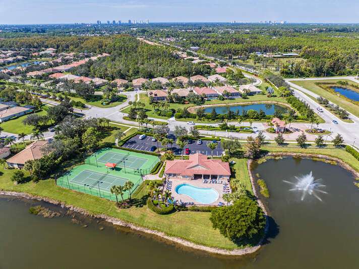 Enjoy peaceful, long LAKE VIEWS from this beautifully updated 3-bedroom, 2-bath home in the desirable GATED community of HAWTHORNE. The spacious kitchen boasts wood cabinets, granite countertops, newer stainless-steel appliances, and generous counter space. A separate formal dining room and living area complement the open-concept but family room and kitchen space, while the split-bedroom layout allows privacy for guests or family. The large Owner's Suite features a luxurious en-suite bath with separate tub and shower. Recent upgrades include a NEW TILE ROOF (2024) and hurricane SHUTTERS (2020), adding peace of mind and security. Hawthorne homeowners enjoy full lawn maintenance, basic cable/internet, 2 gated entrances, and amenities like tennis, PICKLEBALL, a fitness center, POOL, spa, and active social clubs, all INCLUDED in the low HOA fee. Ideally located in Bonita Springs, close to sugar sand beaches and conveniently located to Coconut Point Outdoor Mall, RSW Airport, Publix, kayaking on the Imperial River, restaurants, bars and entertainment. No storm damage and in a non-flood zone-this home blends comfort, convenience, and pristine community living.
