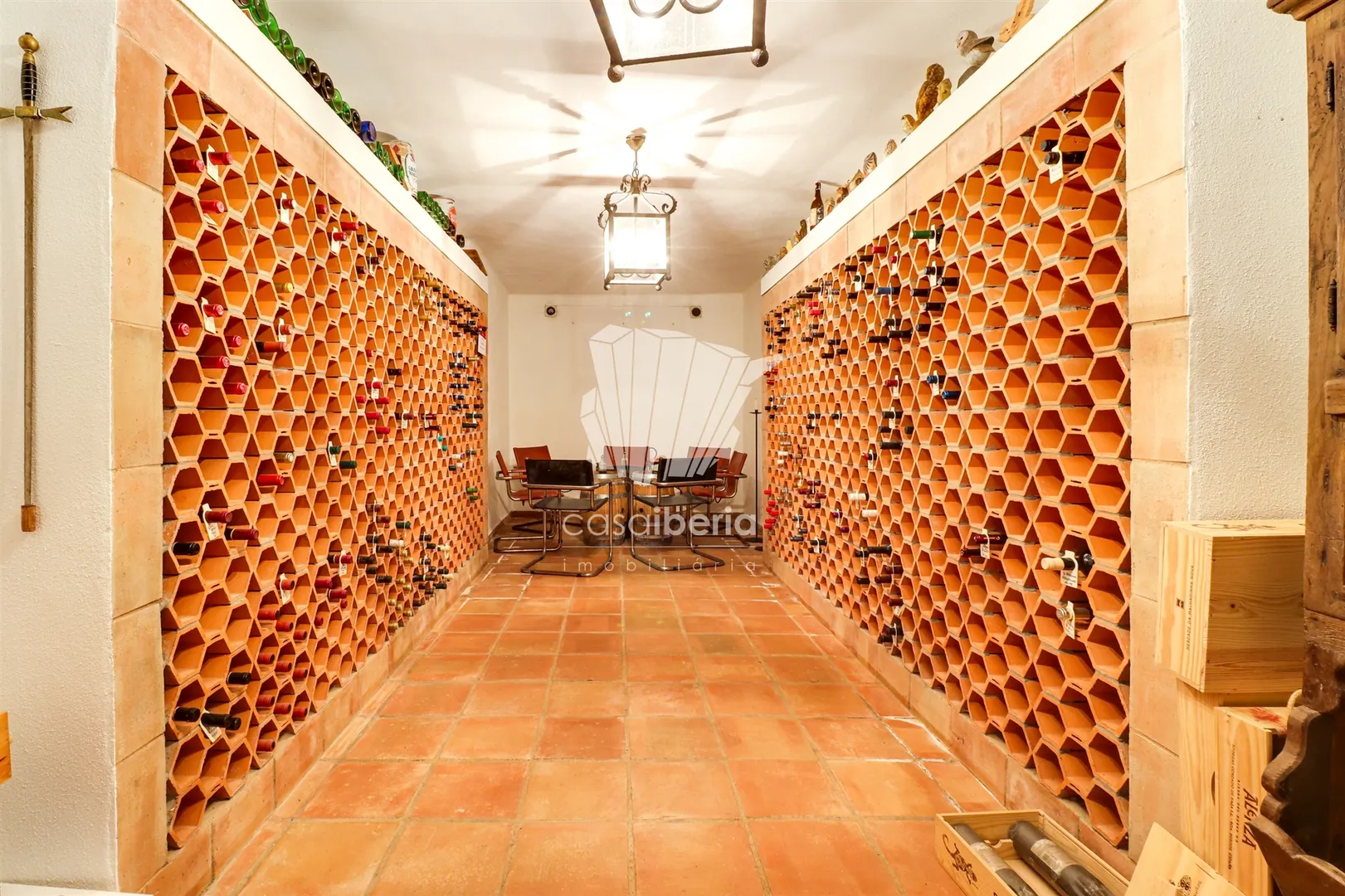 The spacious master suite offers air conditioning, a fireplace, two walk-in closets, a bathroom with a whirlpool tub and shower, and direct access to the basement and studio. The basement includes multipurpose spaces, a large area with a sauna, wine cellar, and exterior access.