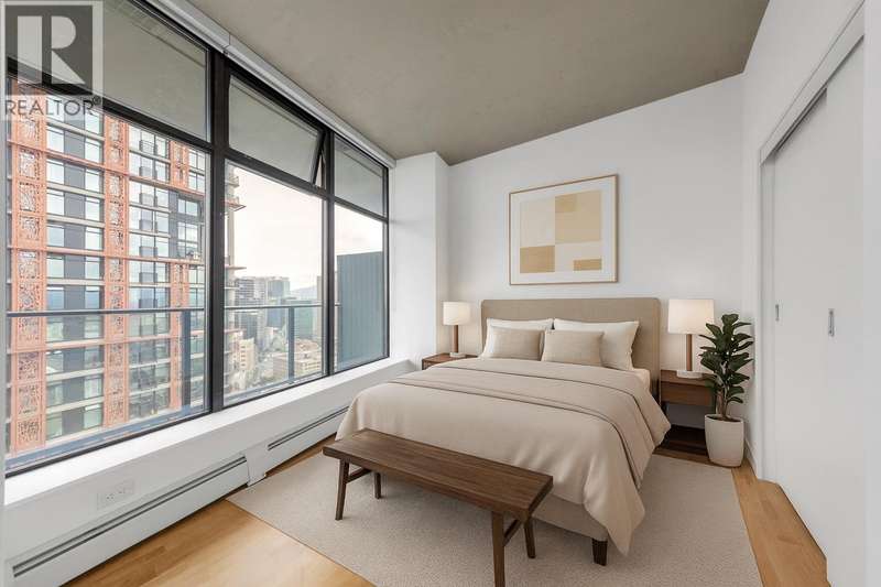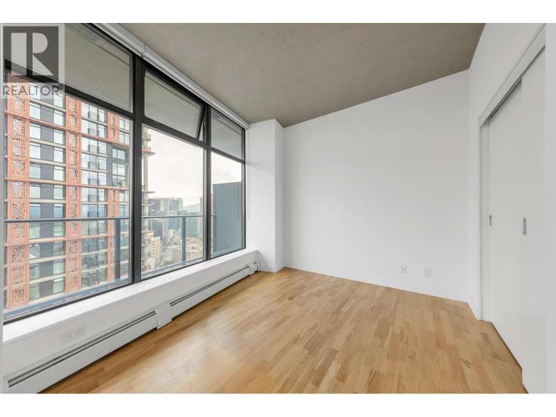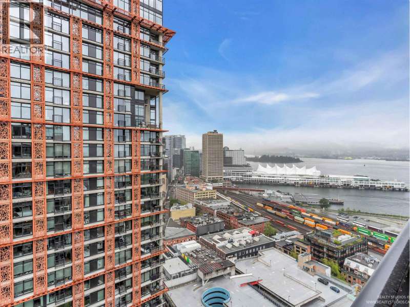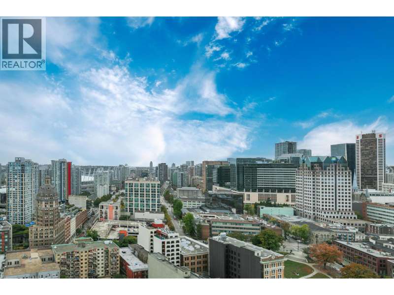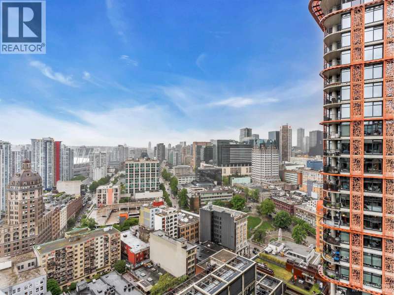 TOP FLOOR of the historic Woodwards! Sweeping views of City skyline, Ocean and North Shore mountains to enjoy from your patio that extends the length of the suite. Freshly painted and ready for a new owner, this urban condo offers over height polished concrete ceilings, giant floor to ceiling windows in the living and bedroom, h/w flooring throughout and enviable counter space that include a large quartz topped island. Large bathroom with separate shower and soaker tub, insuite laundry and California closets in the bedroom. Woodwards is famous for it's amenities and W shaped rooftop hot tub. Top of the line fitness centre, party room and working stations in a common area for work from home folks who like a change of scenery. Pleasure and Easy to show. OPEN SUNDAY Oct 5th 2-4 pm (id:58403)
