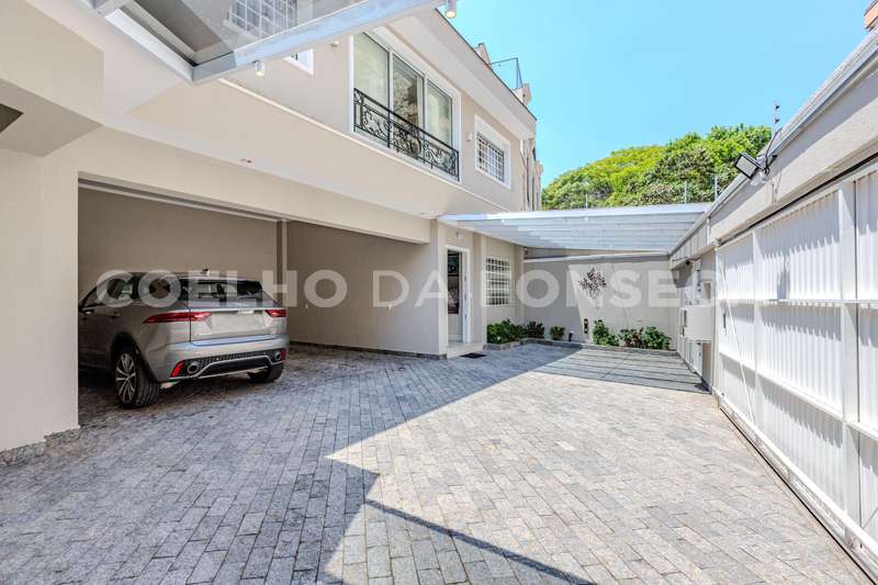 A garagem acomoda confortavelmente 6 carros, com possibilidade de estacionar até 8 veículos.