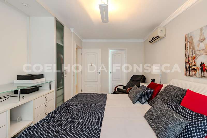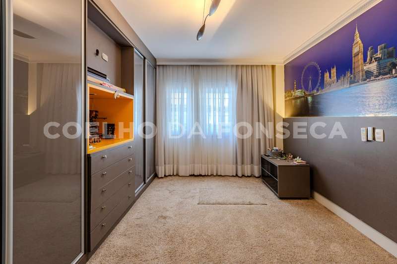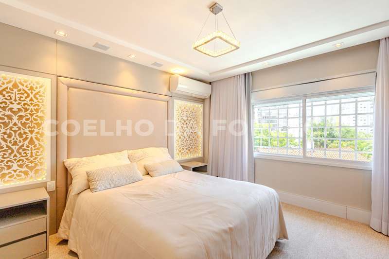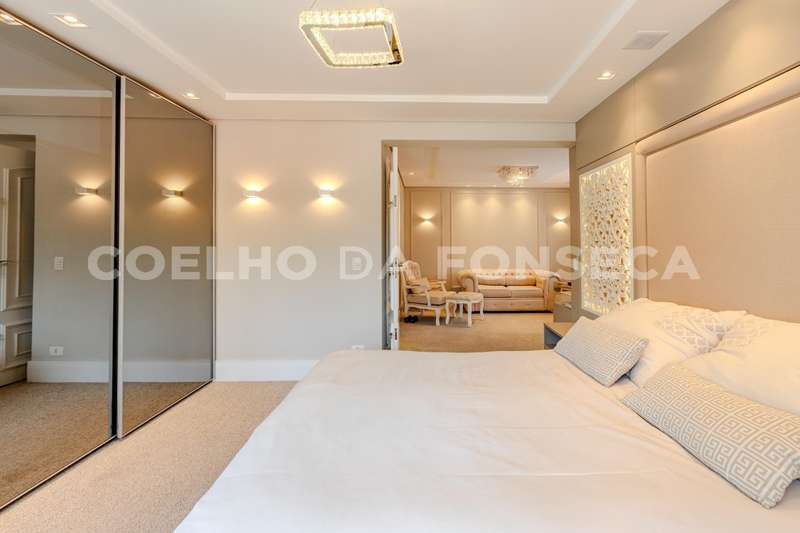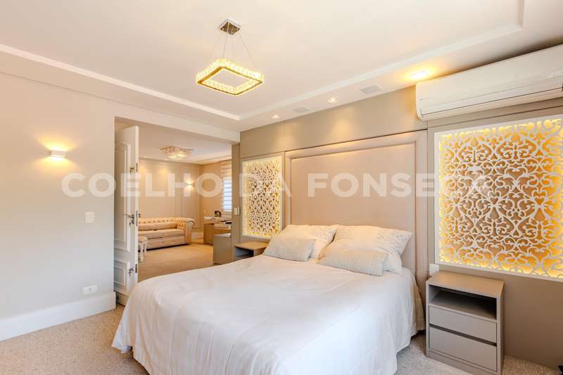 A suíte master ocupa um andar exclusivo, oferecendo um espaço privativo com ante sala, closet walk-in e banheiro com pia dupla.