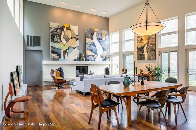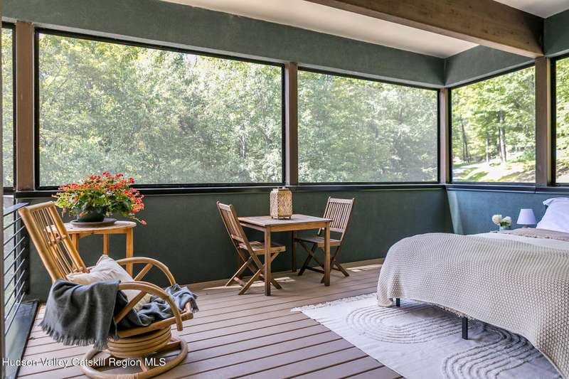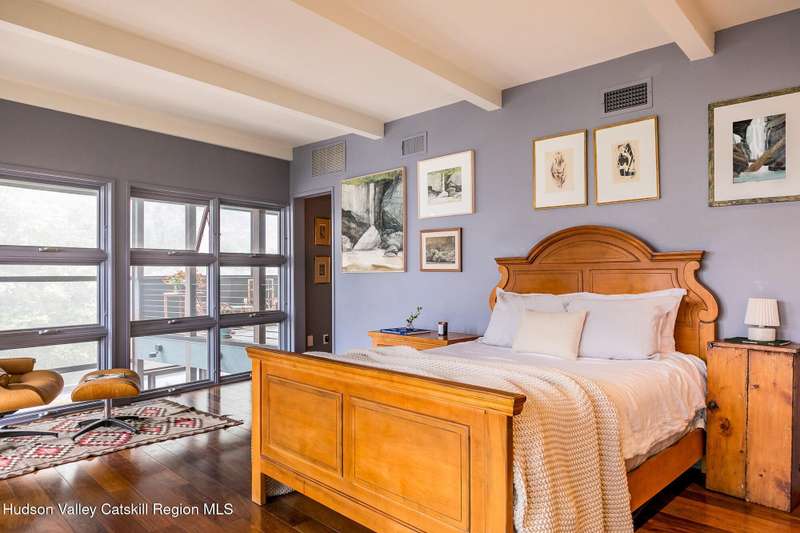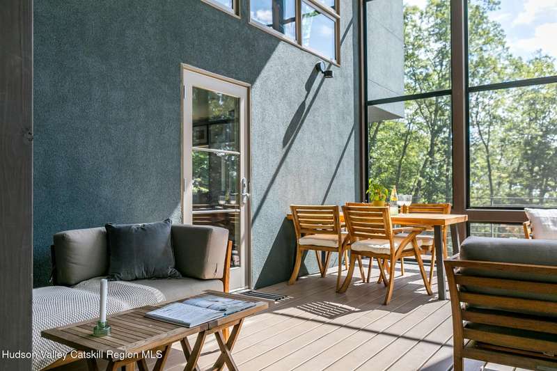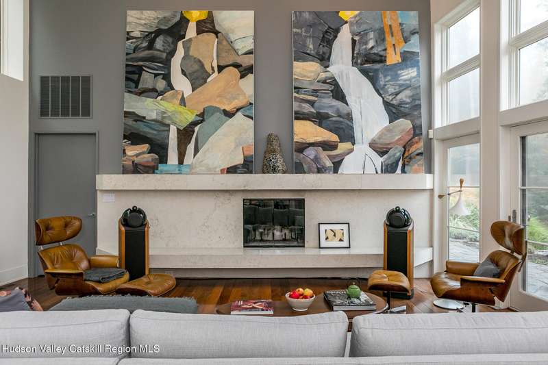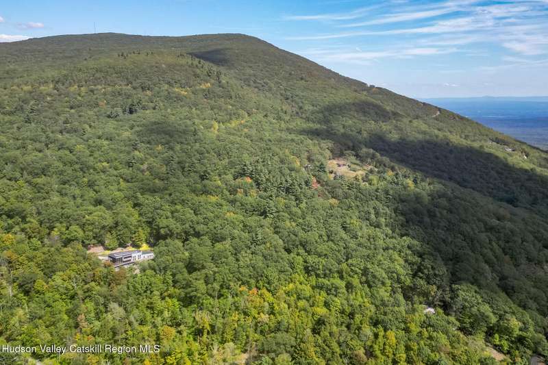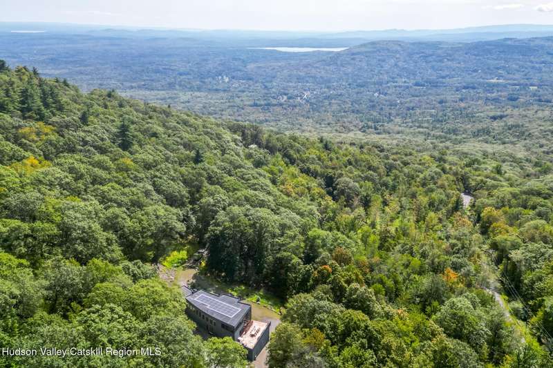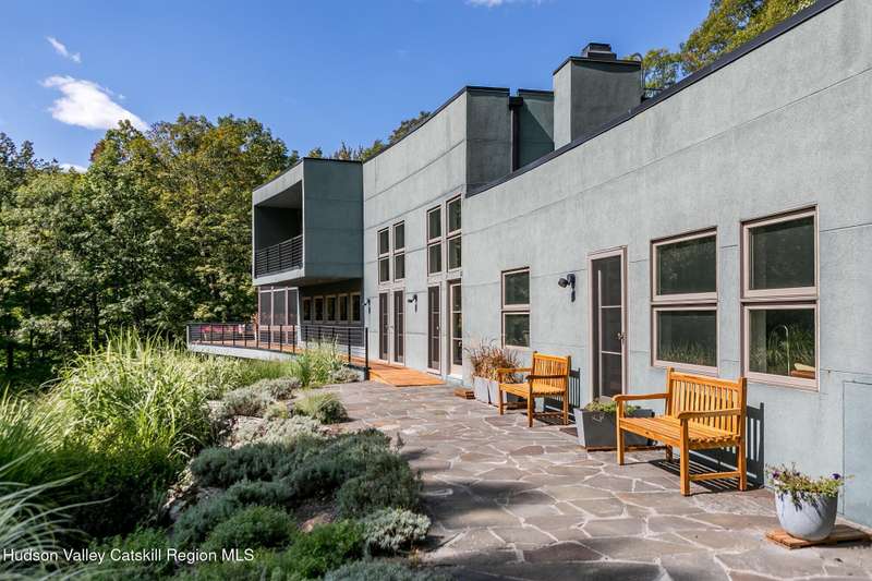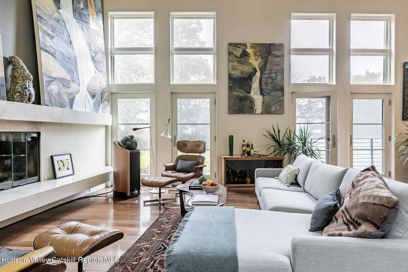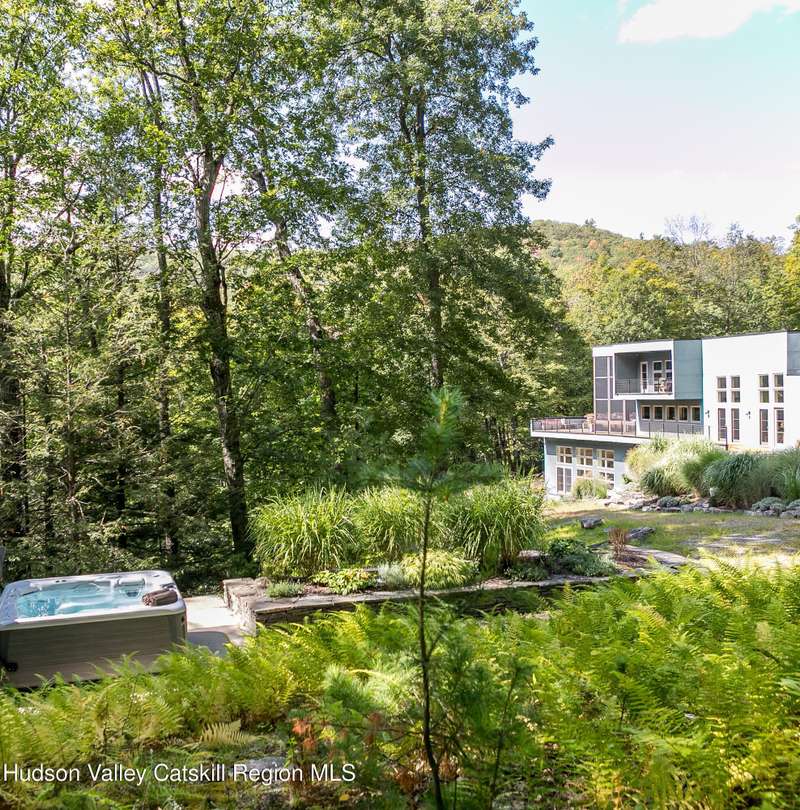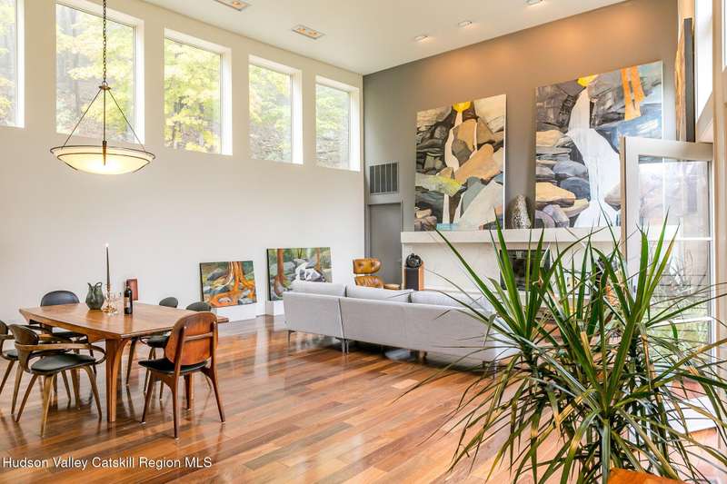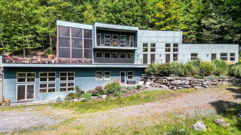 Swoop House is a residence with two great rooms, one of which was designed as a professional art studio. Designed by FT Architecture & Interiors, and inspired by the Diller Scofidio Slow House, the 5000 square feet span three levels. This singular residence is sited at the end of a long driveway on Overlook Mountain on 16 peaceful and private acres. This property provides you with both distant and intimate mountain views. It borders thousands of acres of pristine NY State land, while being located just five minutes from the village of Woodstock. Two non-parallel curved walls and sloping ceilings create a graceful series of shapes. The first story has a spacious two-story entry with a walk-in closet, and Brazilian cumaru wood flooring. There is great room with a 40-foot-long curved northern wall providing ample room for art displays, as well as a row of 10 large picture windows above - each of which frame views of the surrounding environment. The room is anchored by a wood burning fireplace with a 15-foot blanca perlino Italian marble hearth. Floor-to-ceiling windows face South, where glass doors lead to a walkway and a series of outdoor spaces. The gourmet kitchen boasts top of the line Bosch, and Wolf appliances and a built in Sub-Zero refrigerator, a stone countertop, and a butler's pantry with a sink and second refrigerator. The kitchen door leads out onto an expansive two story screened porch designed for dining and lounging, and the 40-foot outdoor deck, with black locust wood decking, where you can host dinner parties among the treetops. Adjacent to the kitchen is an office, and an adjoining full bath. Two well appointed bedroom suites are located on either end of the residence for privacy. The first floor bedroom suite has high ceilings, a walk-in closet, and large windows. A private entrance opens out onto one of several native bluestone patios, surrounded by perennial gardens with a hot tub. Its spacious bathroom has a dressing area and an oversized Brazilian stone shower where it is easy to imagine yourself under a waterfall. Leading to the primary bedroom suite, an open staircase provides views of the great room and outdoors from above. At the top of the stairs there is access to a south facing balcony. Here you can soak up sunshine and views year round while staying protected from the elements. The primary bedroom suite has two walls of floor to ceiling windows, a walk-in closet, and ensuite bathroom with a shower, a travertine marble countertop, and walk-through room for a jetted tub. From here one can step outdoors onto a serene sleeping porch on a loft within the two-story screened porch. Access to the second great room is provided from inside the house, as well as from outside at ground level, via a set of double glass doors and its own dedicated driveway. This space, now in use as a painting studio offers 2000 square feet, with 18-foot ceilings, a 40-foot display wall, oak flooring and radiant heat. Large windows, with custom sun-blocking shades, provide gorgeous natural light. There are also tracks for lighting, and a double utility sink in the kitchenette. Its adjoining media room is a place where you can take a break, repose, listen to music, have meetings, workout, and refresh in the full bathroom with a steam shower. It too has a private entrance that opens to a bluestone patio. There is a laundry room with linen storage, and a 300 square foot storage space. The studio and media spaces would also make an impressive addition to the residence as a family room or an alternative private bedroom suite. The outdoor spaces where you can enjoy the mountain and gardens are perfect for finding solitude or for entertaining. Swoop House is within 10 minutes to The Bearsville Theater, Woodstock's renowned restaurants, music venues, art galleries, shops, and farmer's market. It is 20 minutes to Kingston, 30 minutes to Rhinebeck and under two hours to NYC.