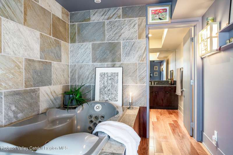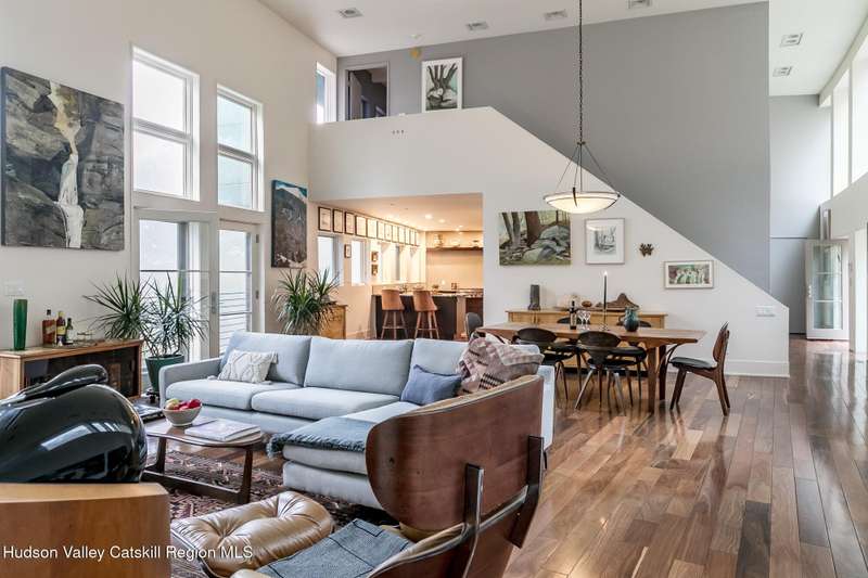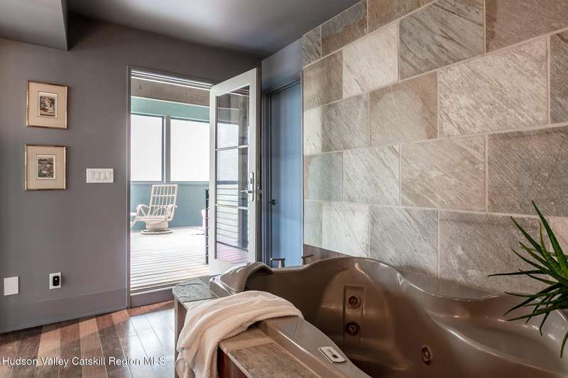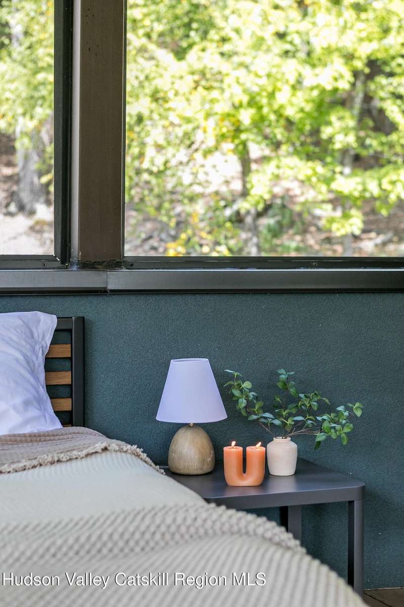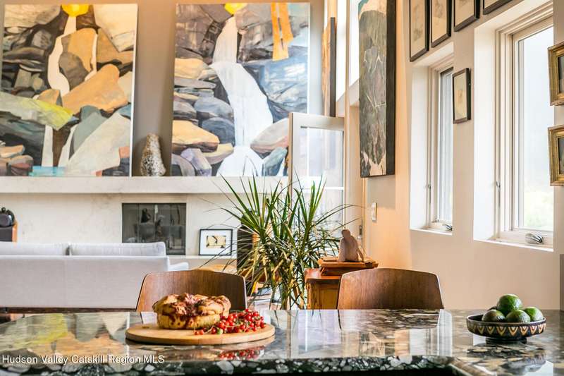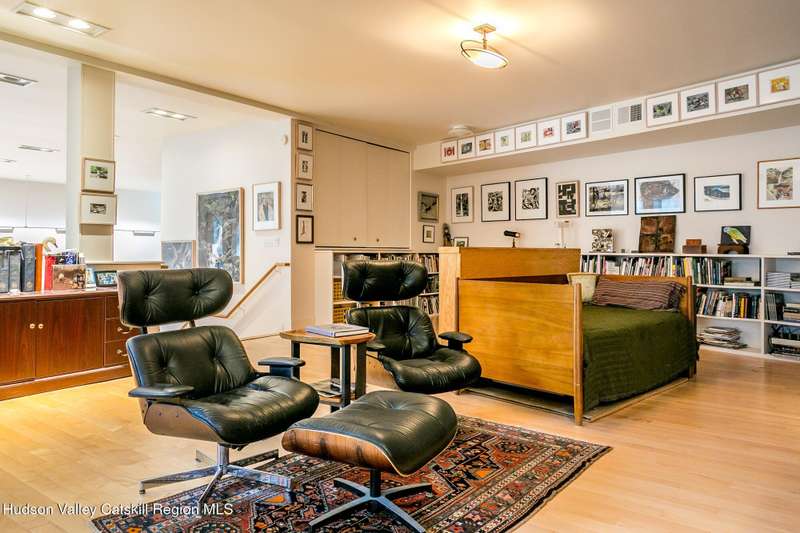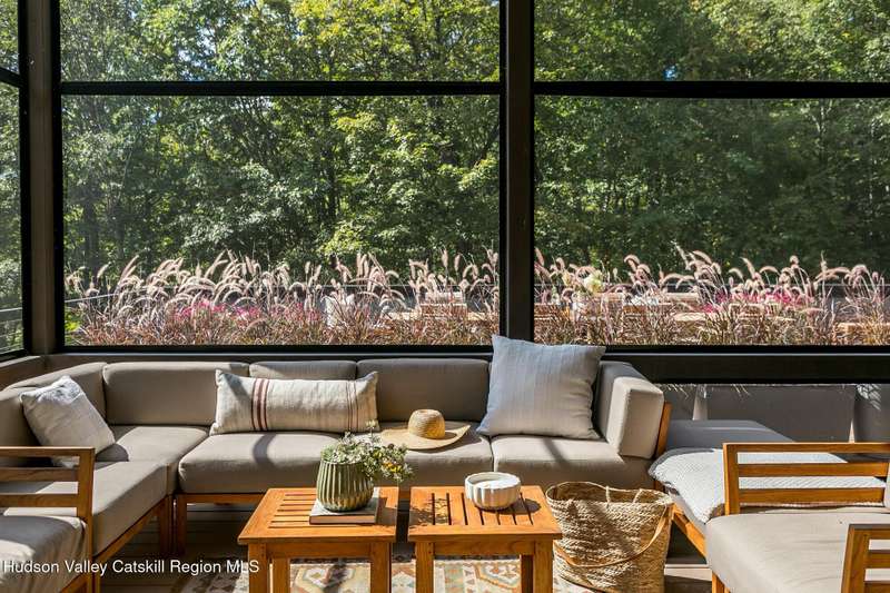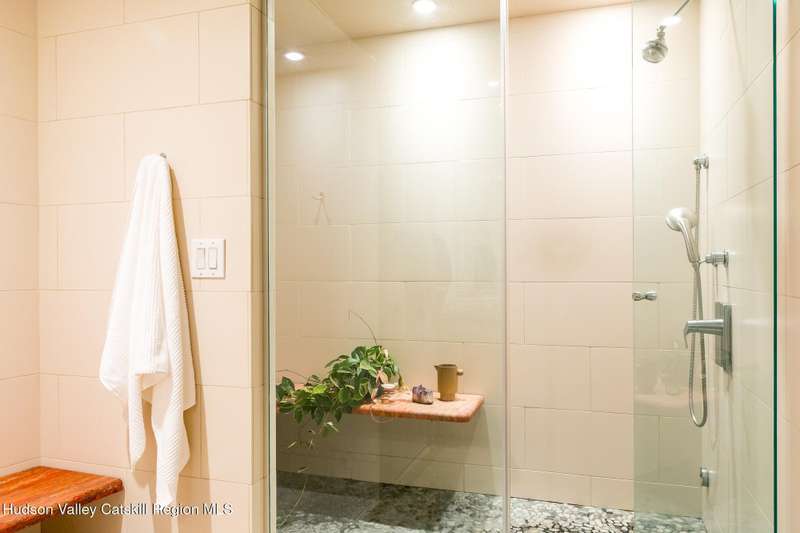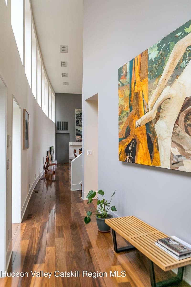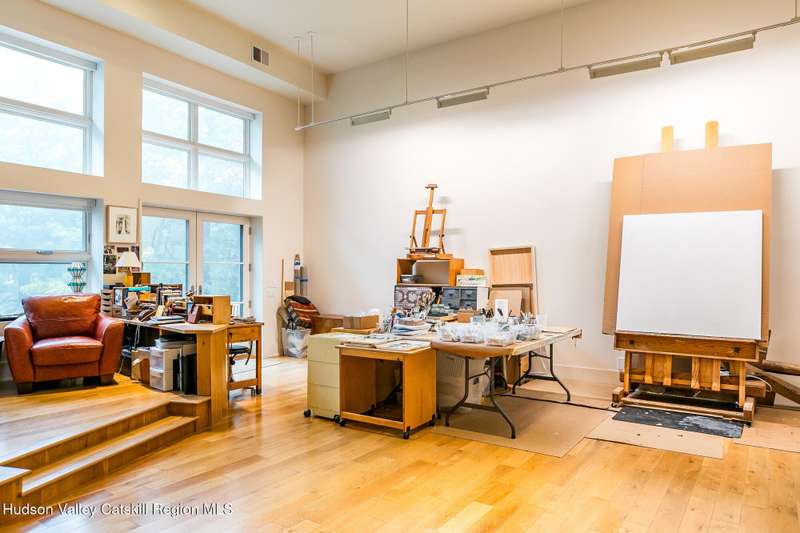 Swoop House is a residence with two great rooms, one of which was designed as a professional art studio. Designed by FT Architecture & Interiors, and inspired by the Diller Scofidio Slow House, the 5000 square feet span three levels. This singular residence is sited at the end of a long driveway on Overlook Mountain on 16 peaceful and private acres. This property provides you with both distant and intimate mountain views. It borders thousands of acres of pristine NY State land, while being located just five minutes from the village of Woodstock. Two non-parallel curved walls and sloping ceilings create a graceful series of shapes. The first story has a spacious two-story entry with a walk-in closet, and Brazilian cumaru wood flooring. There is great room with a 40-foot-long curved northern wall providing ample room for art displays, as well as a row of 10 large picture windows above - each of which frame views of the surrounding environment. The room is anchored by a wood burning fireplace with a 15-foot blanca perlino Italian marble hearth. Floor-to-ceiling windows face South, where glass doors lead to a walkway and a series of outdoor spaces. The gourmet kitchen boasts top of the line Bosch, and Wolf appliances and a built in Sub-Zero refrigerator, a stone countertop, and a butler's pantry with a sink and second refrigerator. The kitchen door leads out onto an expansive two story screened porch designed for dining and lounging, and the 40-foot outdoor deck, with black locust wood decking, where you can host dinner parties among the treetops. Adjacent to the kitchen is an office, and an adjoining full bath. Two well appointed bedroom suites are located on either end of the residence for privacy. The first floor bedroom suite has high ceilings, a walk-in closet, and large windows. A private entrance opens out onto one of several native bluestone patios, surrounded by perennial gardens with a hot tub. Its spacious bathroom has a dressing area and an oversized Brazilian stone shower where it is easy to imagine yourself under a waterfall. Leading to the primary bedroom suite, an open staircase provides views of the great room and outdoors from above. At the top of the stairs there is access to a south facing balcony. Here you can soak up sunshine and views year round while staying protected from the elements. The primary bedroom suite has two walls of floor to ceiling windows, a walk-in closet, and ensuite bathroom with a shower, a travertine marble countertop, and walk-through room for a jetted tub. From here one can step outdoors onto a serene sleeping porch on a loft within the two-story screened porch. Access to the second great room is provided from inside the house, as well as from outside at ground level, via a set of double glass doors and its own dedicated driveway. This space, now in use as a painting studio offers 2000 square feet, with 18-foot ceilings, a 40-foot display wall, oak flooring and radiant heat. Large windows, with custom sun-blocking shades, provide gorgeous natural light. There are also tracks for lighting, and a double utility sink in the kitchenette. Its adjoining media room is a place where you can take a break, repose, listen to music, have meetings, workout, and refresh in the full bathroom with a steam shower. It too has a private entrance that opens to a bluestone patio. There is a laundry room with linen storage, and a 300 square foot storage space. The studio and media spaces would also make an impressive addition to the residence as a family room or an alternative private bedroom suite. The outdoor spaces where you can enjoy the mountain and gardens are perfect for finding solitude or for entertaining. Swoop House is within 10 minutes to The Bearsville Theater, Woodstock's renowned restaurants, music venues, art galleries, shops, and farmer's market. It is 20 minutes to Kingston, 30 minutes to Rhinebeck and under two hours to NYC.