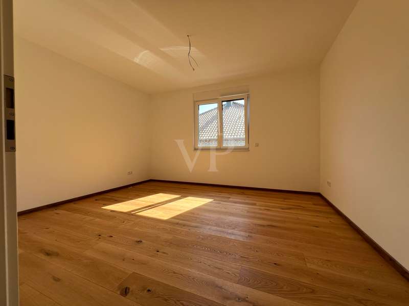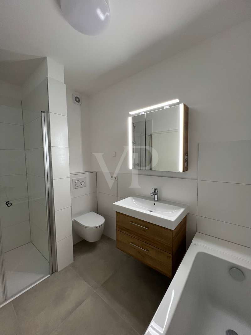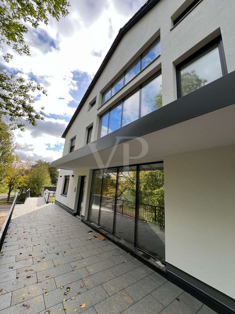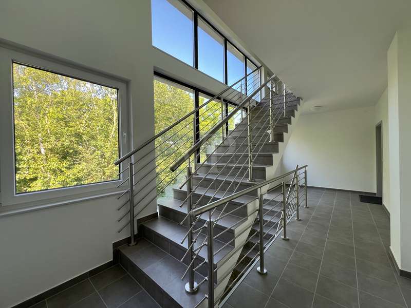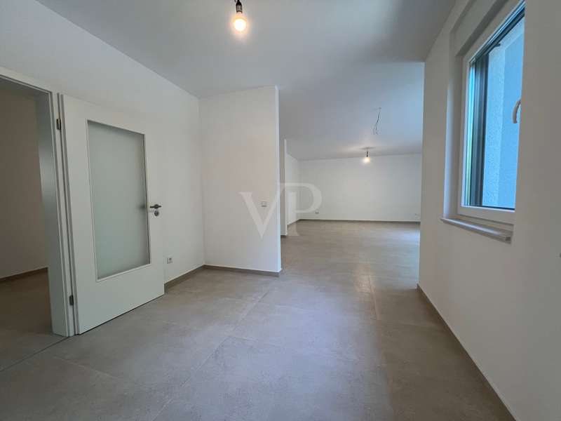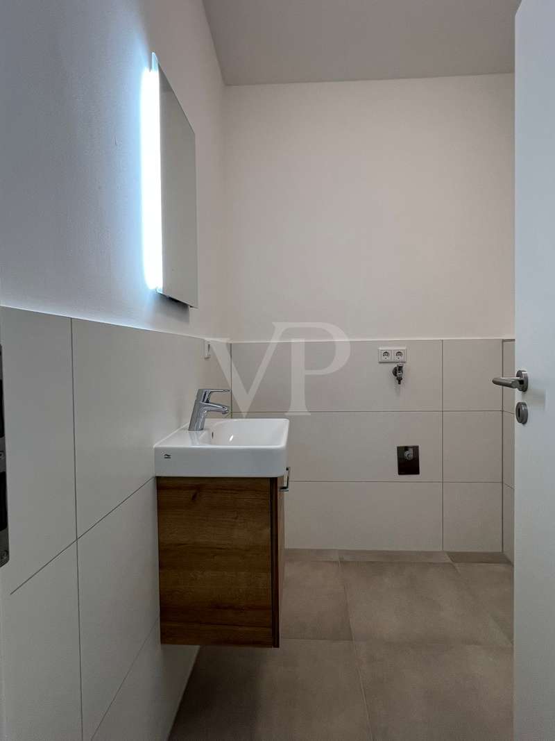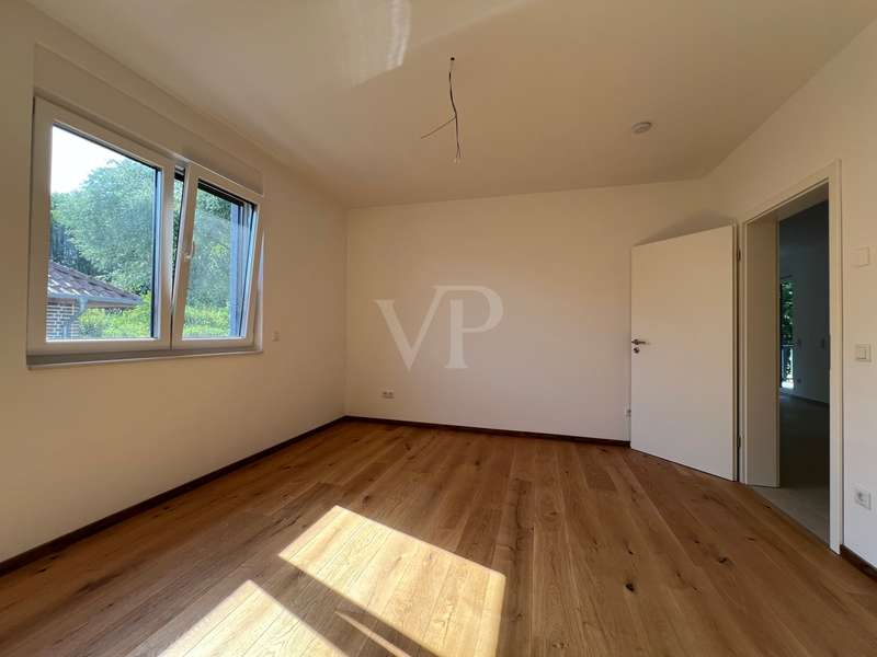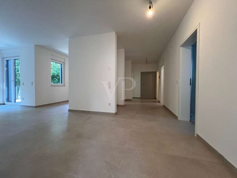This first-class apartment is located in a modern new building in the popular Hottenbergsfeld development area of Hameln. With a living space of approx. 113.04 m², it offers generous space for comfortable living. The building, which will be completed in 2024, is characterized by contemporary construction quality and energy-efficient standards, including classification as an efficiency house according to GEG (A+). The apartment comprises three rooms, including two bedrooms and a spacious living area. It offers a high degree of flexibility in terms of room layout and use. The bathroom is equipped with a modern bathtub and ceramic, floor-level shower. There is also a separate guest WC with a washer/dryer connection. The property is furnished to a high standard. Tiling can be found in the kitchen, hallway, utility room, bathroom and WC, while high-quality parquet flooring in the bedrooms creates a warm, inviting ambience. Electric external roller shutters on all triple-glazed windows offer optimum comfort. The soundproofed apartment entrance doors contribute to peace and privacy. Another plus point is the spacious balcony with an area of approx. 11.25 m², which offers additional opportunities to relax and spend time outdoors. Underfloor heating throughout all rooms ensures cozy warmth and a pleasant living climate. This is supported by a combination of gas central heating and an air-to-water heat pump with hot water tank. A locked storage room on the top floor, which is assigned to the apartment, offers sufficient storage space. The driveways and communal areas are designed with concrete rectangular paving, which harmoniously rounds off the external appearance. Additional convenience is provided by a private parking space, which is available for €50.00 per month. The ancillary costs are currently estimated at € 200.00, as it is a new build and no consumption and billing data is available yet. The earliest possible move-in date could be August 01, 2025. The outdoor facilities still have to be completed. We would like to receive the usual documents from prospective tenants (copy of identity card, last 3 payslips, Schufa and tenant self-disclosure) at the viewing appointment.