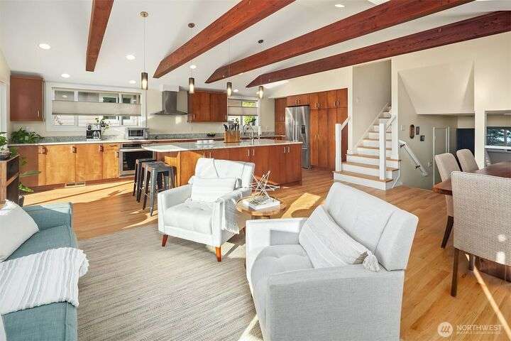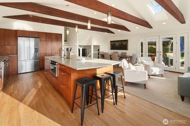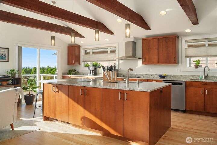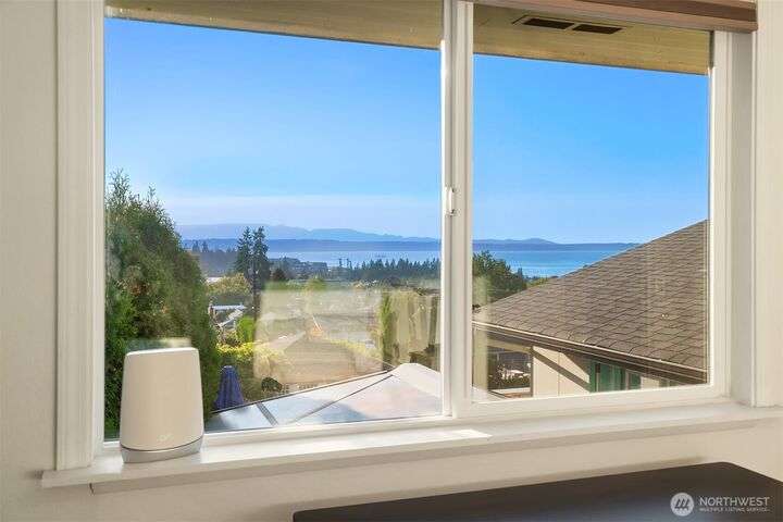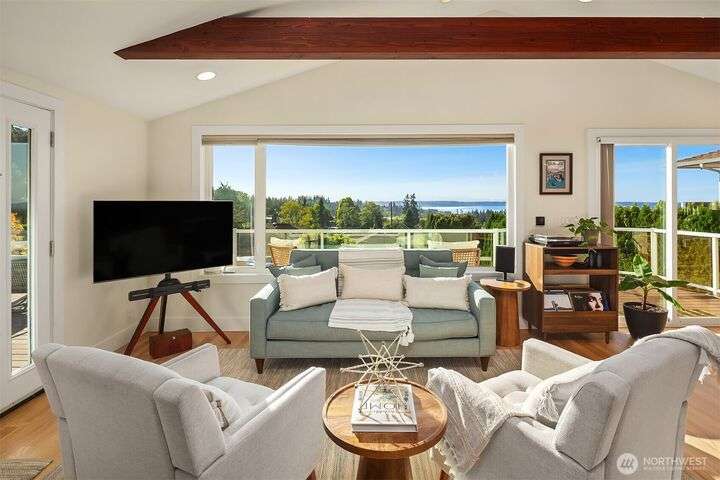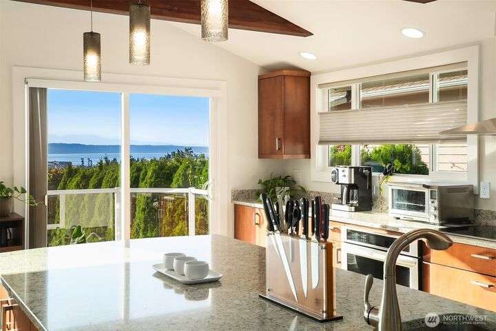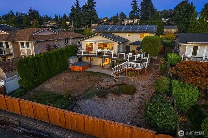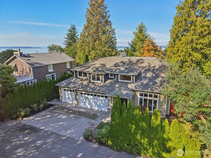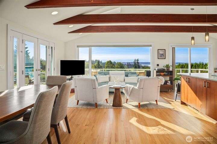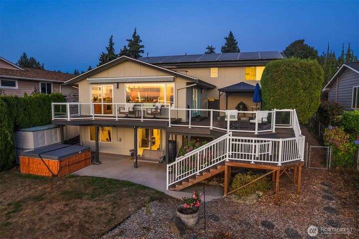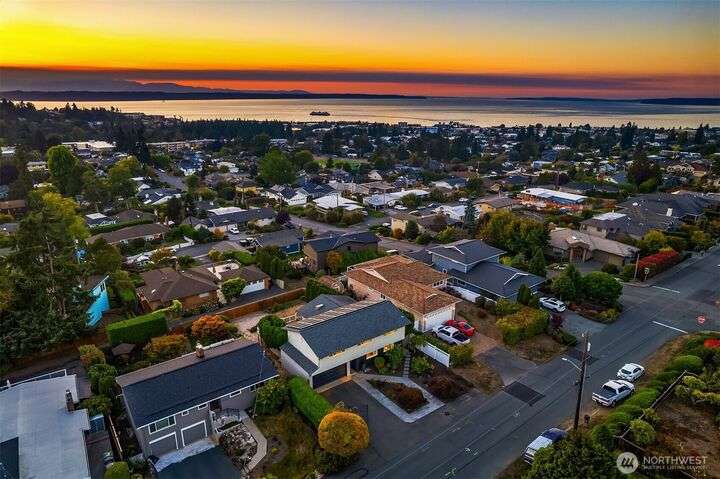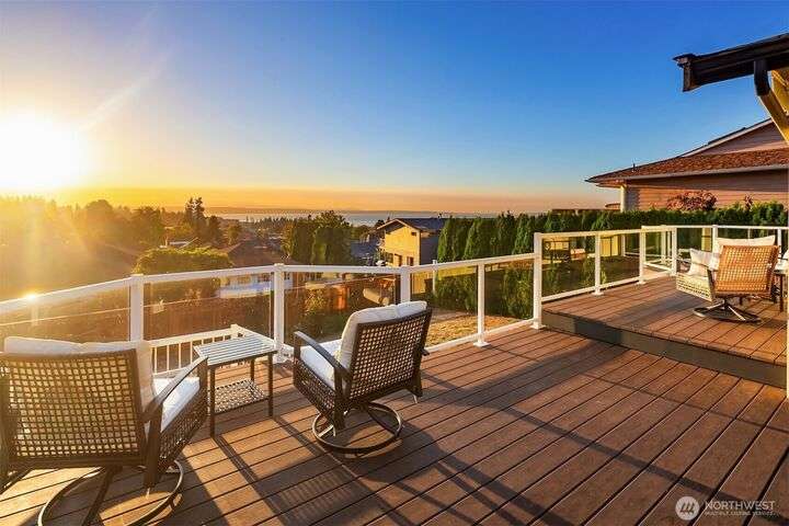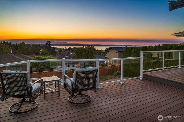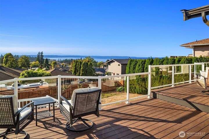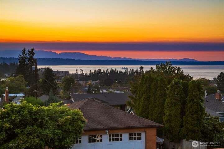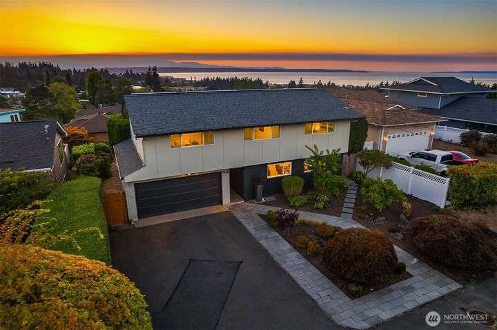 West-facing Puget Sound & Olympic views from this 5-bed mid-century home w/ updated contemporary finishes in the Edmonds Bowl. Open-plan great rm w/ soaring cathedral ceilings & exposed wood beams. Walls of windows frame sunset vistas. Sleek entertainer’s kitchen w/ large granite island, rich wood cabinetry offering abundant storage, all SS appliances & stylish lighting. Seamless indoor-outdoor living w/ expansive view deck w/ glass railing. 4-beds up, while main offers a 5th bed/flex space. Spacious lower-level bonus w/ views. Primary Suite w/ dual closets & ¾ en suite bath. Huge utility rm doubles as extra storage. Hot tub. Sustainable 9.6-kW solar array. Welcoming flagstone entry & mature landscaping. Alley access. 2-car detached garage.