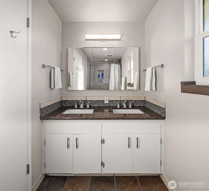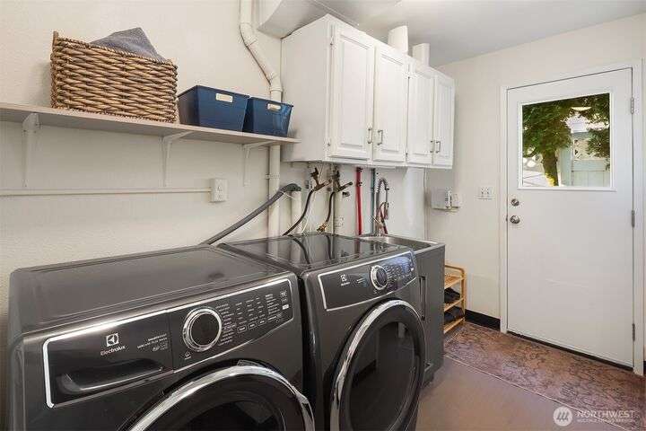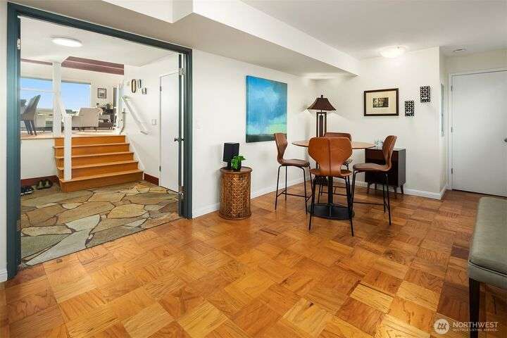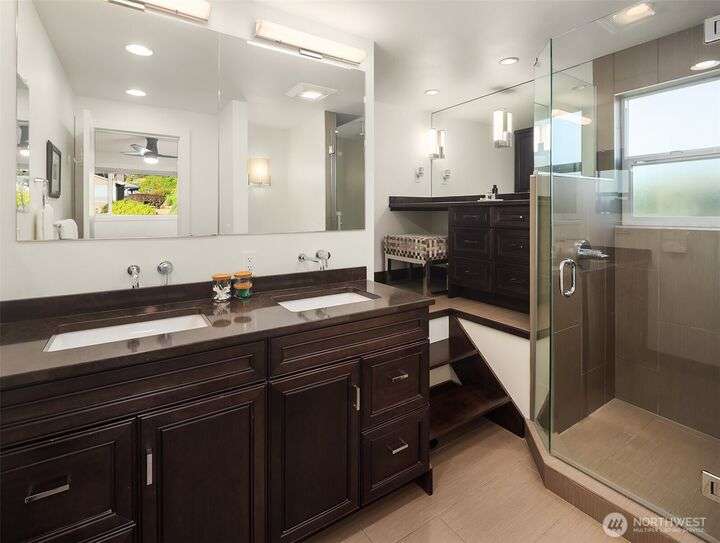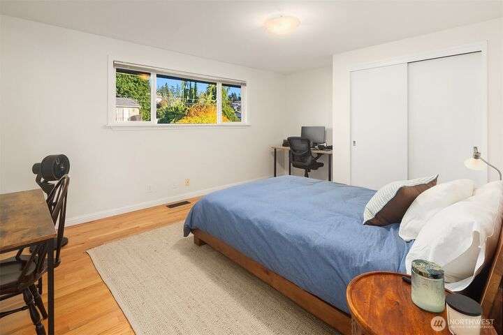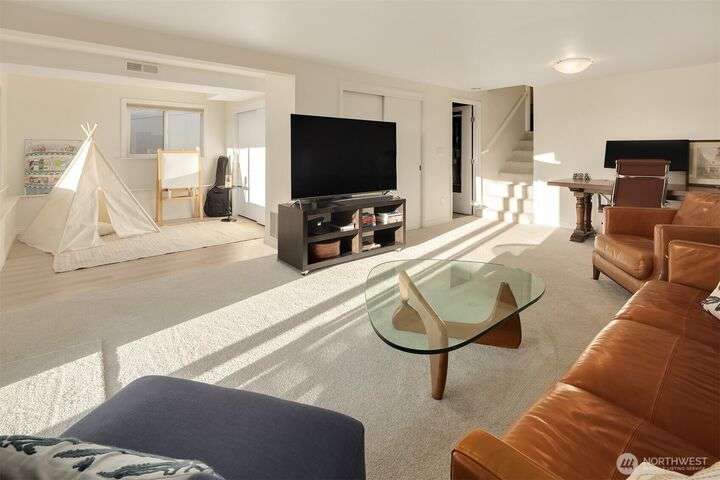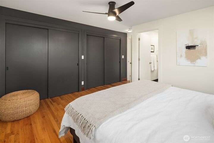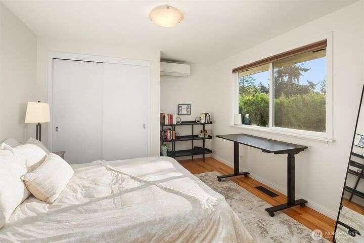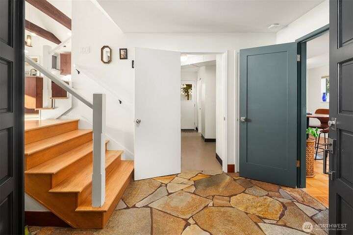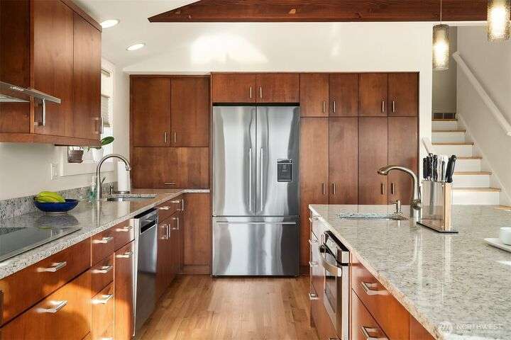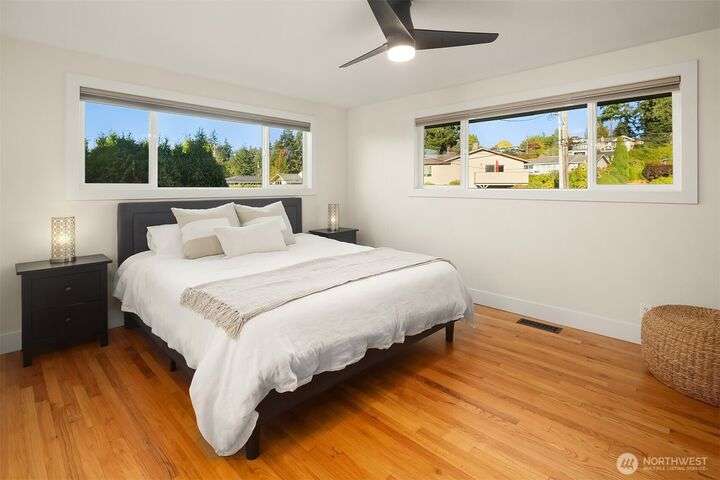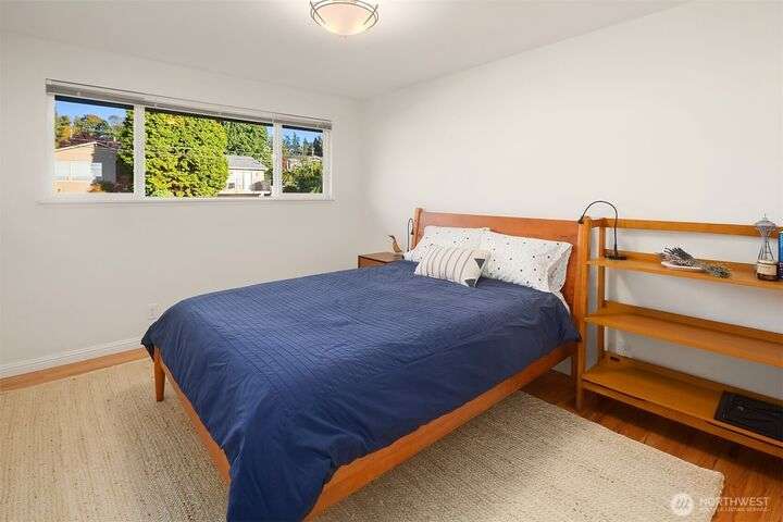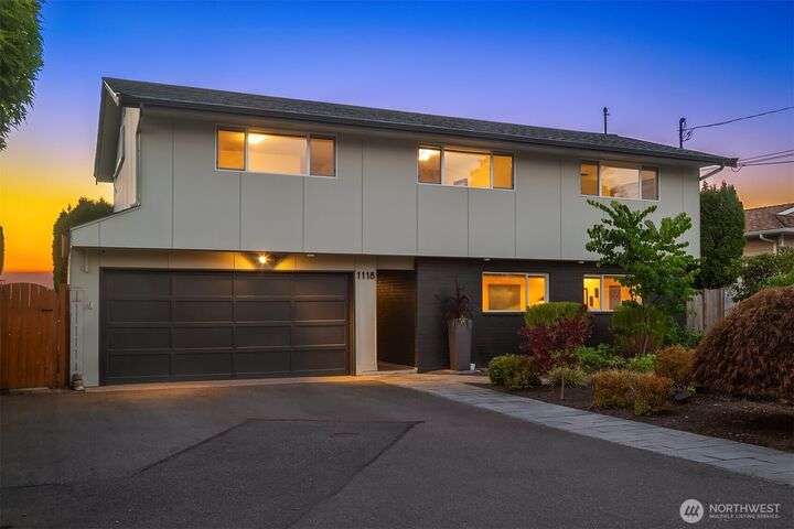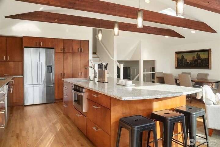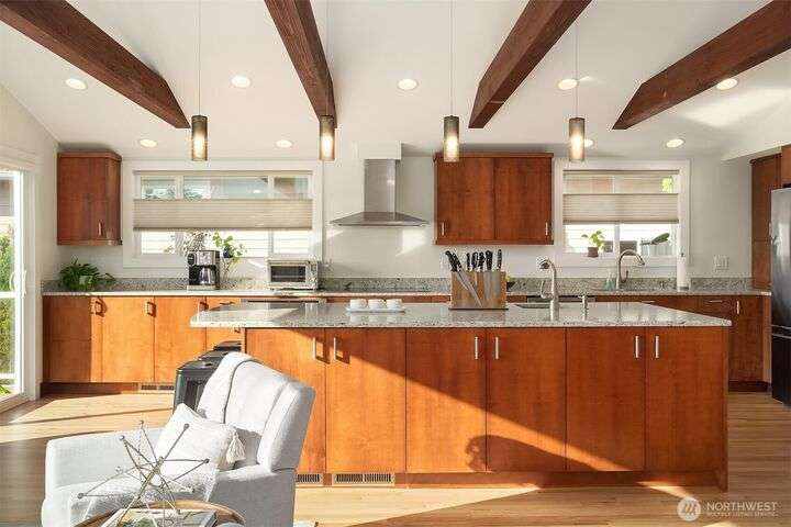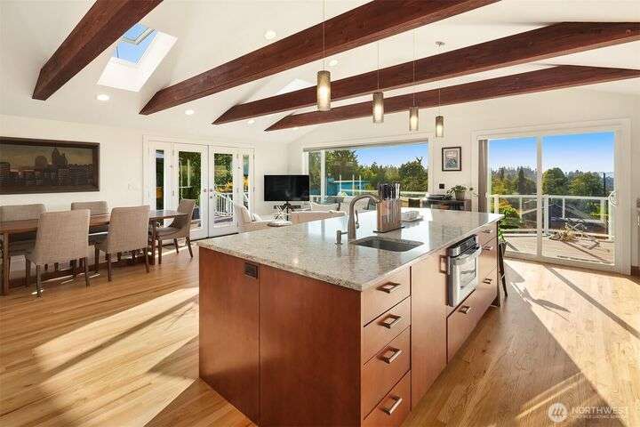 West-facing Puget Sound & Olympic views from this 5-bed mid-century home w/ updated contemporary finishes in the Edmonds Bowl. Open-plan great rm w/ soaring cathedral ceilings & exposed wood beams. Walls of windows frame sunset vistas. Sleek entertainer’s kitchen w/ large granite island, rich wood cabinetry offering abundant storage, all SS appliances & stylish lighting. Seamless indoor-outdoor living w/ expansive view deck w/ glass railing. 4-beds up, while main offers a 5th bed/flex space. Spacious lower-level bonus w/ views. Primary Suite w/ dual closets & ¾ en suite bath. Huge utility rm doubles as extra storage. Hot tub. Sustainable 9.6-kW solar array. Welcoming flagstone entry & mature landscaping. Alley access. 2-car detached garage.