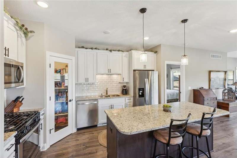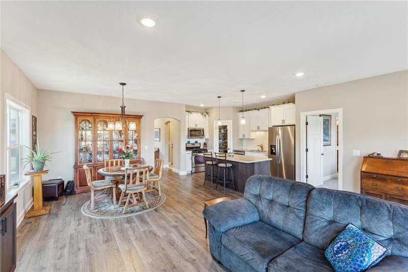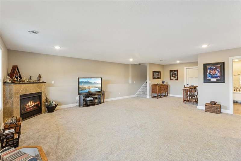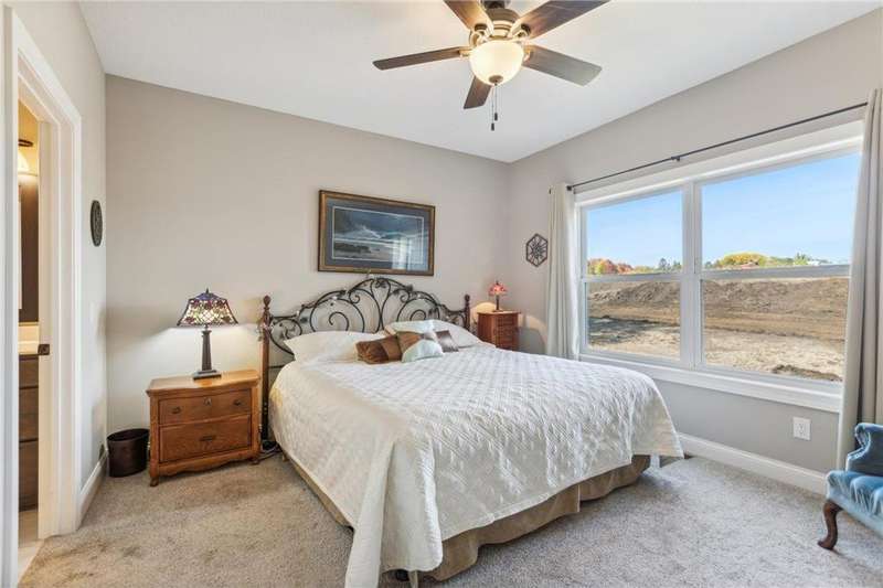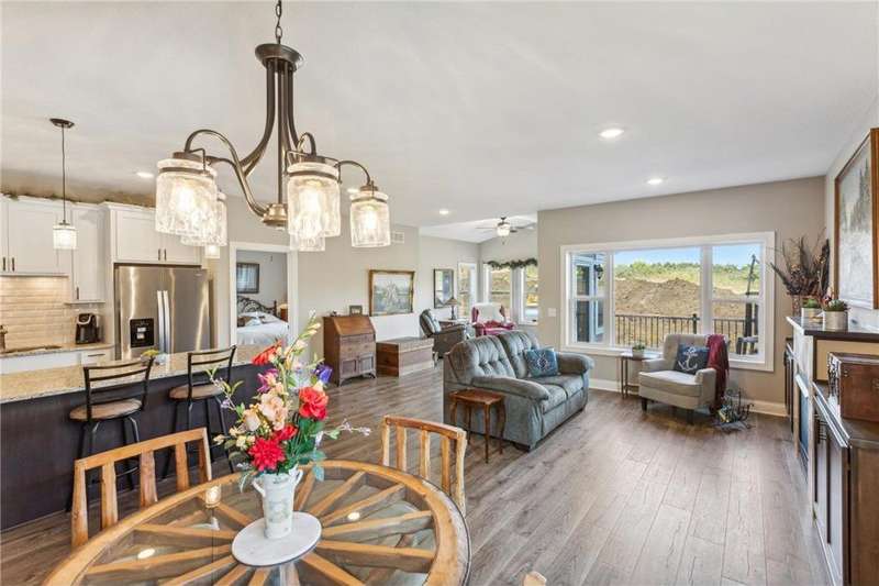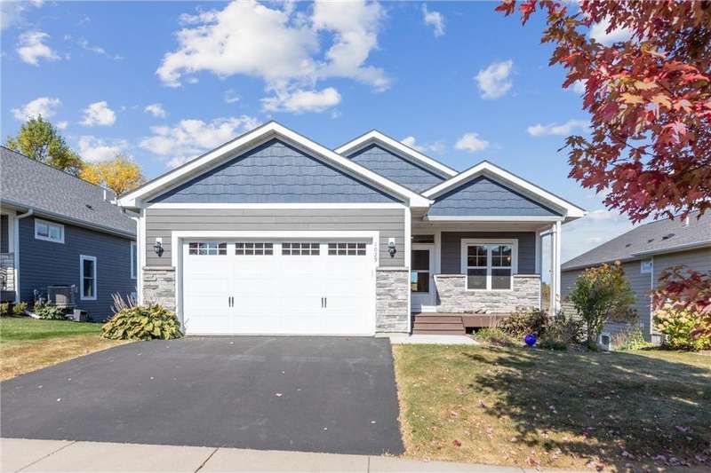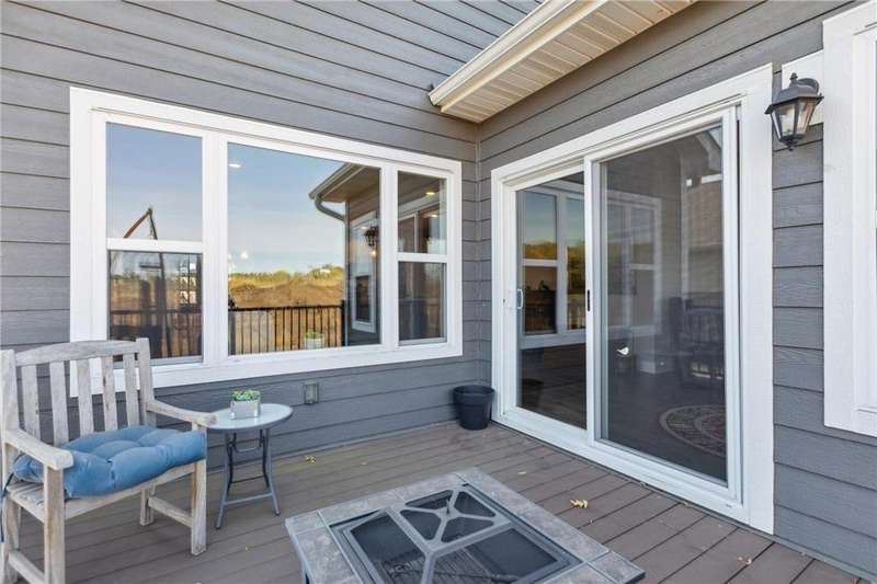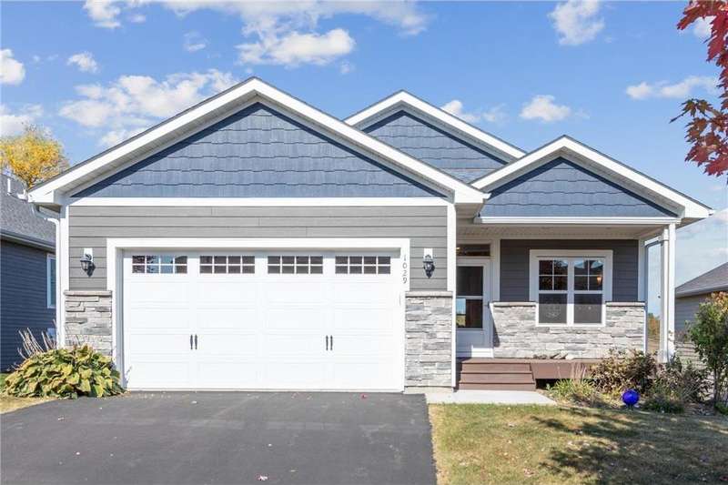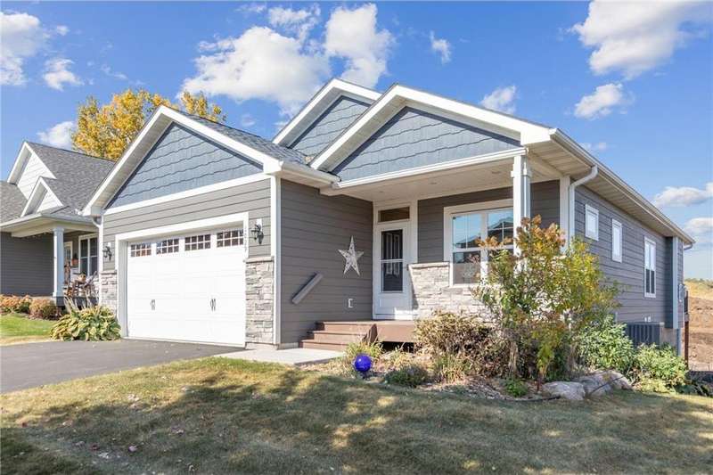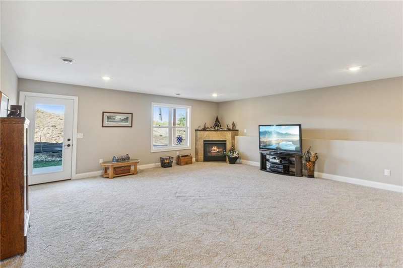 This beautifully designed walkout rambler offers a thoughtfully crafted layout, perfect for both everyday one level living and entertaining. The open-concept kitchen, living, and dining areas flow seamlessly into a bright and inviting sunroom, providing the perfect space to relax and unwind. Enjoy the gas fireplace on the main floor in the living room surrounded by gorgeous built ins. The luxurious primary suite boasts a walk-in tiled shower, an oversized walk-in closet with custom organization by Closets By Design, and convenient access to the laundry and mud room. A versatile main-level flex room offers endless possibilities as an office, den, or additional bedroom. The walkout lower level features a spacious family room with a second gas fireplace, two generously sized guest bedrooms, a full bath, and ample storage. Step outside and enjoy scenic walking trails winding through restored wetlands.