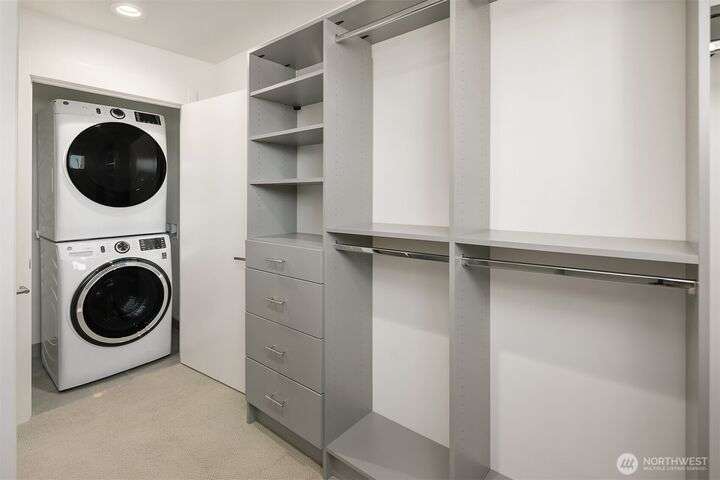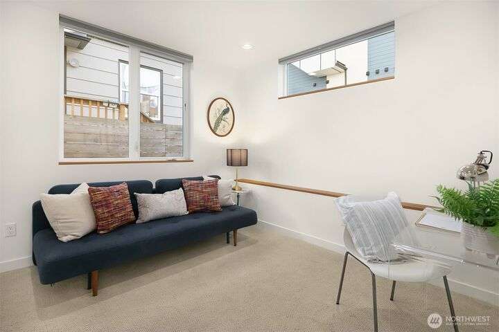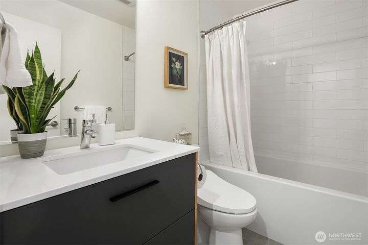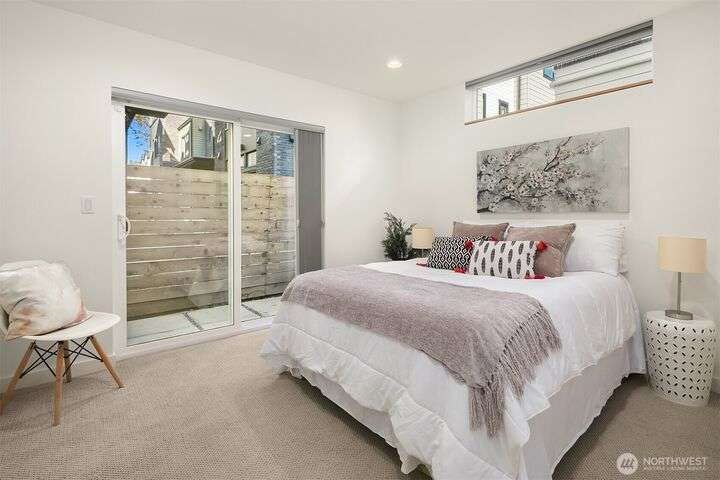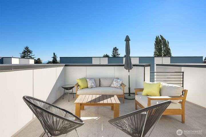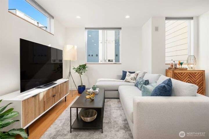 This stunning end unit modern townhome is better than new, with abundant natural light. Enjoy a gorgeous open kitchen featuring two-tone cabinets, quartz countertops & a stainless steel GE appliance package.The home includes three spacious bedrooms, with a luxurious primary suite that has a walk-in closet and washer/dryer (plus second hookup on lower level). Stylish bathrooms boast contemporary tile and fixtures. High-end finishes like solid hardwood floors and fresh interior paint enhance the space. An energy-efficient heat pump with air conditioning ensures year-round comfort. Relax on your expansive rooftop deck with views of Mount Rainier. 4- Star Built Green! Conveniently located near grocery, restaurants & transit—this is a must-see!