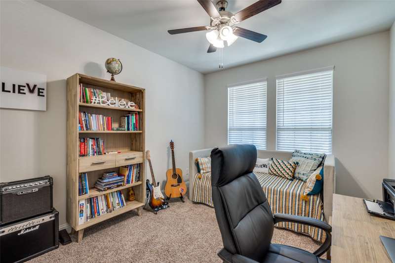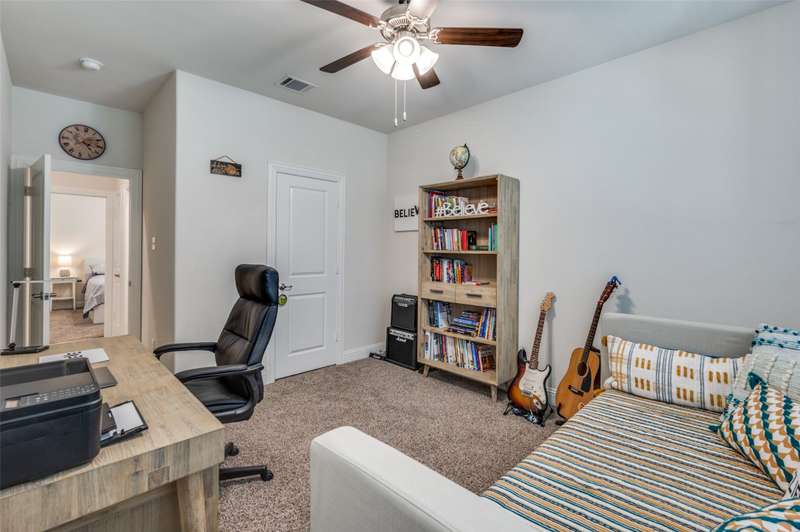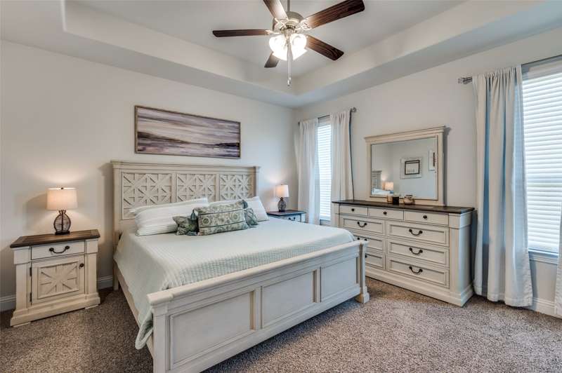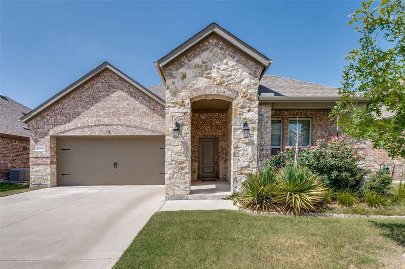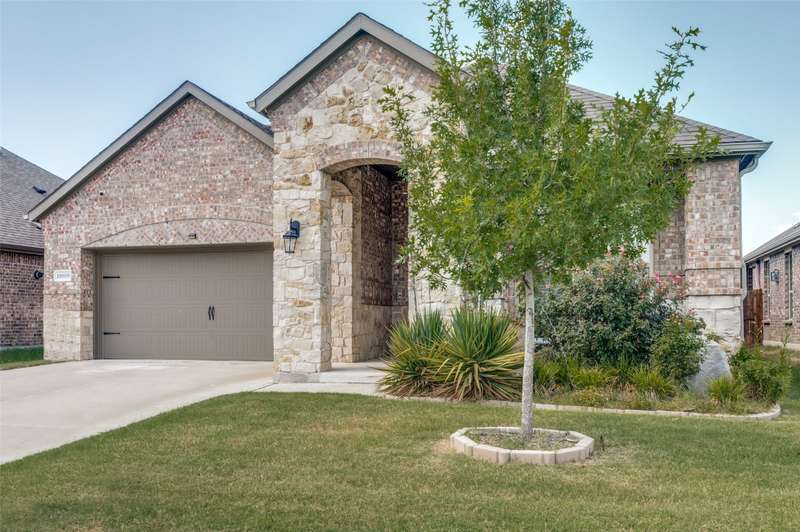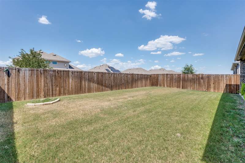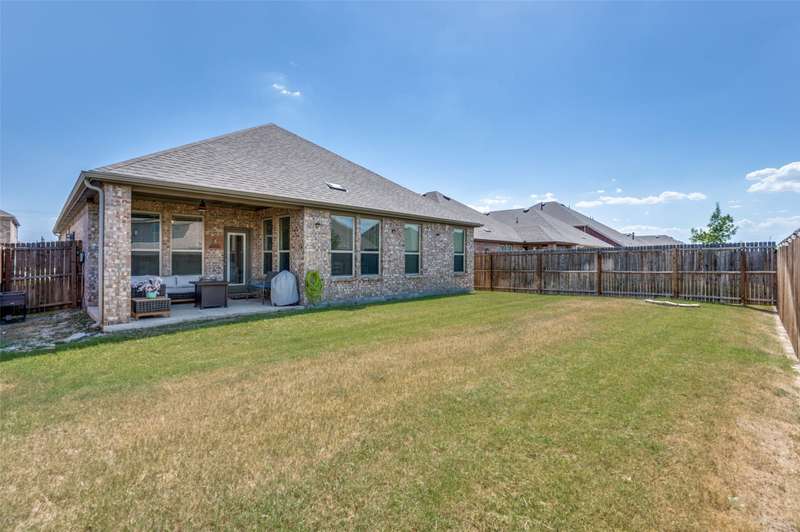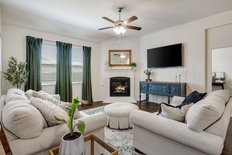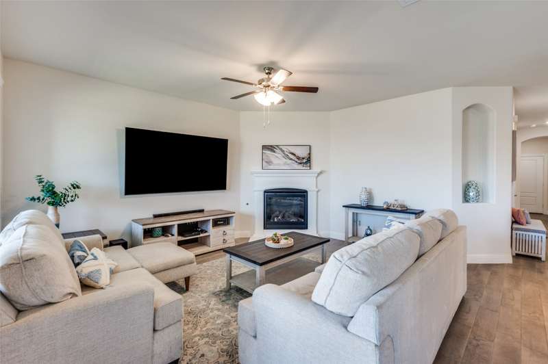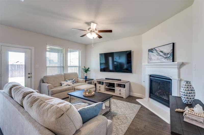 WOW Exceptional single-story home built in 2021 shows like a model, featuring a warm and inviting covered front porch sitting area, 3 spacious bedrooms, and 2 full baths. THE 85-INCH MOUNTED FLATSCREEN TV IN THE LIVING ROOM, REFRIGERATOR, WASHER, AND DRYER STAY. The entryway invites you into a dramatic hallway with tall ceilings that extend throughout the bright, spacious, and meticulously maintained home. The beautiful home boasts an open floor plan living room, dining room, and a beautiful kitchen with picturesque window views of the large backyard, and a covered patio with a stylish ceiling fan. Many upgrades and features include a smart home throughout, security system w-outdoor security camera and door camera, smart front door lock, outdoor electronic lights coordinated with music system, added attic insulation, tankless water heater, and so much more. The owner's suite is a haven with a large closet and direct access to a sizable laundry room. You are within walking distance to the Elementary School and the Silverado community amenities: pool, splash pad, playground, basketball, pickleball, tennis courts, clubhouse, scenic walking trails, green parks, and lake. The community is also conveniently located near shopping, dining, and recreational options.