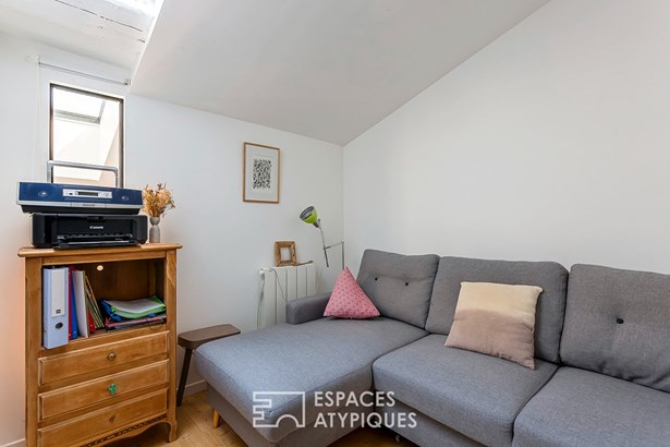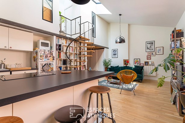 The entrance hall has been designed to store clothes and shoes and opens onto the living room. The kitchen with contemporary lines faces the living room, bright and with a beautiful high ceiling, it stands out like a conductor. The skylight in the roof gives this loft appearance a certain character. A dressing room and a bathroom complete this level. Wood and metal staircases lead to the two separate bedrooms, thus allowing a real tranquility of the sleeping area.