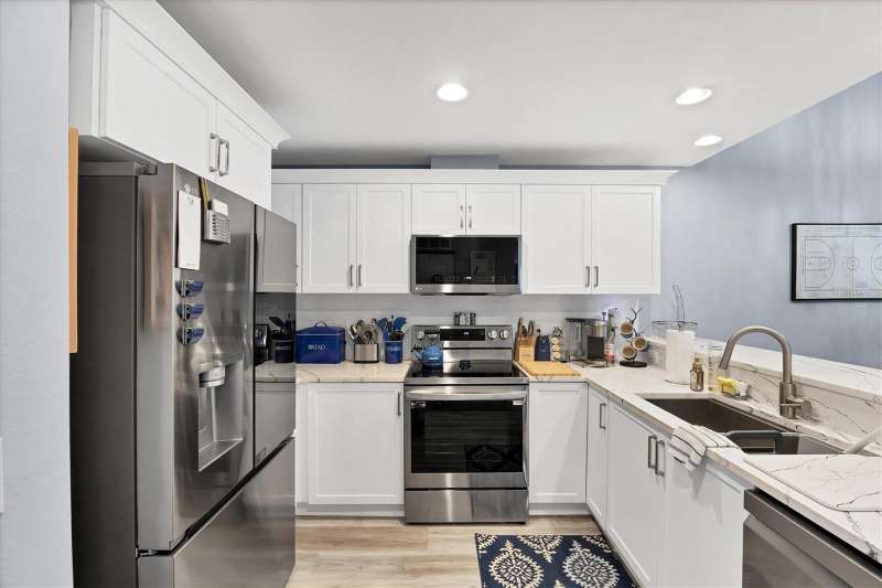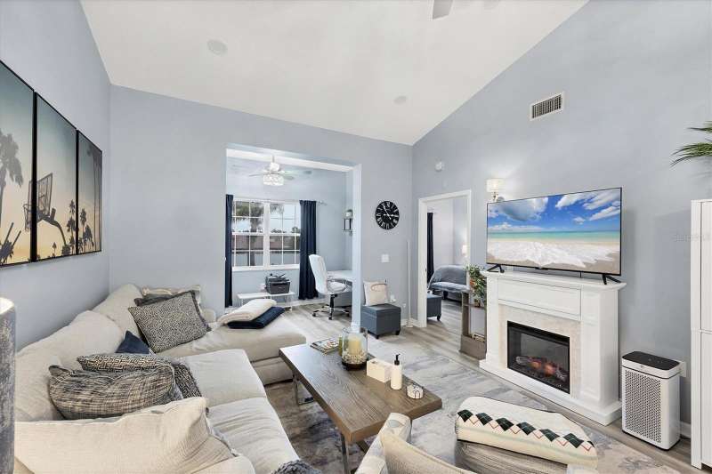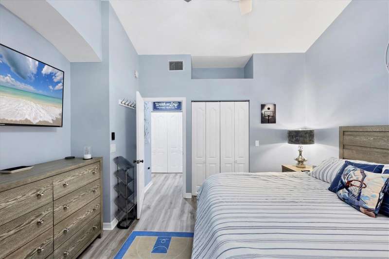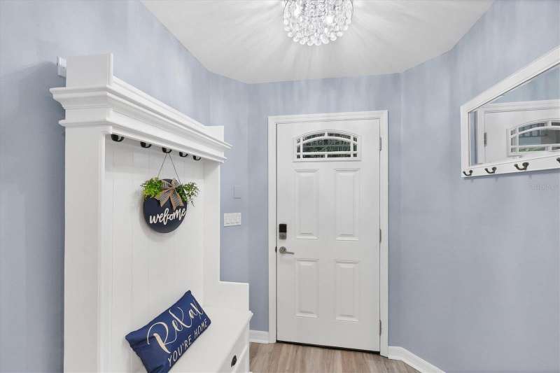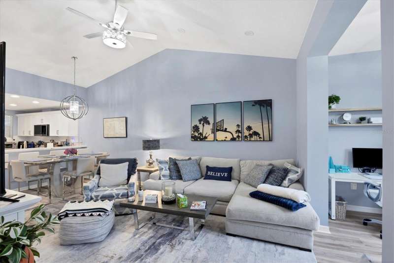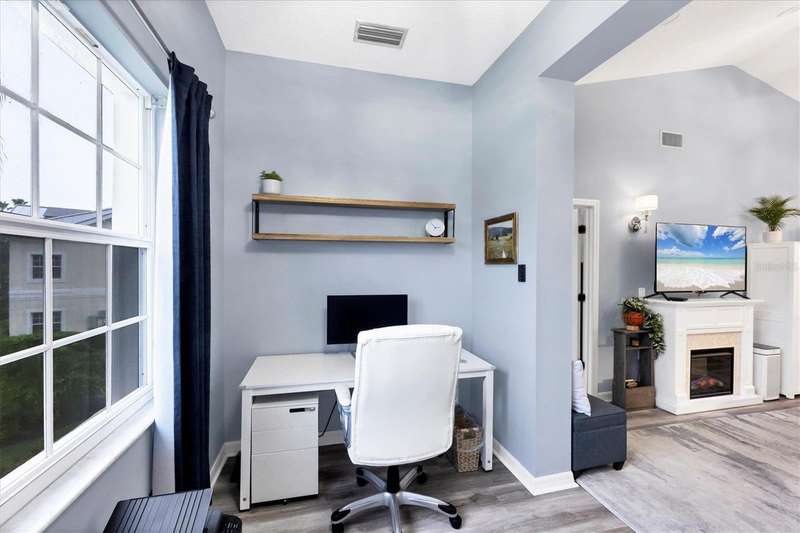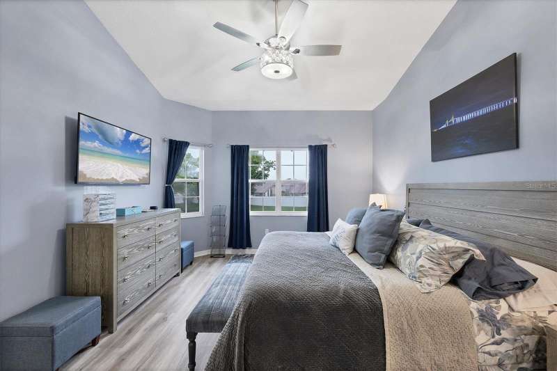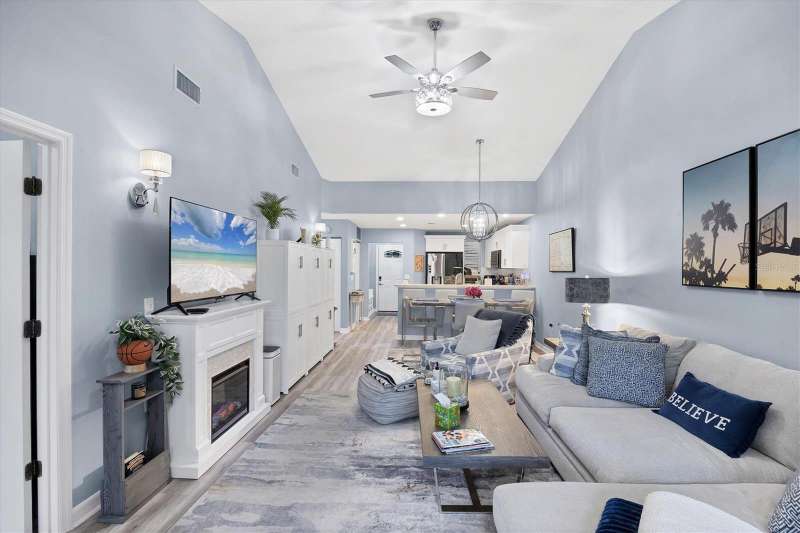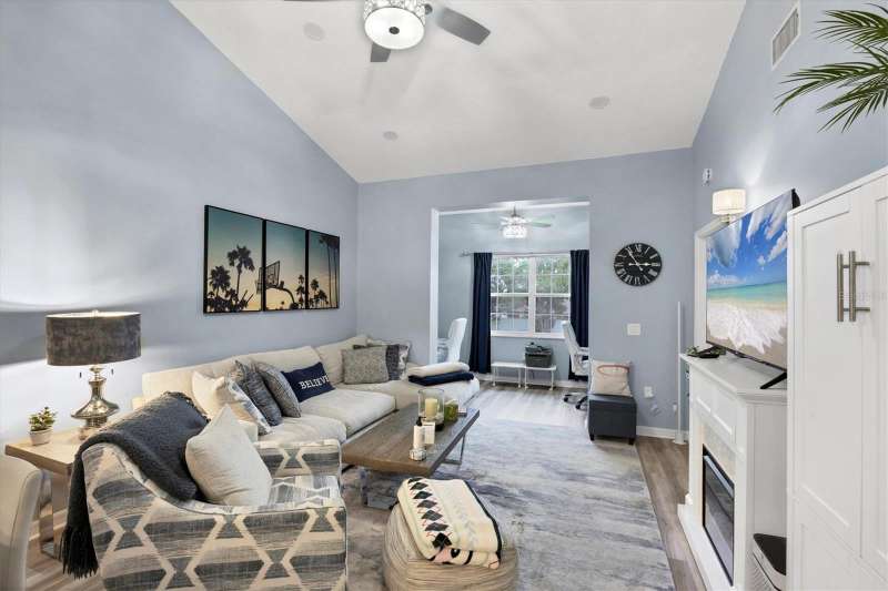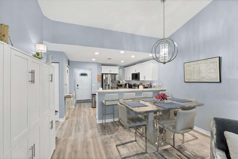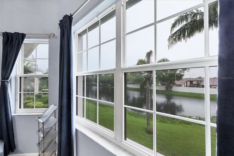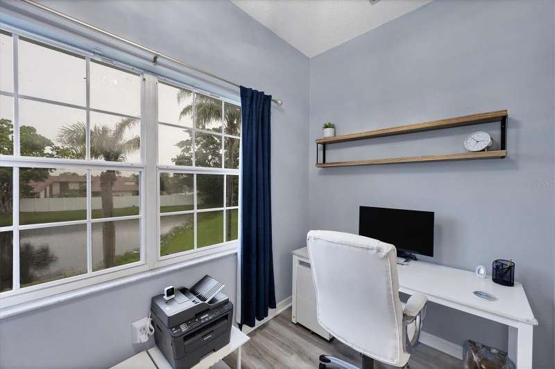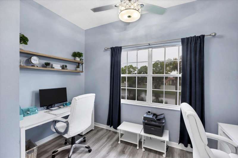 NOTHING COMES CLOSE to the extensive gorgeous renovation this villa underwent in 2023! New luxury vinyl flooring throughout, wood cabinets with soft close drawers, upgraded stainless steel appliances, farmhouse sink with new faucet, Quartz countertops with stone backsplash, LG washer dryer, bathrooms have wood cabinets, Quartz tops, subway tile showers, and smart mirrors with LED backlighting, all new light and fan fixtures, 2023 painted interior walls, and new TURNKEY FURNISHED move in ready ! Other features include sitting area t front entry, vaulted ceilings for great natural light and volume feel, back home office area with dual desks, and views from that space and primary bedroom overlooking the LAKE behind the building. Situated in the heart of the Bollettieri Resort Villas, a GATED community adjacent to the IMG Academy. Residents enjoy the heated pool and hot tub, fitness room, and flexibility to rent day 1 for 30 day minimum leases.