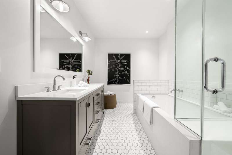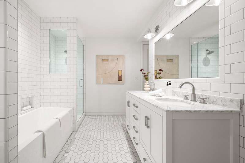 The third floor is comprised of two sunny well-proportioned bedrooms separated by a renovated tiled bathroom with a soaking tub, separate shower stall, double vanity, and a large walk-in closet.