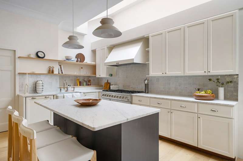 The original brownstone stoop leads though a vestibule into the elegant parlor with soaring ten and half ft ceilings. The graceful open living room, dining room and eat-in kitchen are bathed in sunlight from the tall south-facing windows over 11th street as well as a skylight to the north. The newly renovated open kitchen features top-of-the-line appliances, including a Sub-Zero refrigerator and freezer, dishwasher, 8-burner Forno range and hood, Wolf microwave, and custom cabinetry with marble countertops. A wood burning fireplace, new wide-plank white oak floors