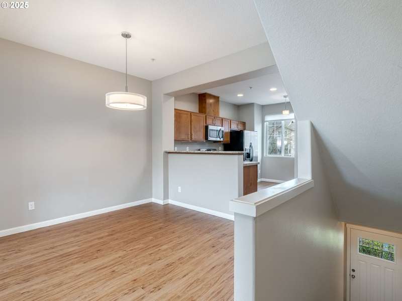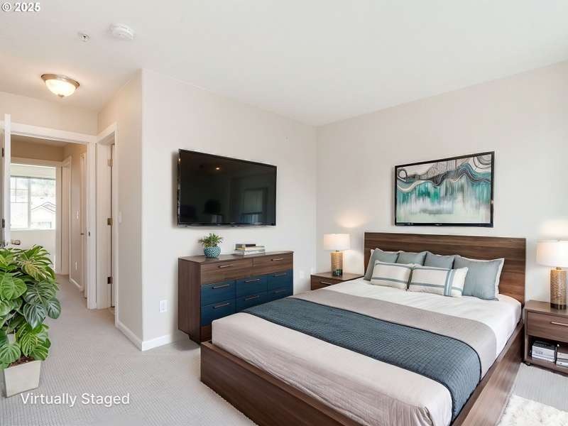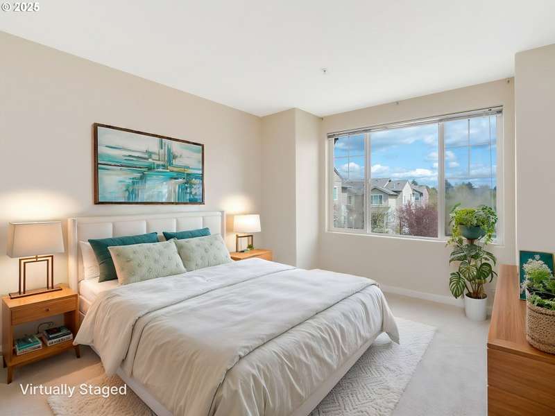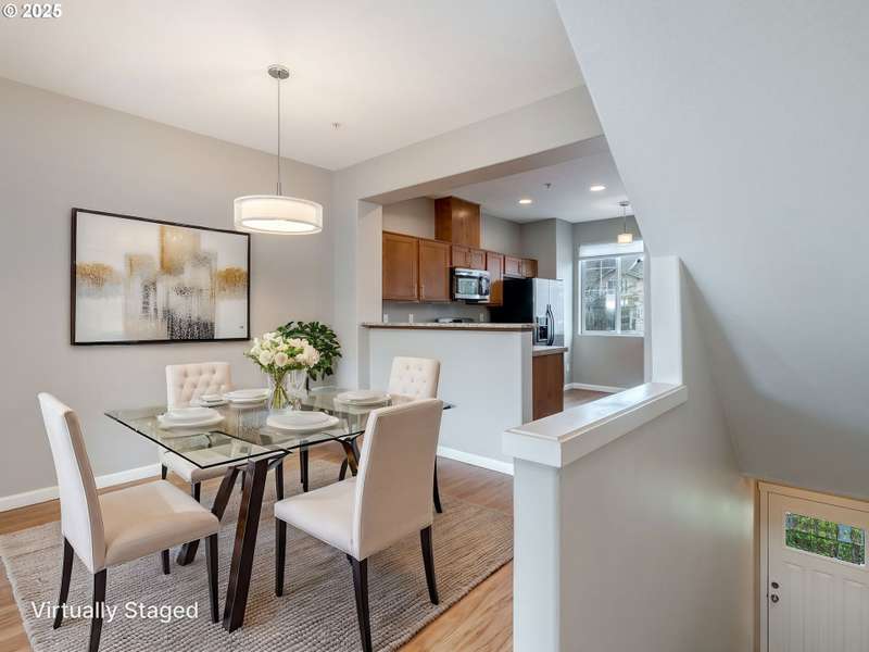 Modern comfort meets unbeatable convenience in this stylish townhouse at the Villas at Autumn Creek! This thoughtfully designed home offers two spacious bedrooms upstairs, including a primary suite with a custom closet organizer. The main level features an open-concept layout filled with natural light, a kitchen with sleek tile counters, a granite eating bar, and stainless steel gas appliances. Warm up by the fireplace in winter or stay cool with central A/C in summer, all while enjoying relaxed, everyday comfort. A private deck is perfect for morning coffee or unwinding with sunset views. The tandem two-car garage provides generous storage space, ideal for a home gym, workshop, or even a wine cellar. Just a short walk to the Willow Creek MAX station and close to Intel, Nike, PCC, and The Streets of Tanasbourne, the location also offers easy access to parks and major freeways. With water and exterior maintenance covered in the HOA dues, this move-in-ready home is a true standout.