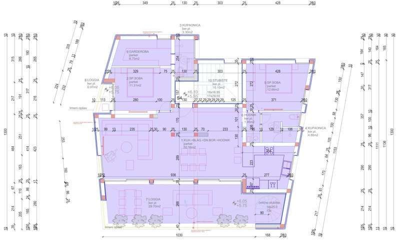 Apartment S4 is located on the 2nd floor of the building and consists of: entrance hall, two bedrooms (12.66 and 11.31 m2), two bathrooms, dressing room + sauna, living room, kitchen and dining room, hallway, two loggias ( 29.70 m2 and 0.97 m2), roof terraces with jacuzzi (145.81 m2), storage rooms 8 in the basement (21.14 m2) and two outdoor parking spaces, total net accounting area 166.83 m2.