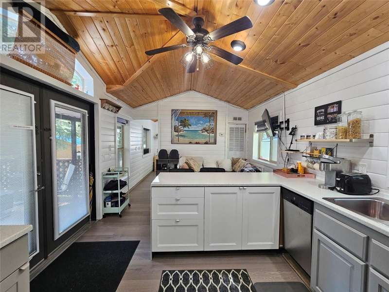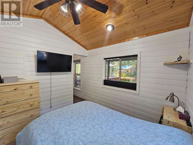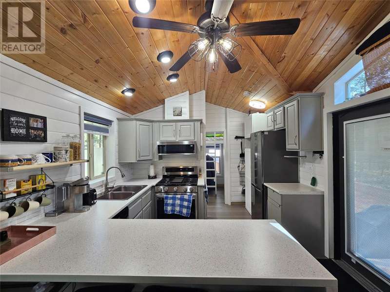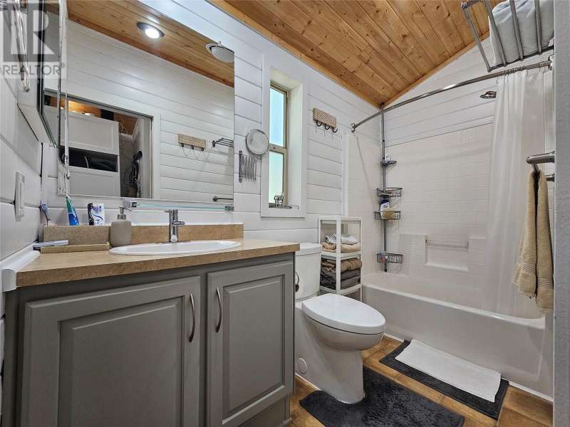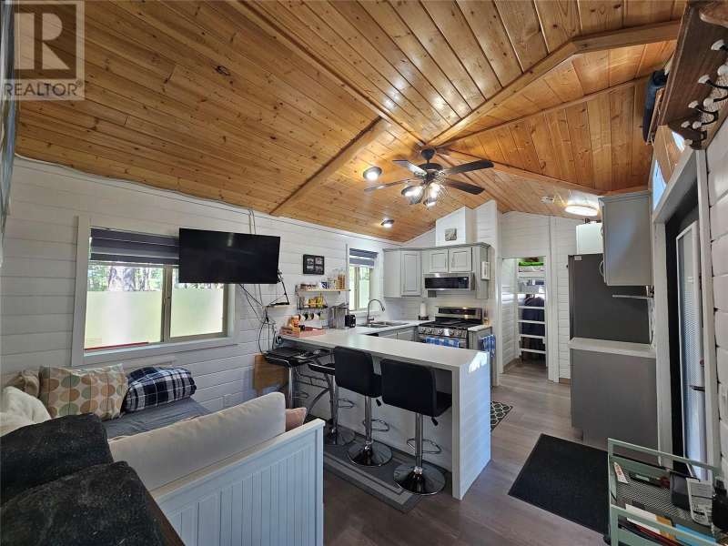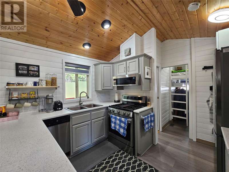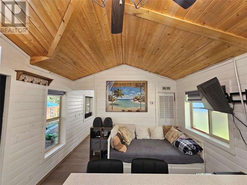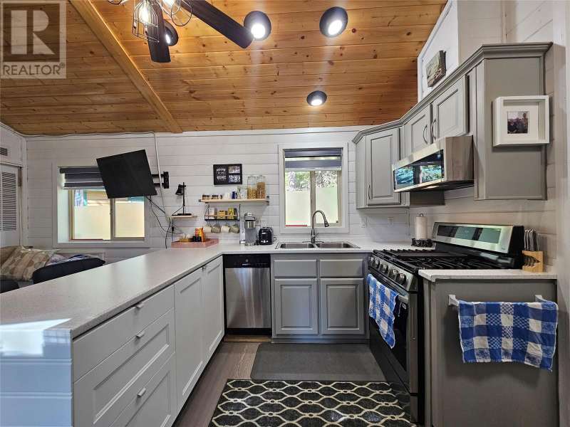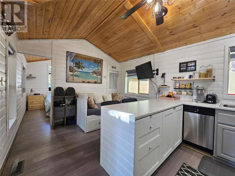 This charming 2-bedroom cottage is tucked away in a peaceful, forested resort community in upper Peachland's Trepanier Bench. Perfect for outdoor enthusiasts, it’s just minutes from Okanagan Lake, hiking, golfing, shopping, and more. Fully renovated in 2024, including the electrical and plumbing, this unit features a vaulted-ceiling primary bedroom with large windows and a second bedroom with a bunk style bed. The kitchen offers new stainless steel appliances including a gas range, microwave, and dishwasher. A new in-suite washer adds convenience. The cozy living room includes a pull-out sofa bed, and French doors leading to a private deck with sun and shade for relaxing or entertaining. The unit includes a storage shed, renovated in 2024, that could be insulated and finished to be converted into an additional camping style bedroom. Fully skirted and insulated, the home is ready for year-round use, with rodent protection and easy winterization as well as natural gas hookups. Powered by a 50-amp service, wired for cable, phone, and internet, and includes A/C. There is parking for three vehicles, and optional resort mailbox service. With access to a private community pool that will be constructed new May 2026, and set on 10 acres of natural beauty, this cabin offers the ideal blend of comfort, convenience, and outdoor adventure. Perfect as a vacation getaway, year-round home, or investment property. (id:58403)