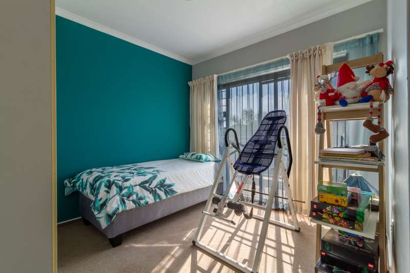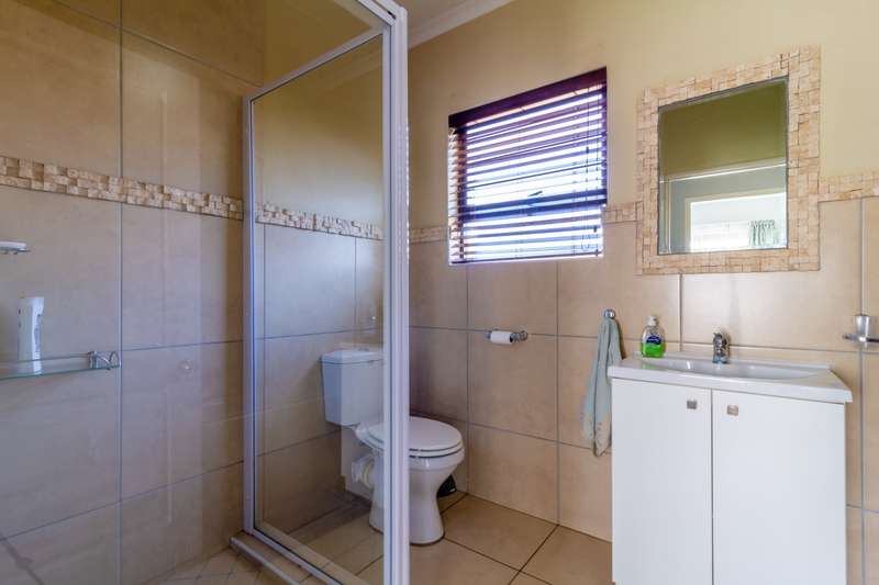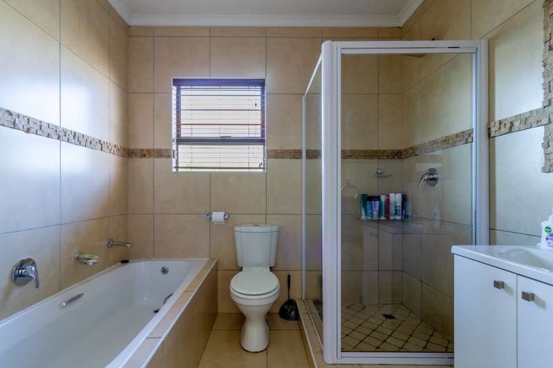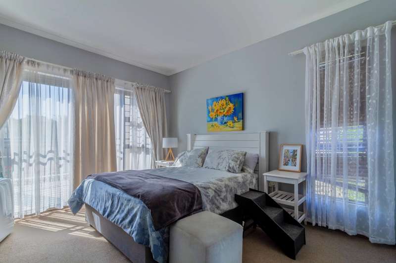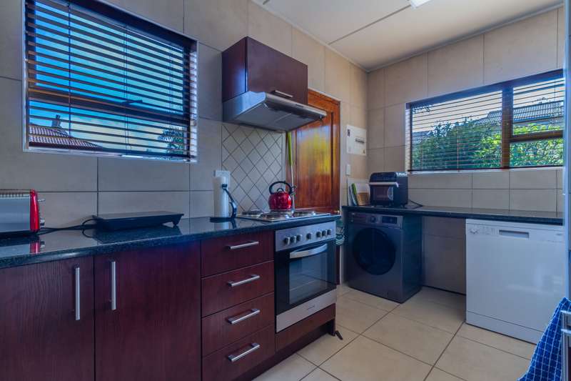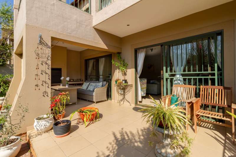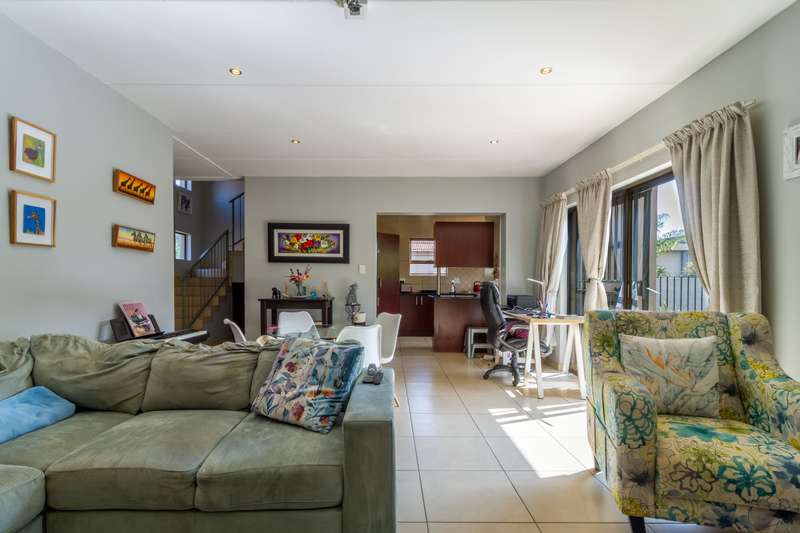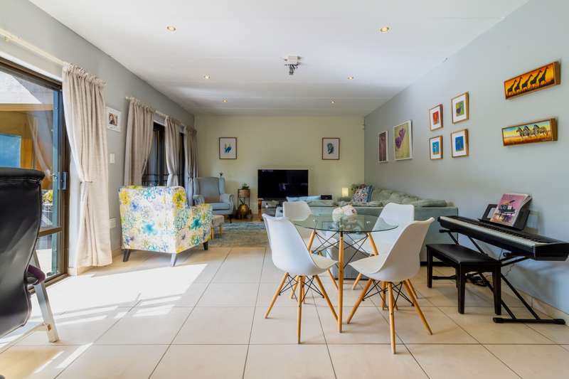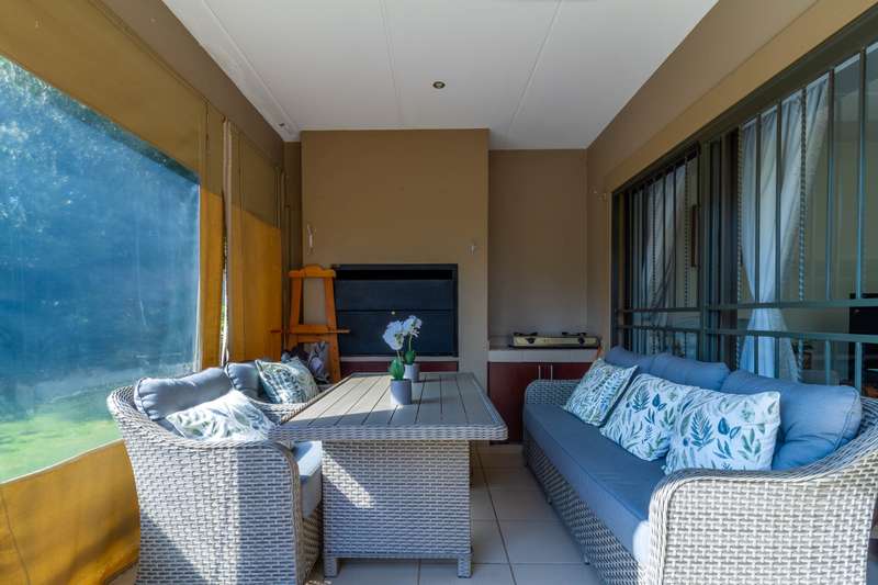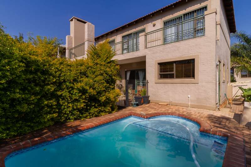 The property is a double-storey townhouse with own garden and pool. Ground floor is kitchen with built-in cupboards with granite tops, space for two appliances, open plan living and dining area and guest toilet. All the bedrooms are located on the first floor with built-in cupboards. Main bedroom with own balcony . The main bedroom has own full bathroom and his and her closet. The guest bathroom has a shower and tub. Double automated garage doors undercover carport and paved driveway. Nice size garden, patio with built-in braai and splash pool. Electricity operates on prepaid meter system. Solar power back-up system. 24hrs Security at the gate. Easy access to N14 highway and Cradle stone mall.