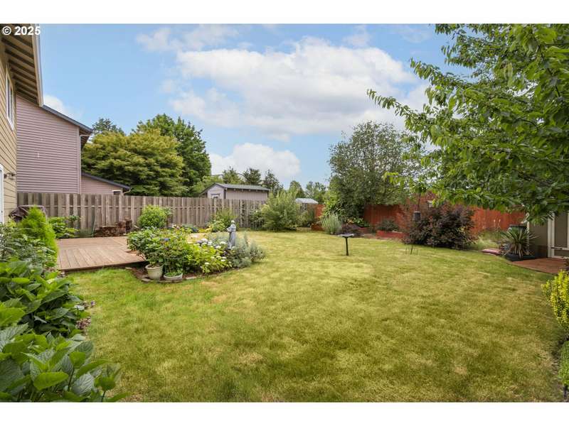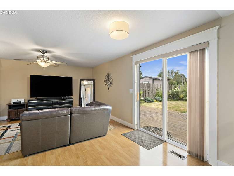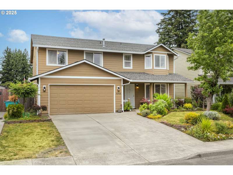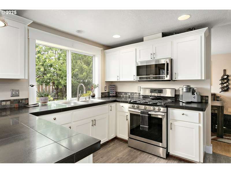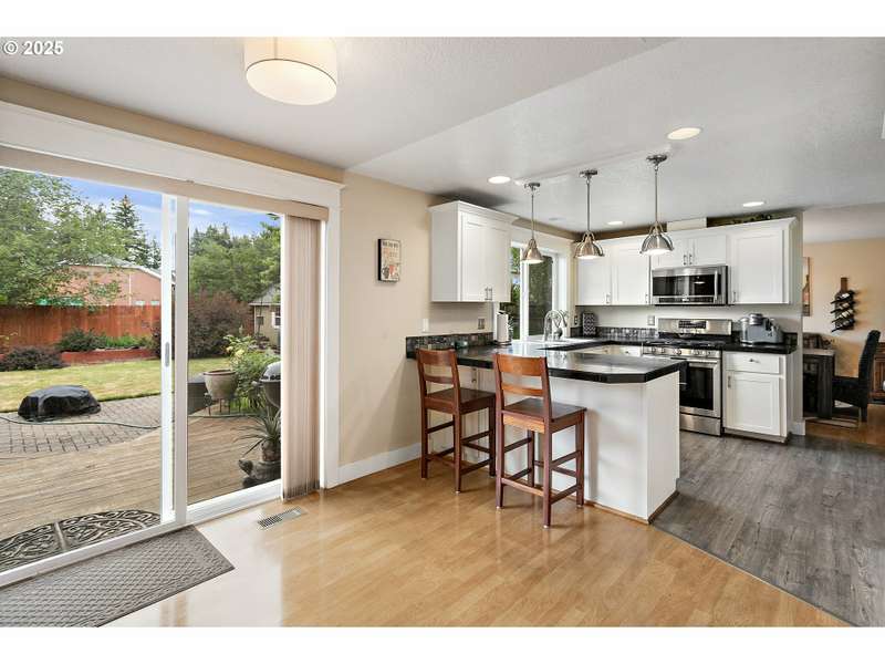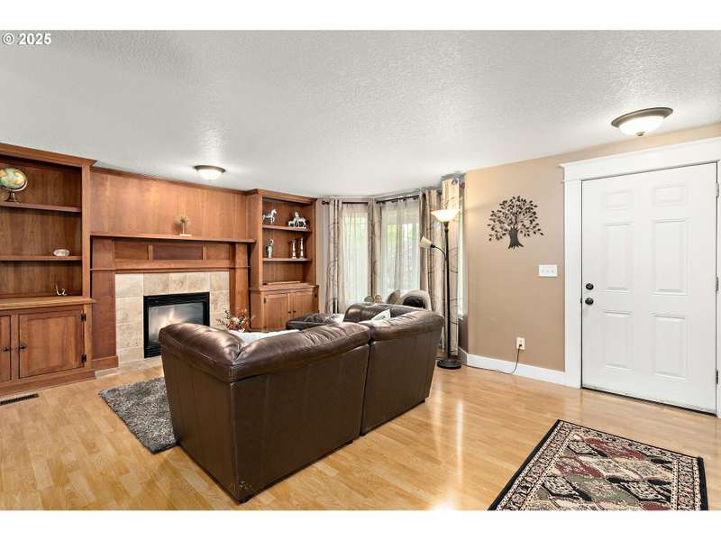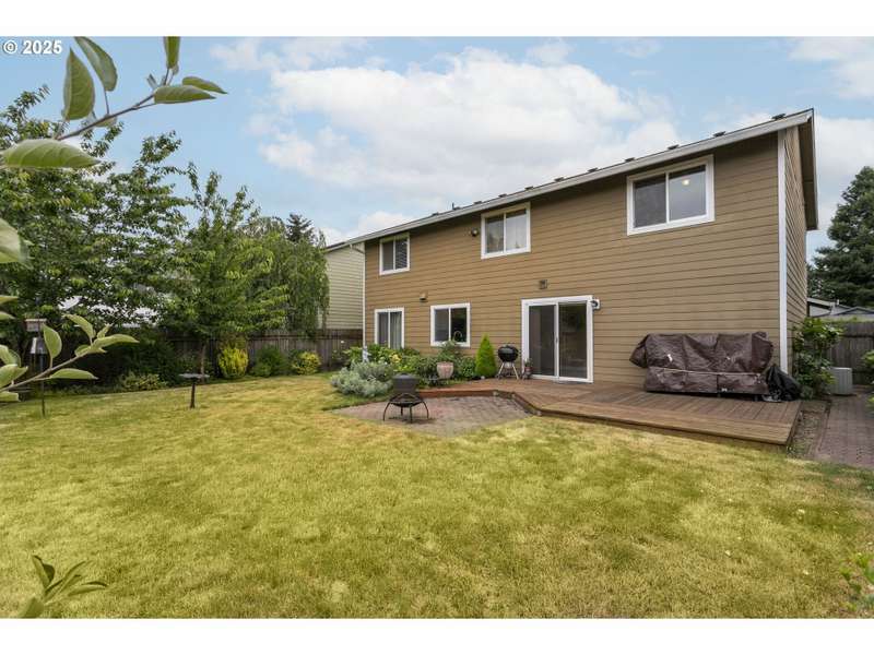NEW PRICE REDUCTION! Welcome home to this rare 5-bedroom, 3-bathroom gem in the desirable Edwards Manor! As you step inside, you'll be greeted by a spacious living room featuring a cozy gas fireplace, a charming bay window, and custom walnut-finished built-in cabinets. The main level boasts durable laminate and LVP flooring throughout.The kitchen is a chef's dream, complete with slate tile countertops, a gas range, stainless steel appliances, and a convenient pantry. You'll also appreciate the newly added walk-in shower in the 3/4 bathroom on the main floor.The luxurious primary bedroom offers engineered hardwood floors, a bay window, a walk-in closet, and a private bathroom with a beautifully tiled walk-in shower.Upstairs, the large 5th bedroom provides versatile space, ideal for use as a second primary suite, a bonus room, or a theater room. Step outside to your expansive and private backyard oasis, perfect for entertaining or relaxing. Enjoy a large deck, pavered areas, fruit trees, rose bushes, raised garden beds, and a shed for extra storage. With a partial view of Mt. Hood from the upper level, the outdoors is truly an extension of your living space. Stay cool with central A/C. Located in the Union High School district, this home is just minutes away from local shops, restaurants, and the scenic 56-acre Pacific Park. No HOA.