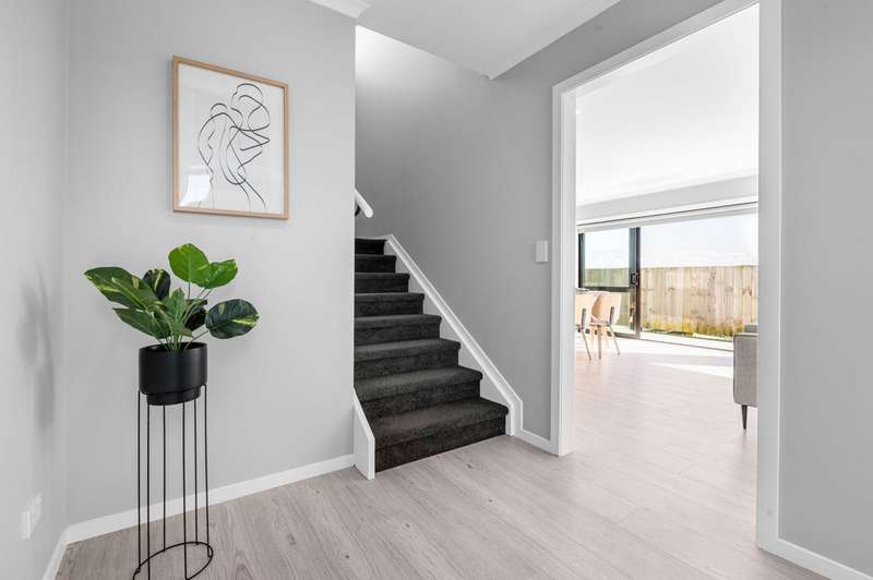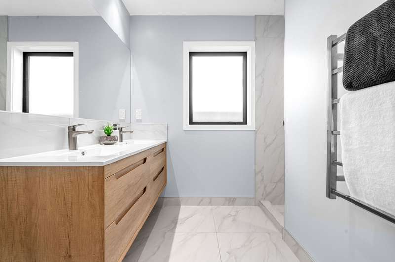 Upstairs is home to the magnificent master suite, where natural light pours in. Enjoy the luxury of a tiled ensuite with dual sinks, plus a generous walk-in wardrobe with ample storage. The remaining two spacious bedrooms share the third bathroom, providing plenty of space for the whole family. Downstairs, you'll also find a well-designed bedroom area with immediate access to a bathroom, making it ideal for teenagers, extended family, or overnight guests.
