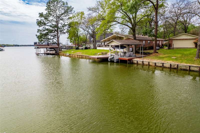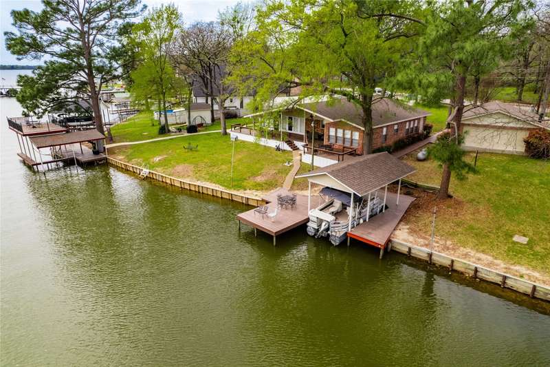 PRICED TO SELL! Sip your morning coffee from the large open lakeside deck of this 5-bedroom, 2-bath lake home. With over 189 feet of water frontage, two boat houses, and breathtaking open water views, this property is a lake lovers dream. Located on a protected channel offering more protection while being just moments from the action. The spacious .32-acre lot provides ample room for outdoor entertaining, and the 2-car garage with epoxy floors can even be converted into additional sleeping or living space. There is an additional dock to fish or to simply relax. Short-term rental friendly, this home offers endless possibilities whether as a full time residence, vacation retreat, or income-producing property. Conveniently located near shopping, dining, and just one hour from Dallas! Don't miss this incredible opportunity! Many recent upgrades including a new roof in 2023, seawall work done in 2024 and recent repairs to boathouse and dock.