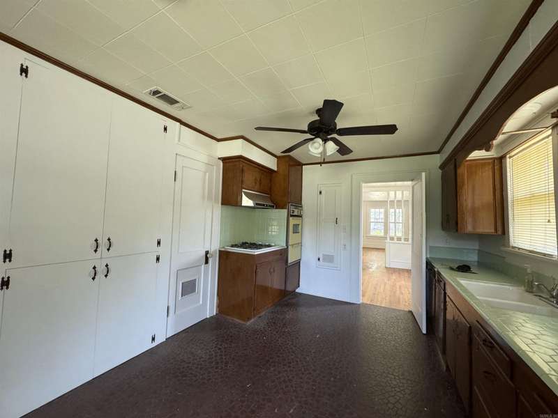 Charm from time gone by, 3-bedroom, 1.5 bath brick home on a corner lot. Original hardwood floors add warmth and character throughout. The retro kitchen offers vintage charm and leads into a cozy dining area featuring a unique mid-century light fixture. The living area is bright and inviting with large windows and great lighting. All bedrooms are good size with good size closets. Middle room offers a fireplace, could be used for bedroom or for den/study. The home includes a one-car carport, additional driveway parking and a convenient laundry area. Outside, enjoy a manageable yard with mature trees and established landscaping. Solid construction, timeless appeal and loads of potential-perfect for first-time buyers, downsizers, or anyone who appreciates classic style. Located close to schools and downtown shopping. 30 minutes from Hot Spring National Park.