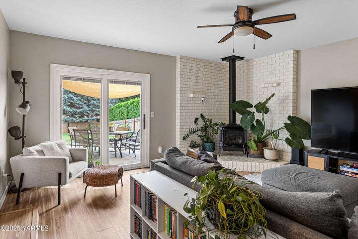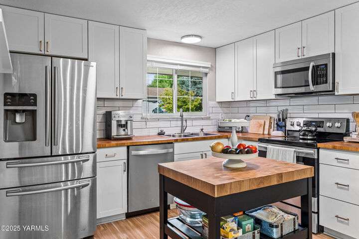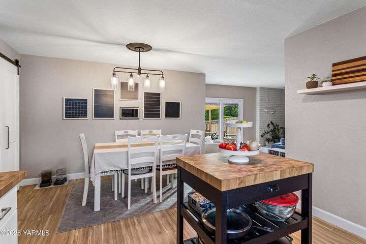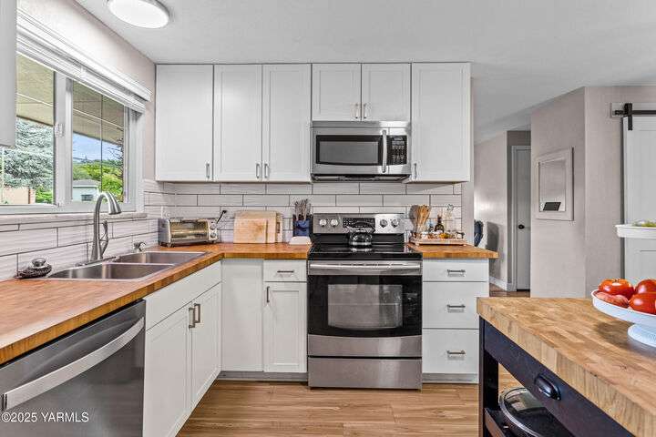 This one level home is boasting with brilliant updates and charm throughout! This 3BR/2BA home has been cared for inside and out. From the moment you step inside you are greeting by a large living space (currently used as a home office) that adjoins the kitchen featuring butcher block countertops and matching island. Beautiful tile backspace and stainless steel appliances are among the upgrades to this space along with a pantry barn door. Just beyond the kitchen step down into an additional living space that is perfect for gatherings, guests, movie night, and memories. From here access to the backyard entertaining space is just outside the door to your backyard retreat-where there is even more space for entertaining, fun, and a sweet spot for the pups. This wonderful floorplan has all bedrooms on the opposite side of the home and each are spacious with thoughtful closet inserts to make the most of the storage space. Primary bedroom features french doors leading to the outside and an updated ensuite bath with tile backsplash and tile flooring. Additional features include vinyl windows, fully fenced backyard, two car garage, and a washer/dryer area with a brilliant option for access and disguise. This is a must see in a highly desirable area located within the West Valley school district and minutes from other amenities that include groceries, Starbucks, health care, and dining, to name a few! Come explore Marian Estates and see why you'll wanna stay!