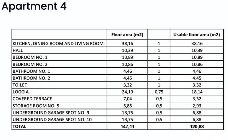 Apartment S-4 - 1st floor - living area 82.53 m2 (2 bedrooms + 2 bathrooms + WC) + loggia (24 m2) + covered terrace (7 m2) + storage (5.85 m2) + two garage parking spaces no. 9 and 10; net calculated area 120.88 m2 = 1,003,200.25 EUR