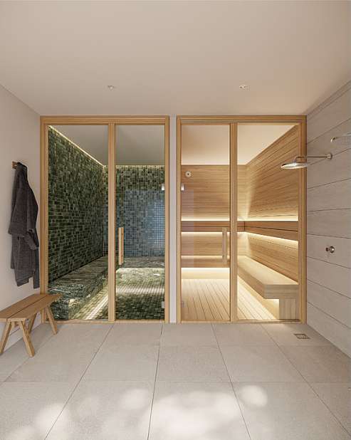 The complex provides a wide range of communal amenities such as outdoor swimming pools, a fully equipped gym, traditional sauna and hammam, co-working spaces, and even a golf simulator. It is an excellent option for both comfortable living and long-term value.