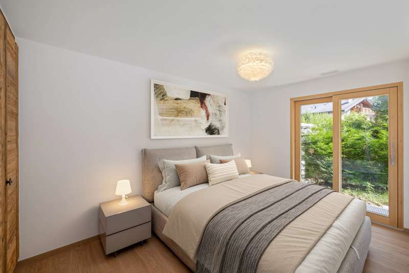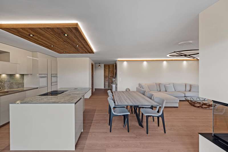 THE RESIDENCE Situated in a peaceful hamlet, imbued with tranquility and privacy, the "Master A&B" residence enjoys an ideal location on the edge of Crans-Montana's prestigious Severiano Ballesteros golf course. This residence offers all the comforts of mountain living. Set on a 3368 m² plot, the residence comprises a contemporary chalet housing five luxury apartments. The residence's co-owners also have access to the spa located in the building for pleasant moments of relaxation. THE APARTMENT Welcome to this luxury apartment with a generous 133 m² of living space, offering both luxury and functionality. As soon as you enter, you'll discover a vast living area featuring a cosy lounge with fireplace, an open kitchen and a spacious dining room. Two bedrooms each have en-suite bathrooms, while a third bedroom with built-in closets completes the night space, guaranteeing comfort and privacy for all occupants. A guest toilet adds a practical touch to the layout. The centerpiece of this apartment is undoubtedly the large terrace and private garden. In the basement, an indoor parking space provides convenient access, and the cellar offers additional storage space.