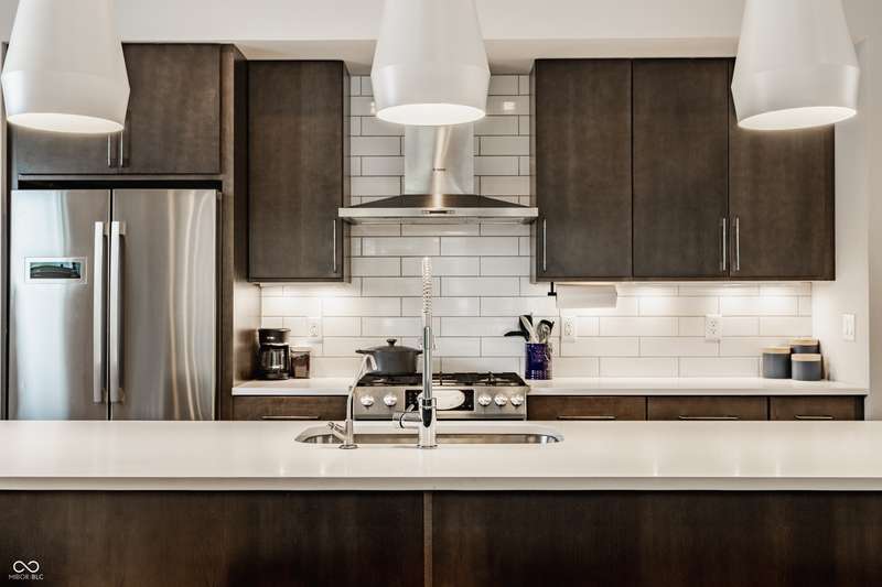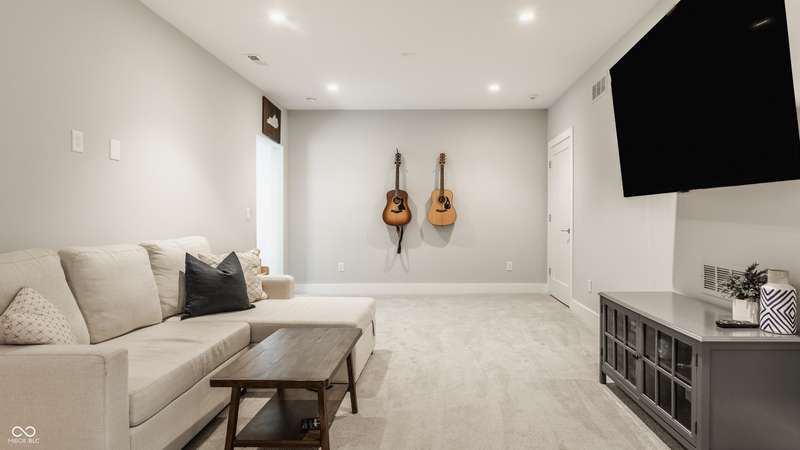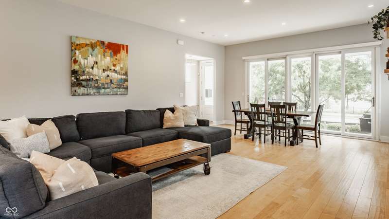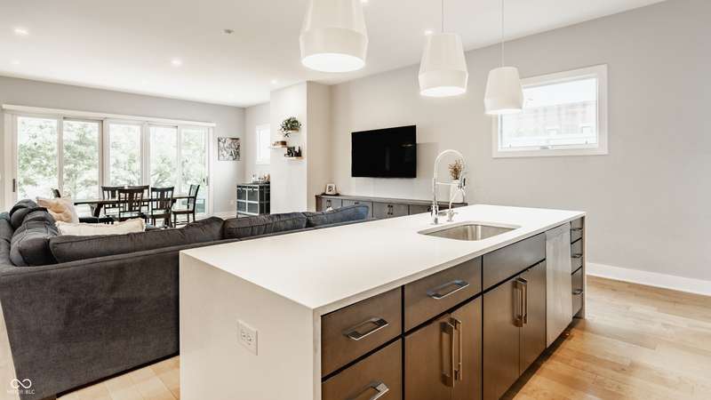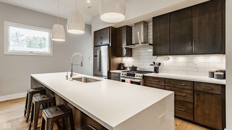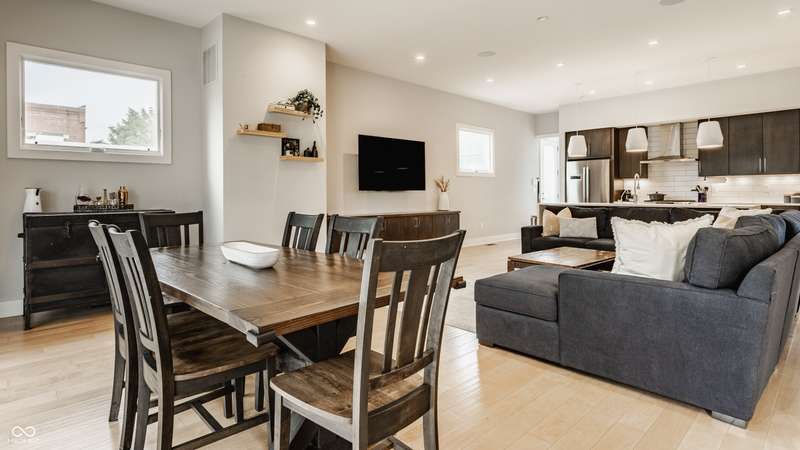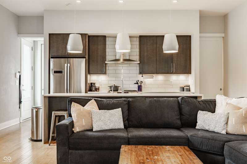 In the heart of Herron Morton find this beautiful ReDev designed townhome. This contemporary 3-bedroom, 3.5-bath residence offers a blend of cozy and clean lines. The kitchen is a showstopper featuring waterfall quartz countertops, an oversized island, stainless steel appliances, and a generous walk-in pantry. The bright and airy great room showcases rich hardwood floors and expansive windows that fill the space with natural light. Enjoy a serene retreat in the primary suite featuring a spa-inspired bath, dual vanities, and a walk-in closet. The fully finished basement adds functionality with a media/recreation room, third bedroom, full bath, wet bar, and abundant storage. Smart LED lighting on the main floor and built-in Sonos speakers round out this exemplary property. The Monon trail, pocket parks, restaurants, bookstores and coffee stops are all within walking distance. You will want to see this one to understand all it has to offer. Welcome home to your sanctuary in the city.