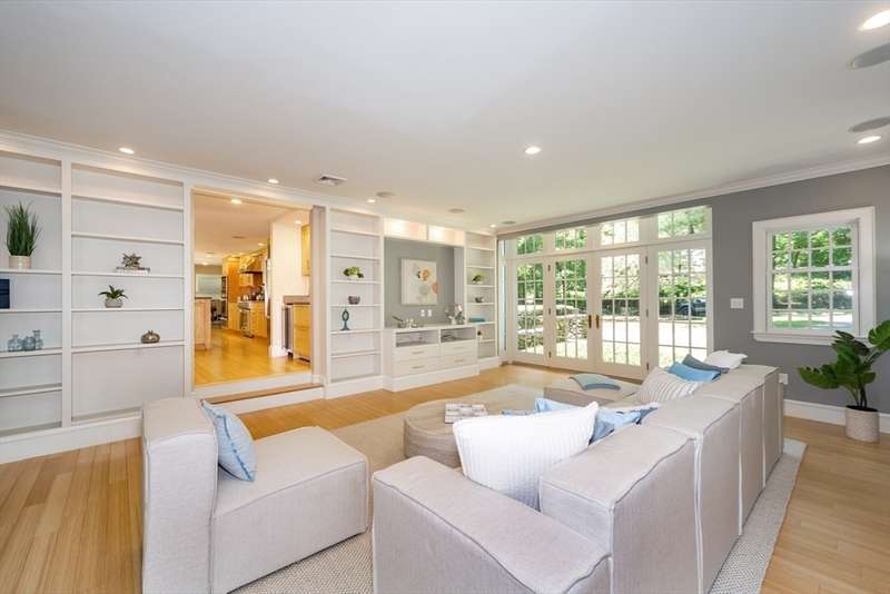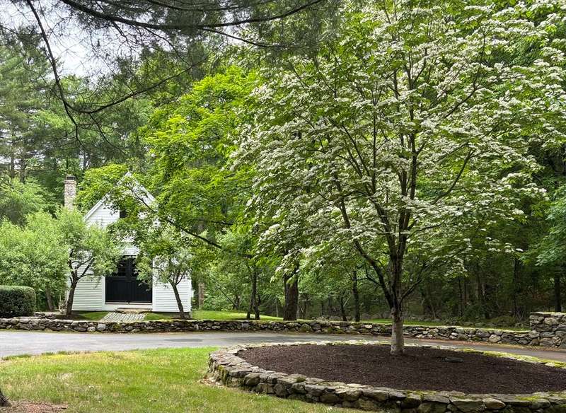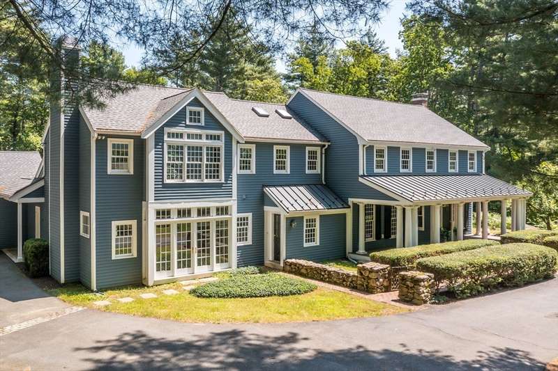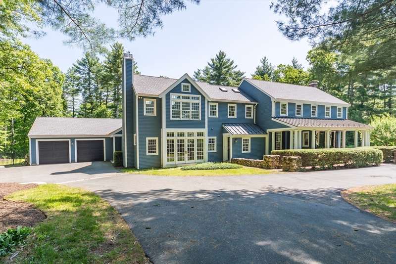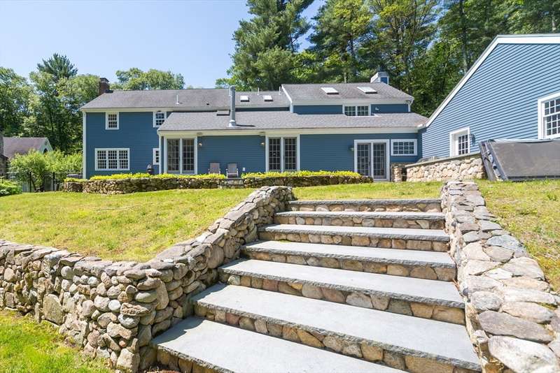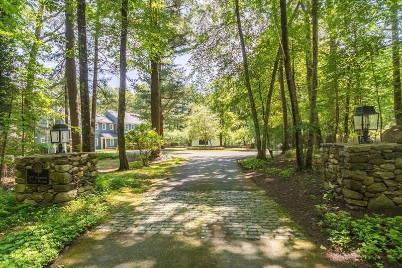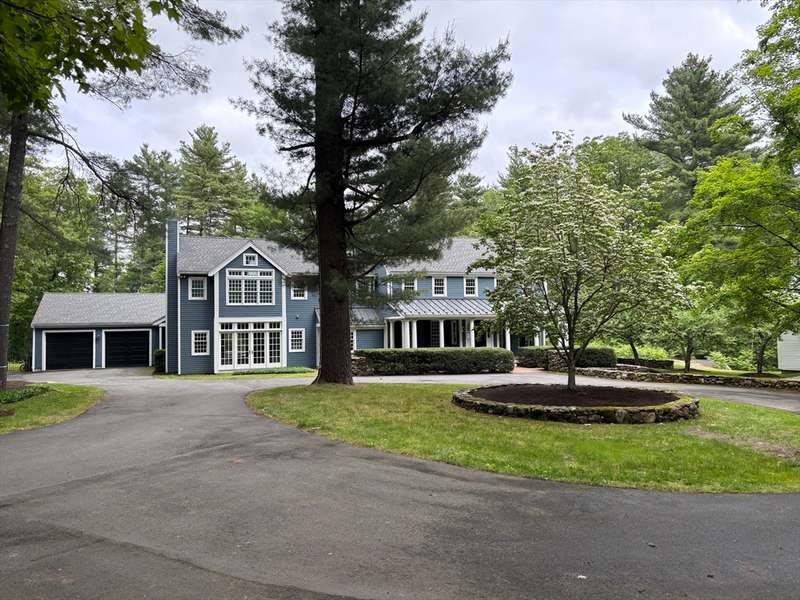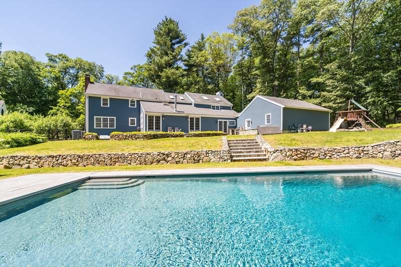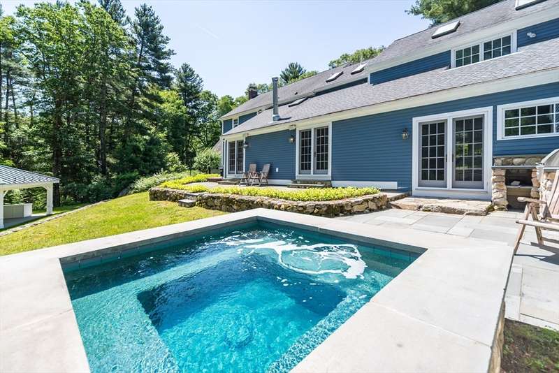 Nestled along a quiet country road, this stunning property offers the perfect blend of rustic charm and refined living. This beautifully crafted home exudes warmth and character. Lots of windows and french doors bring the outside in. The chefs kitchen boasts a fireplace, butler s pantry, large island, and gas cooking. The mud room is huge with plenty of closet space and shelves. The first floor office has its own entry, with a bath nearby. Main bedroom has a cathedral ceiling and another fireplace. The very private outdoor living space includes a saltwater pool that is just steps away from the patio and a year-round spa. Offering separate additional living space is a VERY COOL 3 Level Circle B barn, with a stone fireplace, open living area, a loft. The professionally landscaped grounds are accentuated with cobblestone and brick pathways, and direct trail access. All this and one of Massachusetts best school systems!!