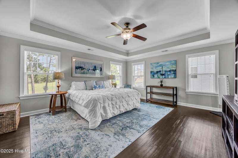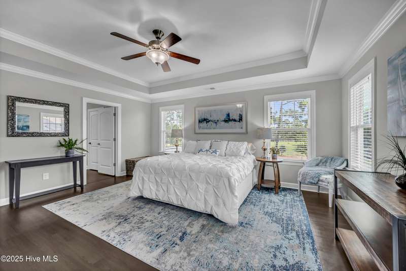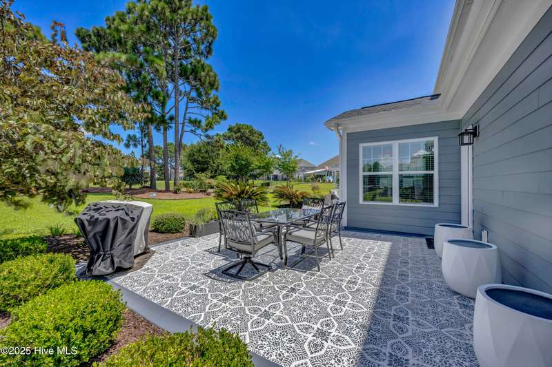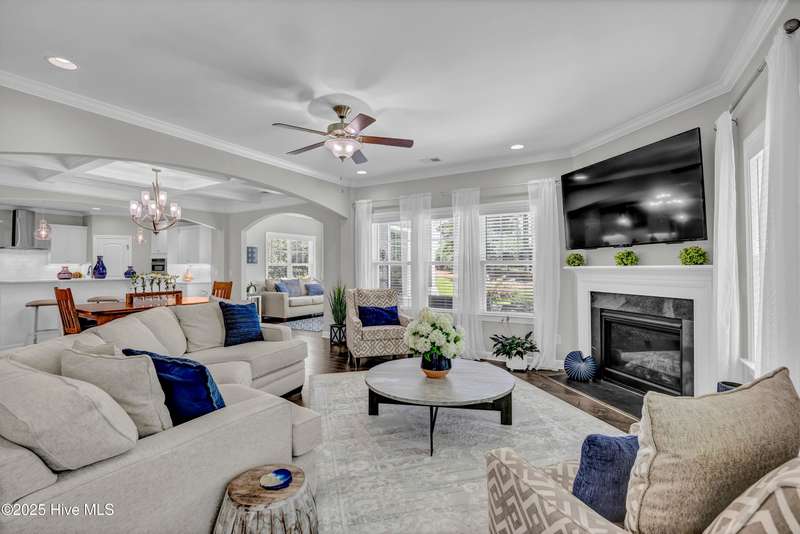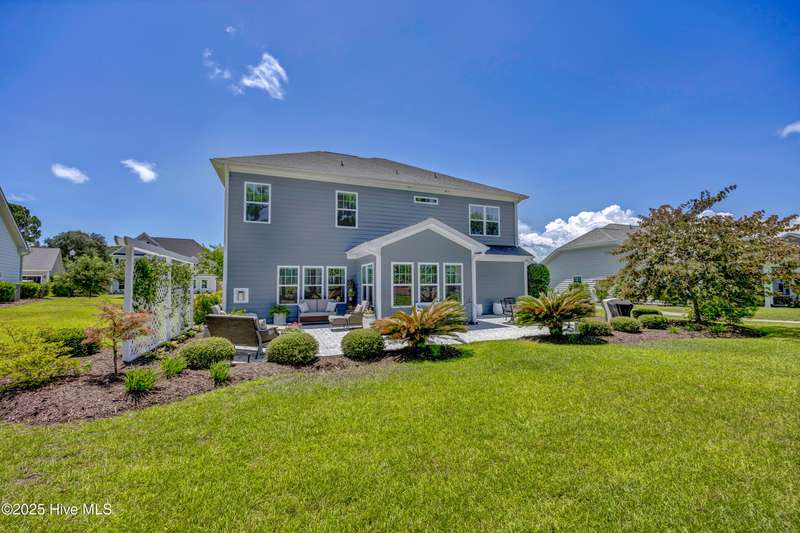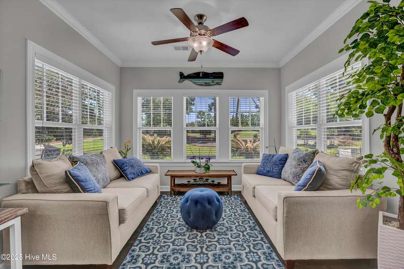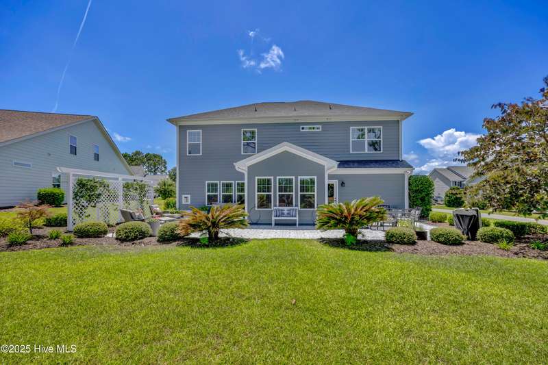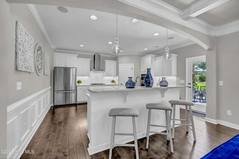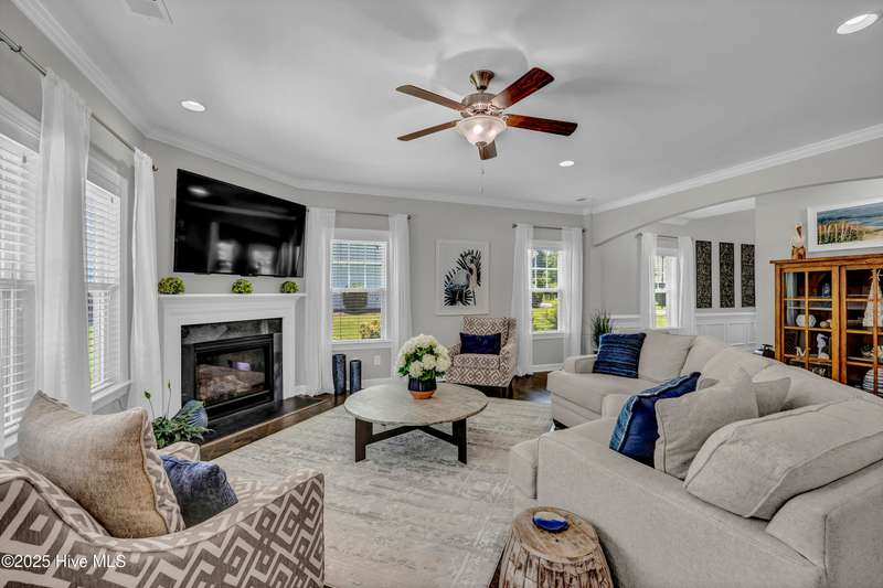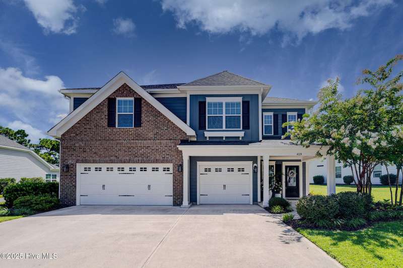 Stunning Coastal Craftsman Style 5 Bedroom, 3 Bath Home located on the 16th green of scenic Beau Rivage Golf Course. Nestled in the serene and sought-after neighborhood of Willow Glen. This expansive 3,640 sq. ft. residence offers the perfect balance of elegance and comfort. Designed with meticulous attention to detail, this home seamlessly blends high-end finishes with inviting spaces. As you enter the home, you are greeted by a Grand 2-story foyer featuring Judge's panels and a broad hallway that leads into the open-concept main living area. The elegant dining room, located just off the living room, boasts coffered ceilings and flows effortlessly into the chef's kitchen with quartz countertops, gas range, stainless appliances, walk-in pantry, wireless ceiling speakers and kitchen island. Enjoy the sunroom, bathed in natural light and offering beautiful views of the professionally manicured yard. There is also a first floor bedroom with access to a full bath for guests or mult-generational living. Upstairs you will find four additional bedrooms each with walk-in closets and a Large Family Room. Retreat to the luxurious primary suite, complete with a spa-like en-suite bathroom with a fully tiled dual-head shower with custom stone base, separate vanities and a walk-in closet. Additional fine features include hardwood flooring throughout the first floor, LVP flooring throughout the second floor, a highly efficient tankless hot water heater, upstairs laundry room, Plenty of storage and a spacious 3-car garage. House was freshly painted in 2023. I saved one of the best features for last - the oversized, custom-painted patio. It's the perfect spot to sip your coffee and watch the morning sunrise and take advantage of cooler afternoons ideal for entertaining. Willow Glen offers a community pool, clubhouse and secure gated access. Located only minutes to shopping and Carolina Beach. This home truly has it all.