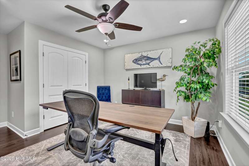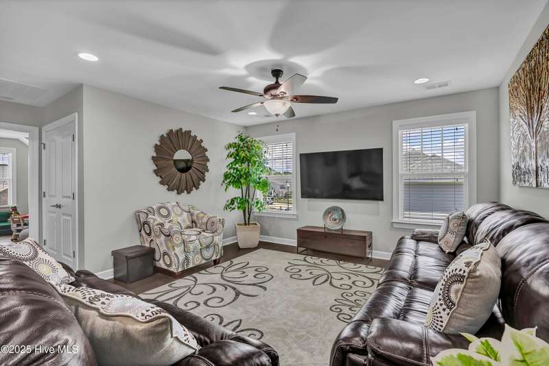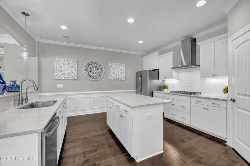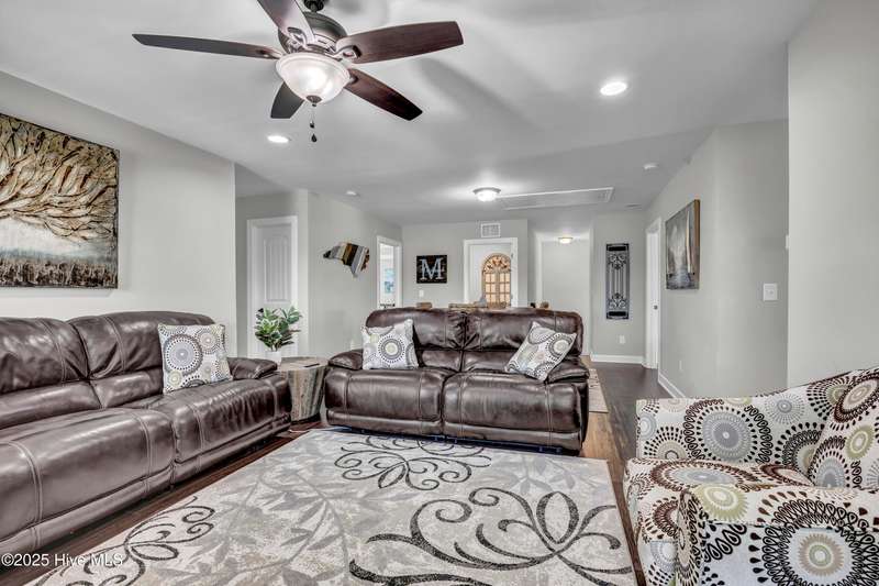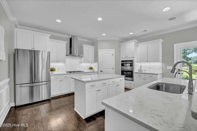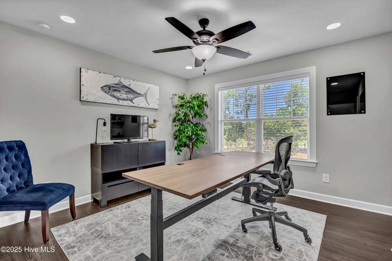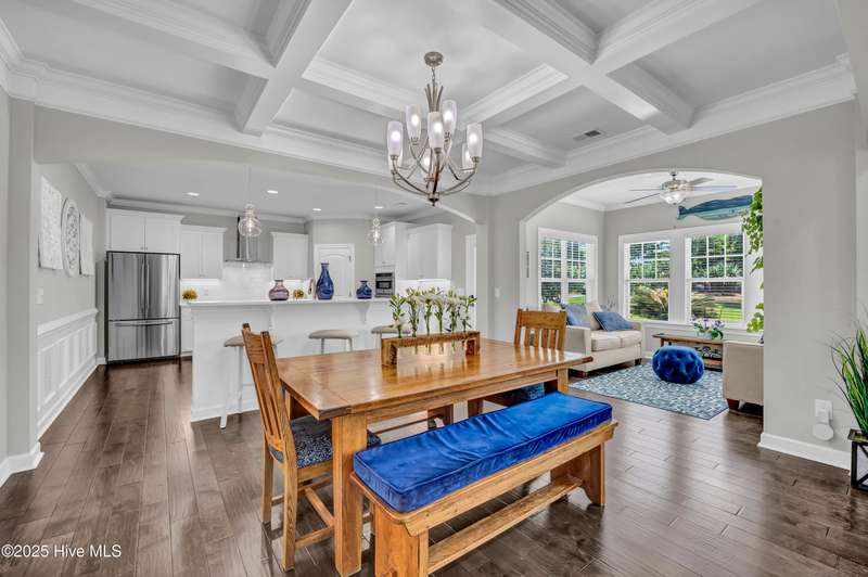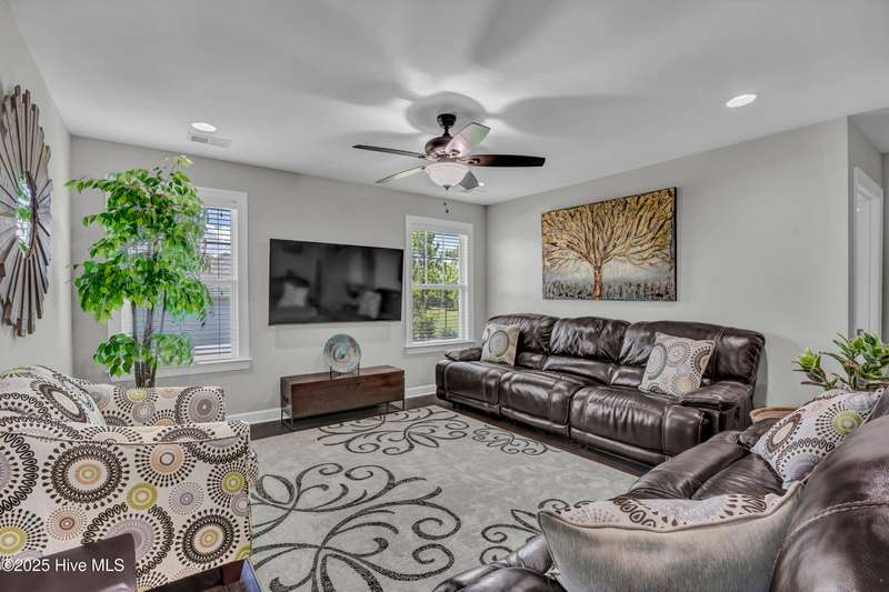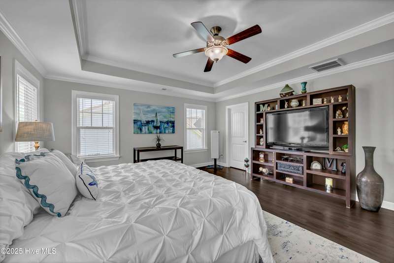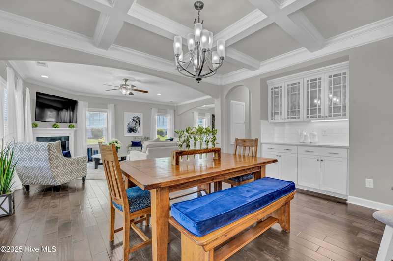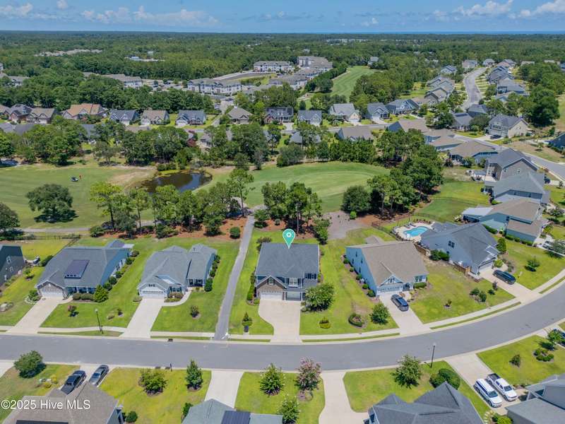 Stunning Coastal Craftsman Style 5 Bedroom, 3 Bath Home located on the 16th green of scenic Beau Rivage Golf Course. Nestled in the serene and sought-after neighborhood of Willow Glen. This expansive 3,640 sq. ft. residence offers the perfect balance of elegance and comfort. Designed with meticulous attention to detail, this home seamlessly blends high-end finishes with inviting spaces. As you enter the home, you are greeted by a Grand 2-story foyer featuring Judge's panels and a broad hallway that leads into the open-concept main living area. The elegant dining room, located just off the living room, boasts coffered ceilings and flows effortlessly into the chef's kitchen with quartz countertops, gas range, stainless appliances, walk-in pantry, wireless ceiling speakers and kitchen island. Enjoy the sunroom, bathed in natural light and offering beautiful views of the professionally manicured yard. There is also a first floor bedroom with access to a full bath for guests or mult-generational living. Upstairs you will find four additional bedrooms each with walk-in closets and a Large Family Room. Retreat to the luxurious primary suite, complete with a spa-like en-suite bathroom with a fully tiled dual-head shower with custom stone base, separate vanities and a walk-in closet. Additional fine features include hardwood flooring throughout the first floor, LVP flooring throughout the second floor, a highly efficient tankless hot water heater, upstairs laundry room, Plenty of storage and a spacious 3-car garage. House was freshly painted in 2023. I saved one of the best features for last - the oversized, custom-painted patio. It's the perfect spot to sip your coffee and watch the morning sunrise and take advantage of cooler afternoons ideal for entertaining. Willow Glen offers a community pool, clubhouse and secure gated access. Located only minutes to shopping and Carolina Beach. This home truly has it all.