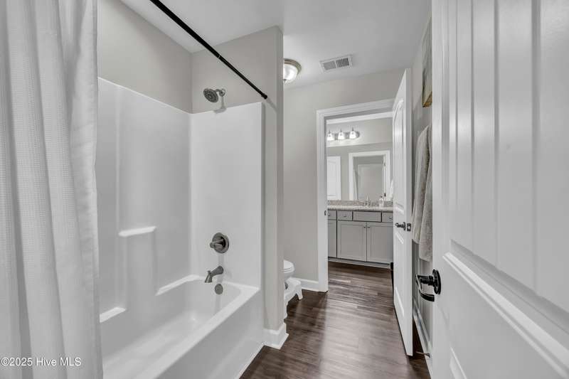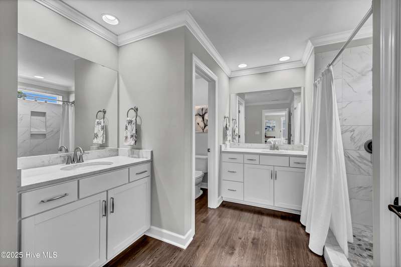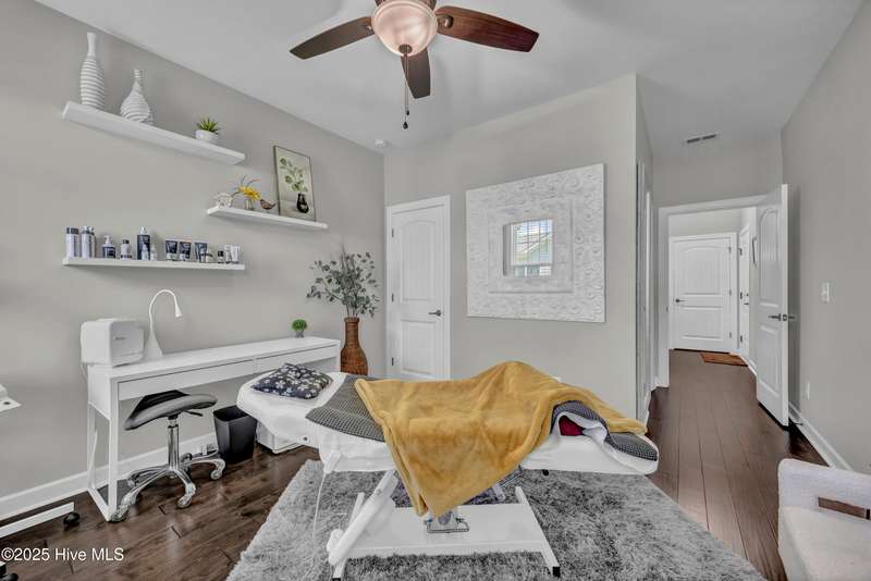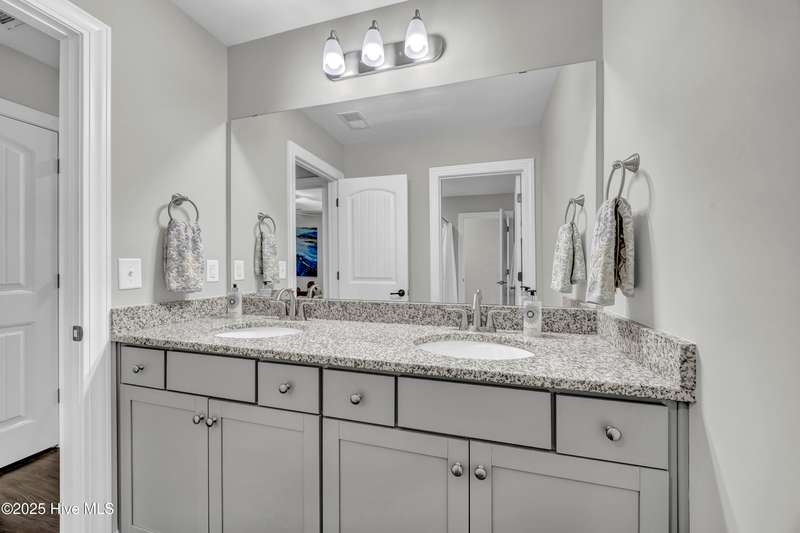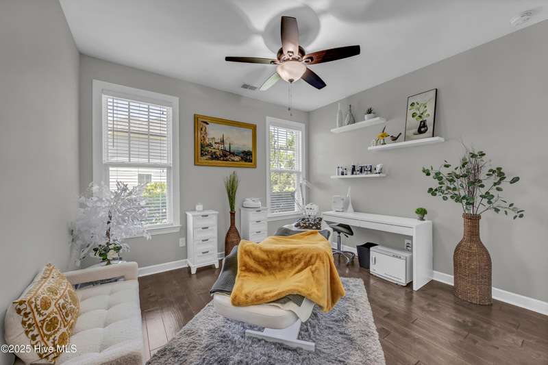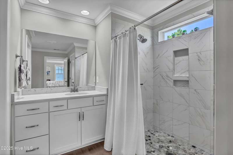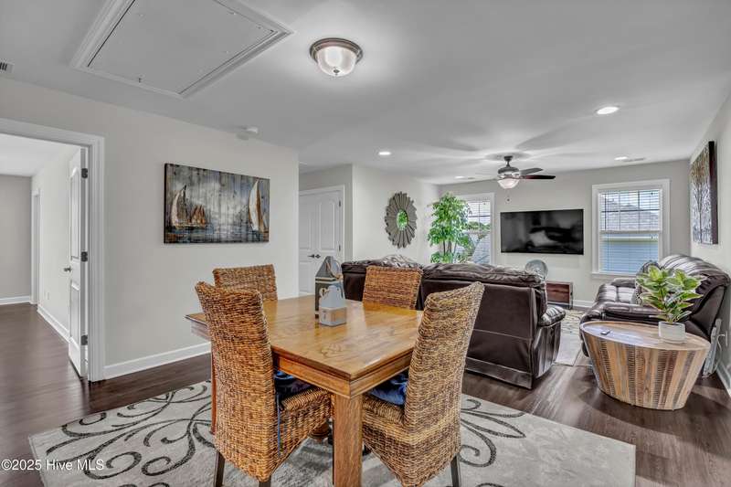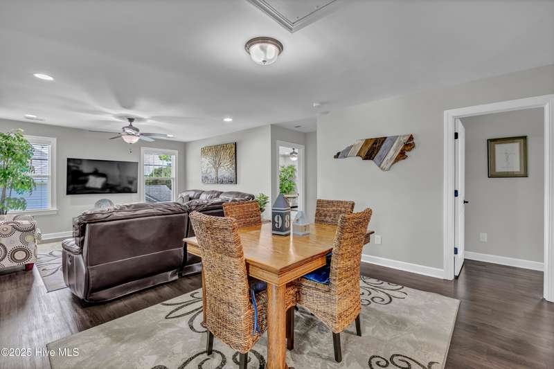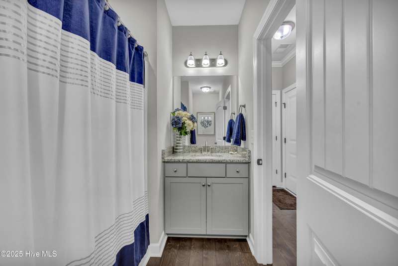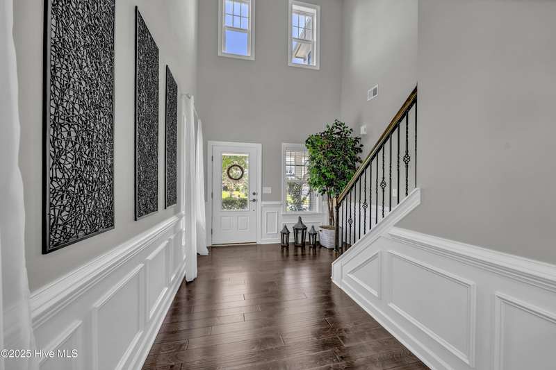 Stunning Coastal Craftsman Style 5 Bedroom, 3 Bath Home located on the 16th green of scenic Beau Rivage Golf Course. Nestled in the serene and sought-after neighborhood of Willow Glen. This expansive 3,640 sq. ft. residence offers the perfect balance of elegance and comfort. Designed with meticulous attention to detail, this home seamlessly blends high-end finishes with inviting spaces. As you enter the home, you are greeted by a Grand 2-story foyer featuring Judge's panels and a broad hallway that leads into the open-concept main living area. The elegant dining room, located just off the living room, boasts coffered ceilings and flows effortlessly into the chef's kitchen with quartz countertops, gas range, stainless appliances, walk-in pantry, wireless ceiling speakers and kitchen island. Enjoy the sunroom, bathed in natural light and offering beautiful views of the professionally manicured yard. There is also a first floor bedroom with access to a full bath for guests or mult-generational living. Upstairs you will find four additional bedrooms each with walk-in closets and a Large Family Room. Retreat to the luxurious primary suite, complete with a spa-like en-suite bathroom with a fully tiled dual-head shower with custom stone base, separate vanities and a walk-in closet. Additional fine features include hardwood flooring throughout the first floor, LVP flooring throughout the second floor, a highly efficient tankless hot water heater, upstairs laundry room, Plenty of storage and a spacious 3-car garage. House was freshly painted in 2023. I saved one of the best features for last - the oversized, custom-painted patio. It's the perfect spot to sip your coffee and watch the morning sunrise and take advantage of cooler afternoons ideal for entertaining. Willow Glen offers a community pool, clubhouse and secure gated access. Located only minutes to shopping and Carolina Beach. This home truly has it all.