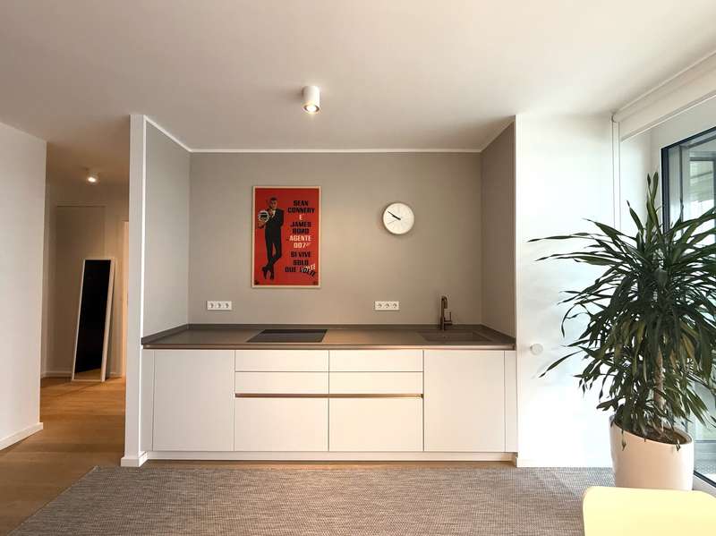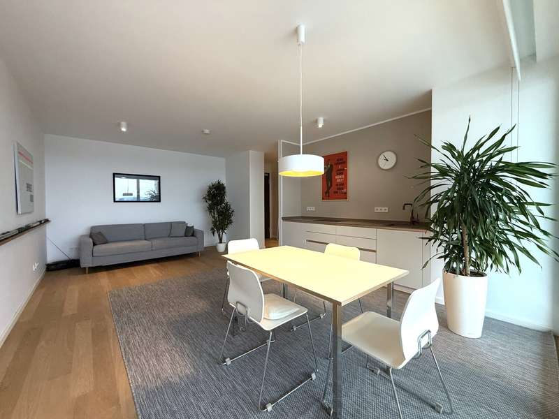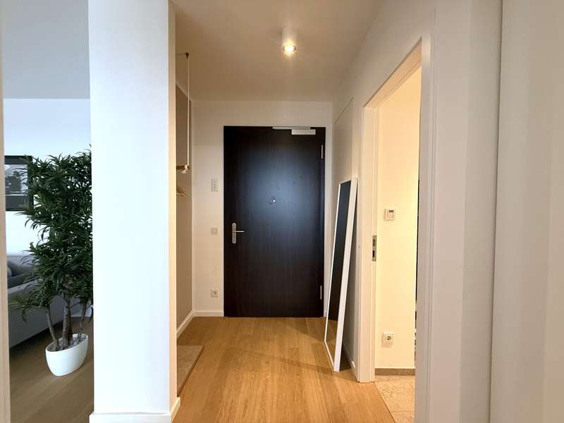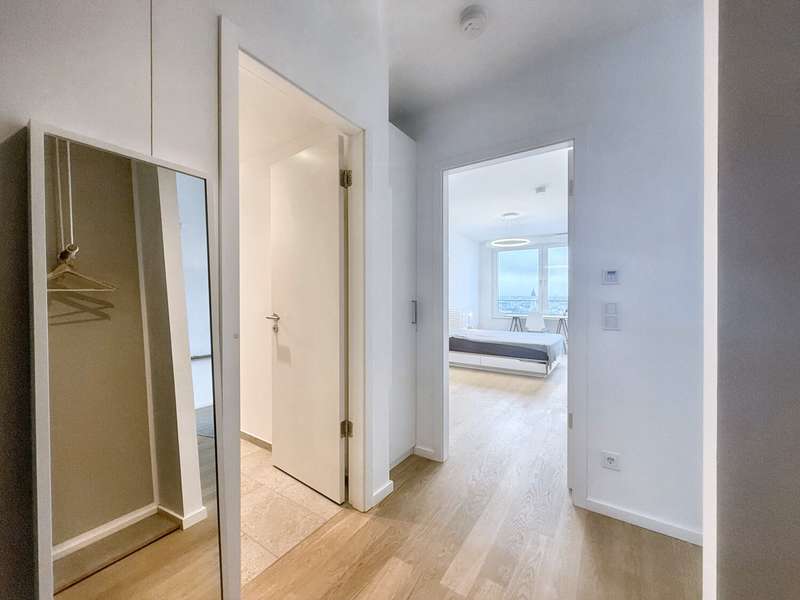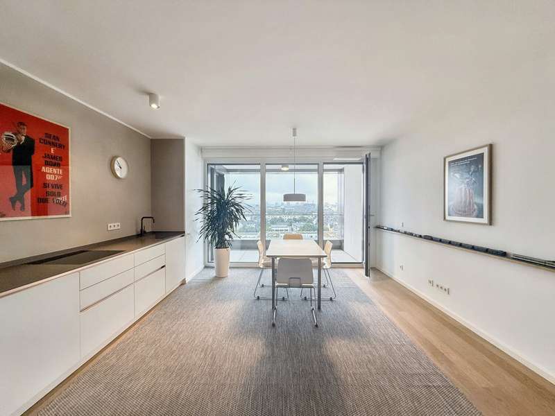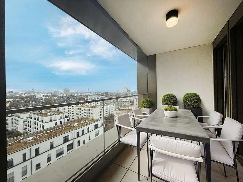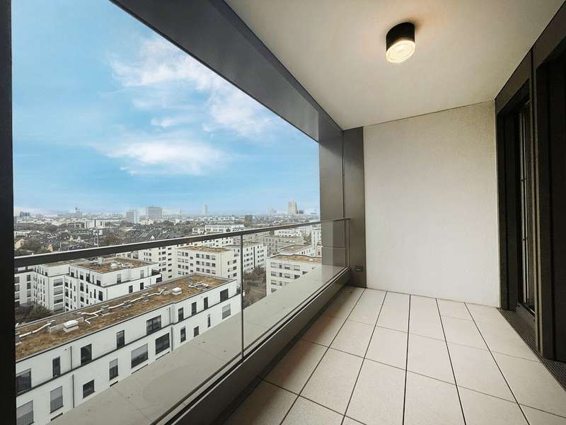This elegant two-room apartment on the 12th floor boasts an incomparable panoramic view over the Europaviertel. The sheltered loggia, which invites you to linger, is particularly impressive, as are the fascinating sunsets that can be enjoyed from here. The high-quality furnishings underline the cosmopolitan character of the apartment. It comprises a spacious bedroom, an elegant bathroom and a light-flooded living area with a tasteful fitted kitchen. Oiled oak parquet flooring in the living area, Italian porcelain stoneware in the bathroom, a spacious, flush-to-floor shower area with rain shower and high-quality bathroom fittings ensure a sophisticated living experience. The ambience is complemented by high ceilings of 2.60 m, which lend the apartment additional spaciousness. The absolute highlight is the spacious living room, which is a paradise for home aesthetes with its magnificent view. In addition, the quiet, leafy inner courtyard, which is reserved exclusively for residents, offers a retreat in the middle of the city. The location is also impressive: whether a jog through the Europagarten or the Neuer Rebstockpark - sporting activities can be started right on the doorstep. A reliable concierge service also supports residents in everyday matters and ensures a welcoming atmosphere in the building at all times. And for the perfect start to the day, there is a genuine French boulangerie just around the corner to sweeten your morning breakfast. A cellar room naturally also belongs to the apartment and rounds off this attractive offer.
