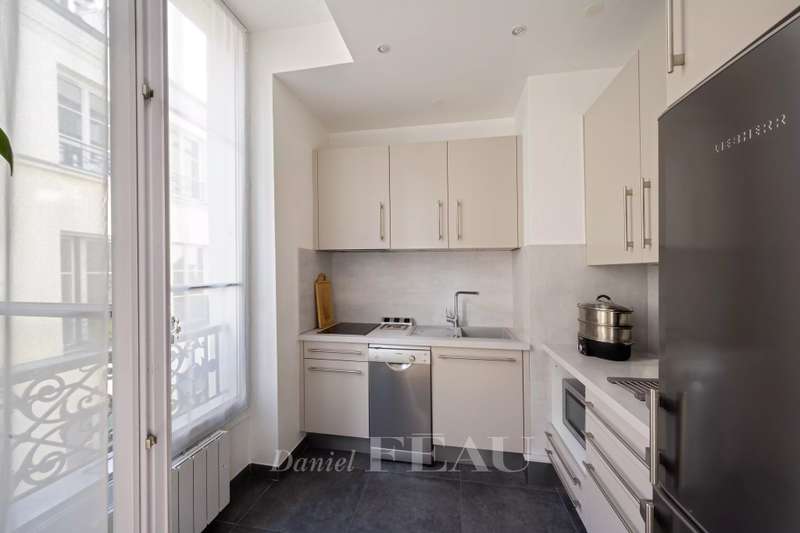 This over 70 sqm apartment is on the 3rd floor of a revamped period building with a lift and beautiful common areas located in a peaceful little street between the Pinault Foundation and the Tuileries. Particularly sunny and benefiting from high ceilings, it comprises a living/reception room, a kitchen two bedrooms and a shower room.