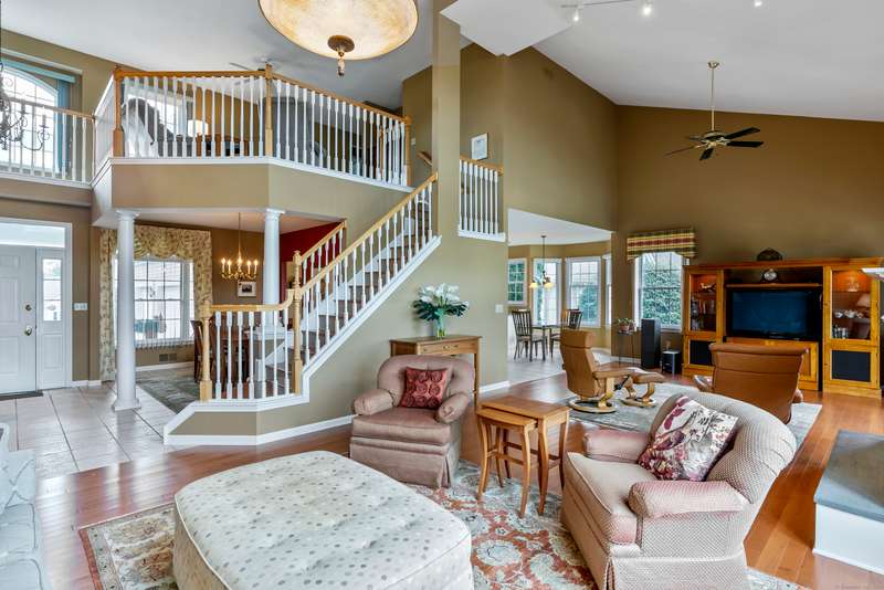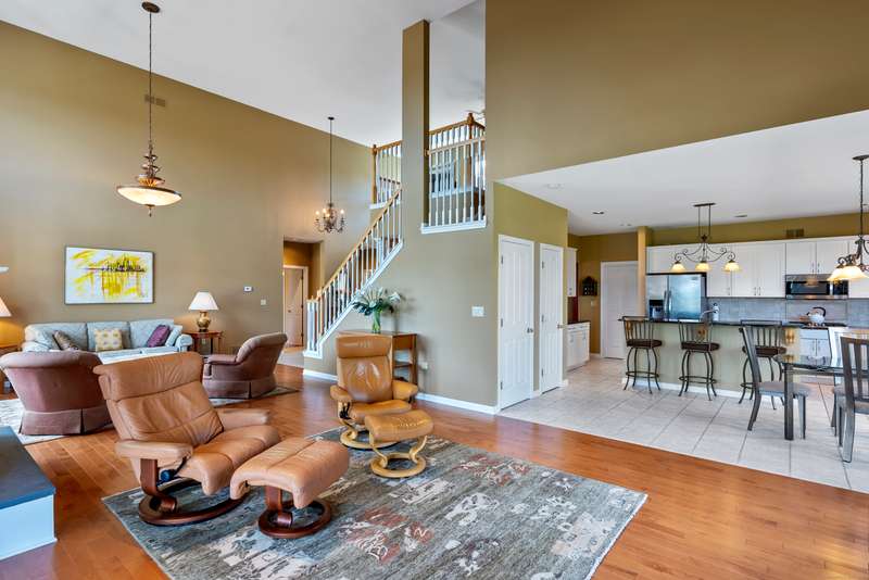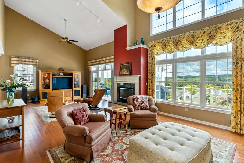 This striking Sunningdale model is set along the prestigious PGA golf course and offers an open, inviting layout designed for both everyday living and entertaining. The dining room flows seamlessly into the living room, highlighted by soaring ceilings and a stunning gas fireplace, while the sun-filled eat-in kitchen is perfect for gathering open to a charming sunroom providing a peaceful spot to take in the views year-round. The first-floor primary suite is a private retreat, featuring a spacious design, spa-like bath, and generous walk-in closets. Expansive windows throughout bathe the home in natural light, showcasing every detail. Upstairs, you'll find a versatile loft-ideal for an office, den, or media room-along with two additional bedrooms. The lower level that has been partially finished with only a few steps left to fully finish along with a cedar closet! Step outside to dual decks on both levels, perfect for dining al fresco, entertaining, or simply enjoying the serene golf co