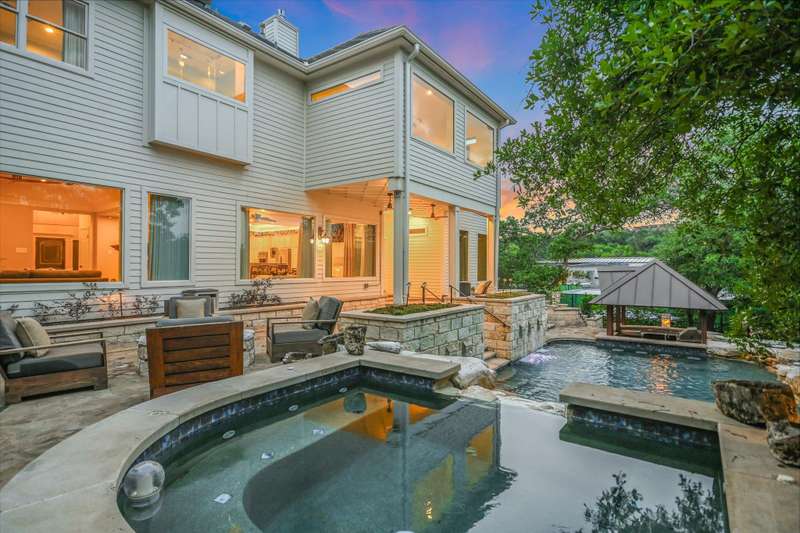Stunning, resort-style outdoor living in desirable Barton Hills. Perched high above Barton Creek, the back yard has been transformed into a terraced wonderland for swimming, lounging and entertaining. Floating in the stone-surrounded pool which overlooks the lush creek valley feels like bathing in nature. Outfitted with all the amenities, the pool has a volleyball setup, waterfall, hot tub and even a swim-up bar. Serve drinks in the outdoor kitchen pavilion where you can also grill up dinner for your guests. Surrounding the water, a stone patio features a seating area and fire pit.