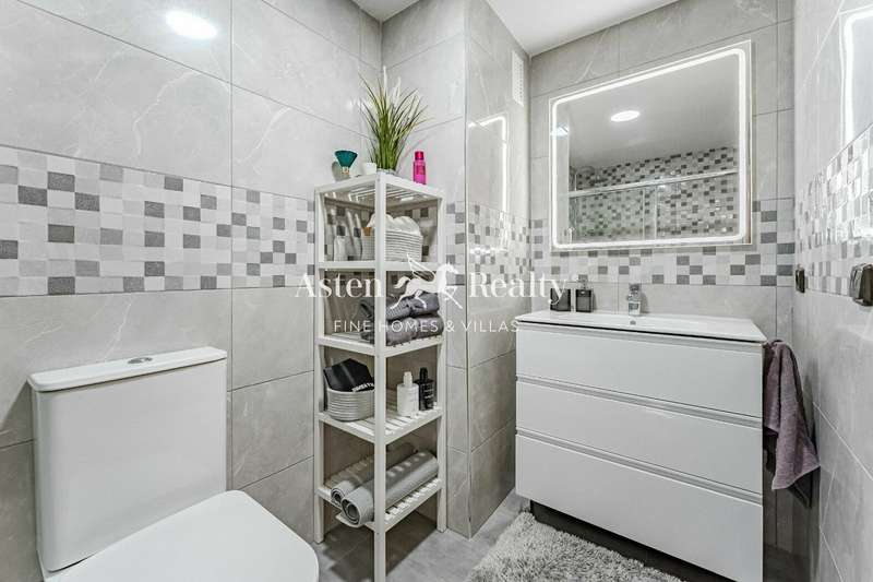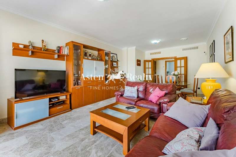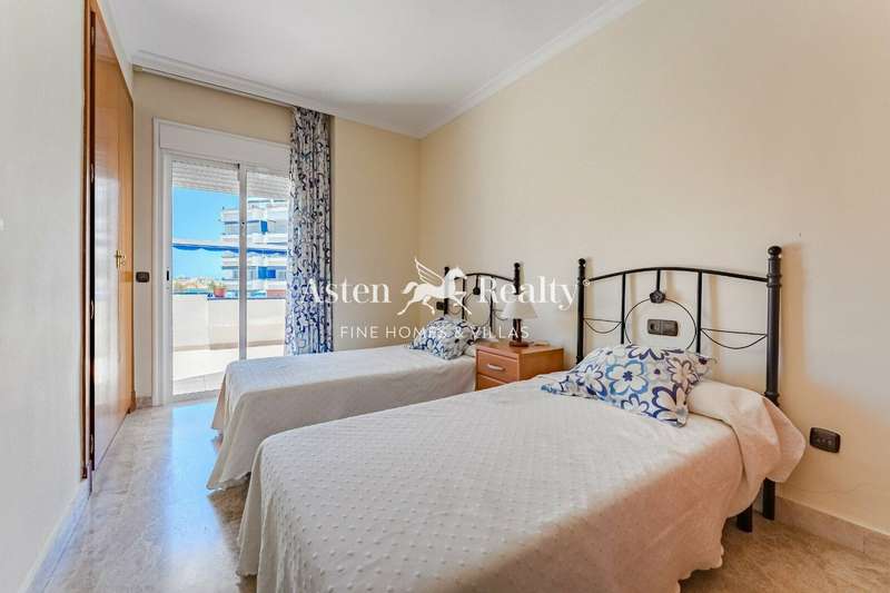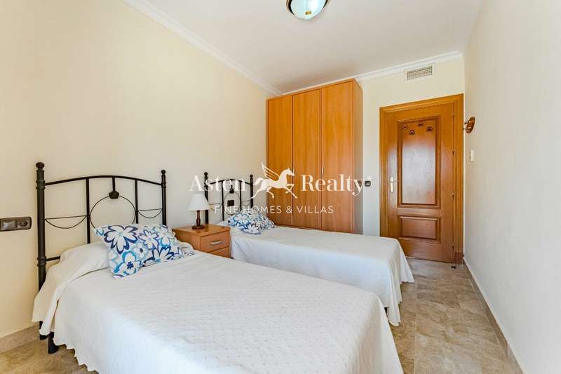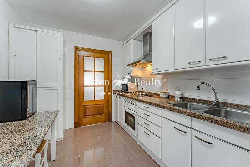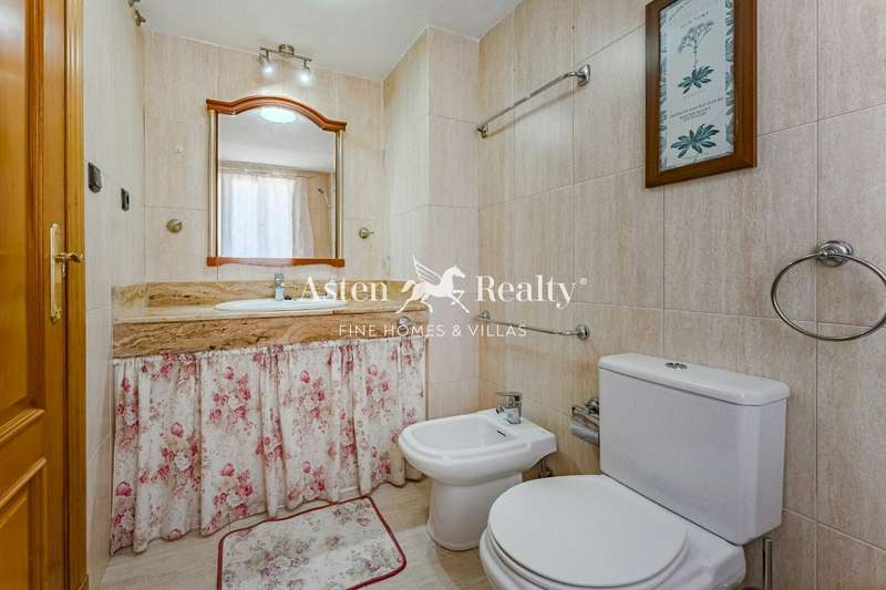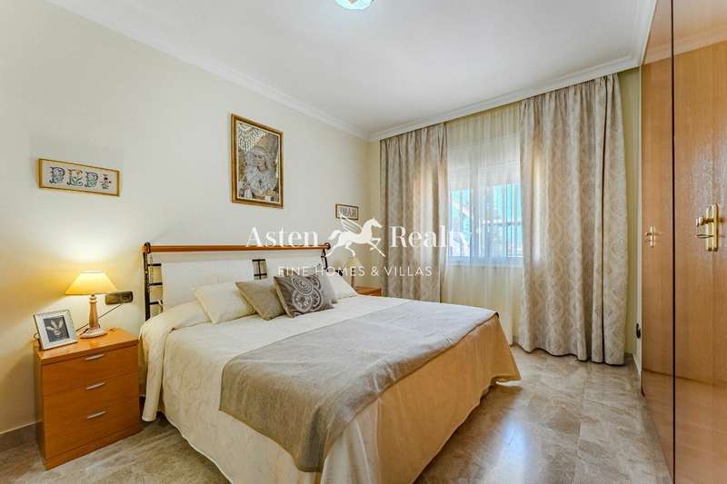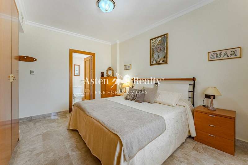 From the entrance, there is a spacious living room, a separate kitchen with utility area, four double bedrooms, and two full bathrooms, one of them en suite in the master bedroom. The apartment is equipped with electric shutters and air conditioning in all rooms.