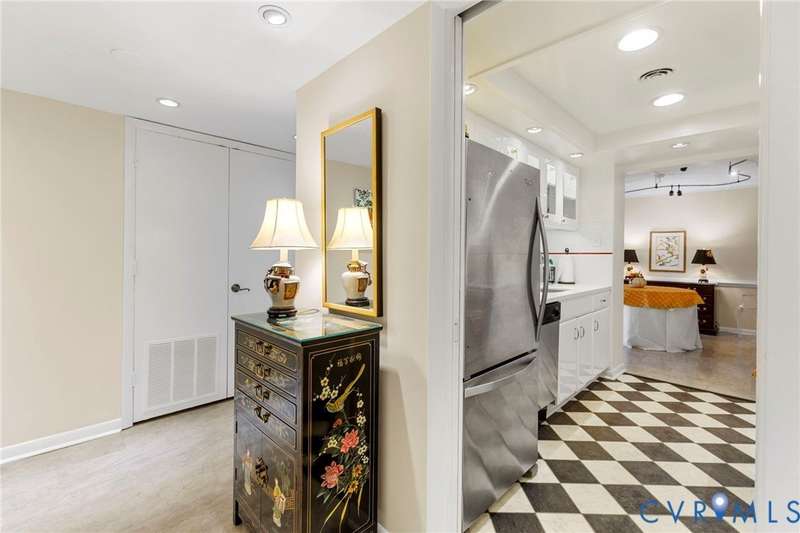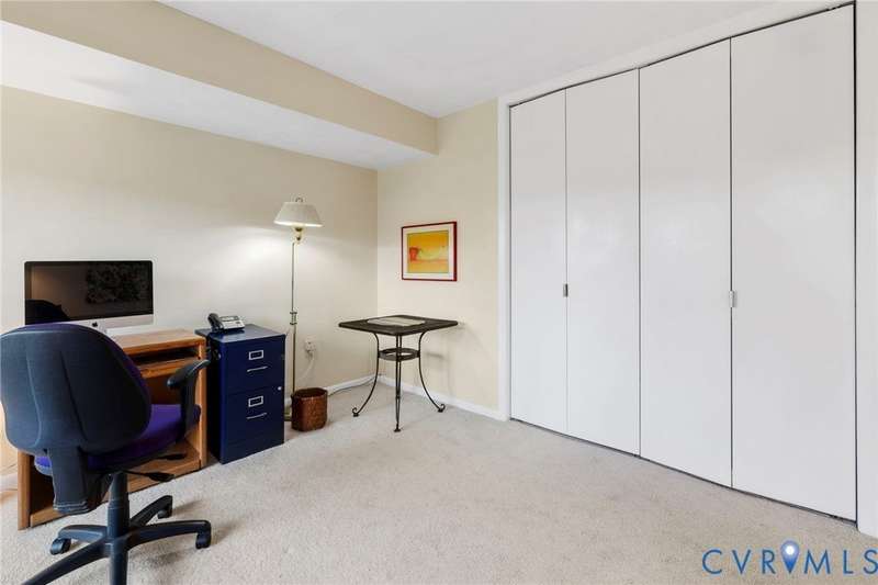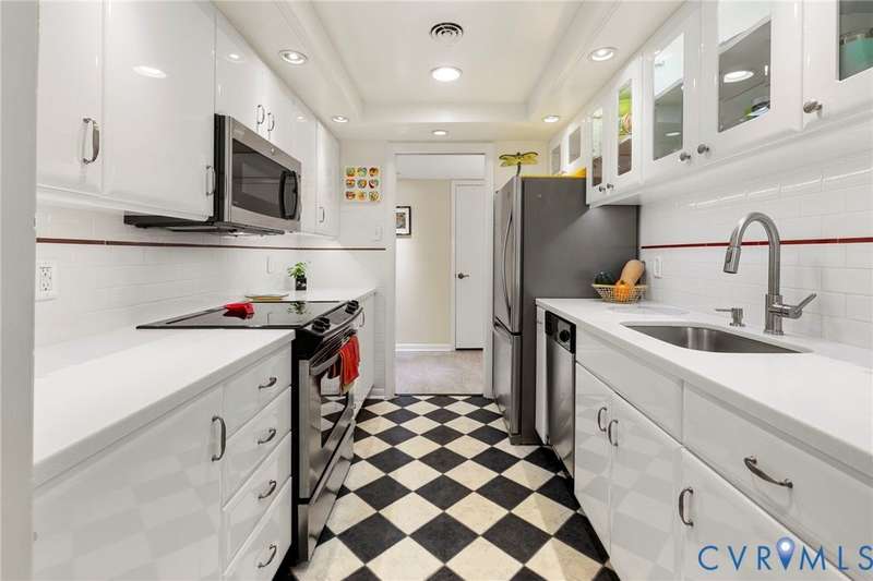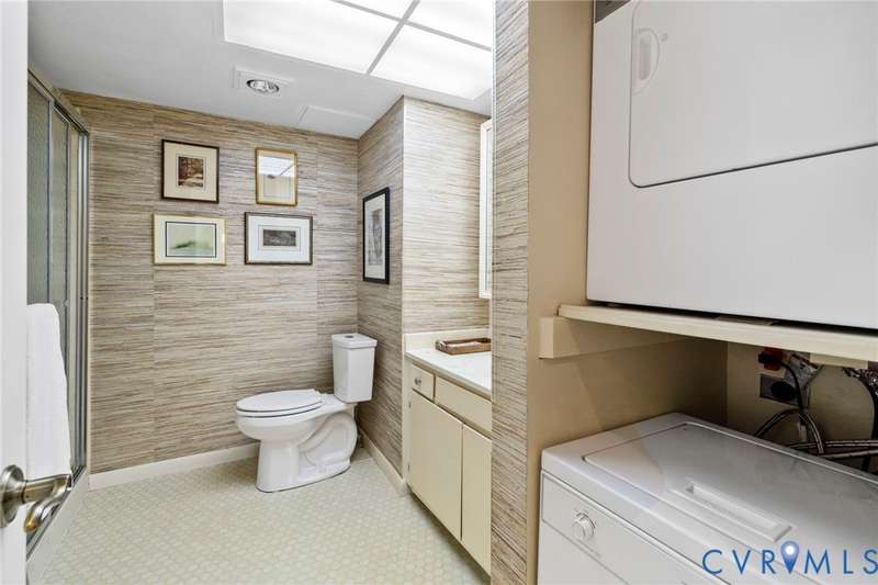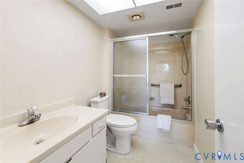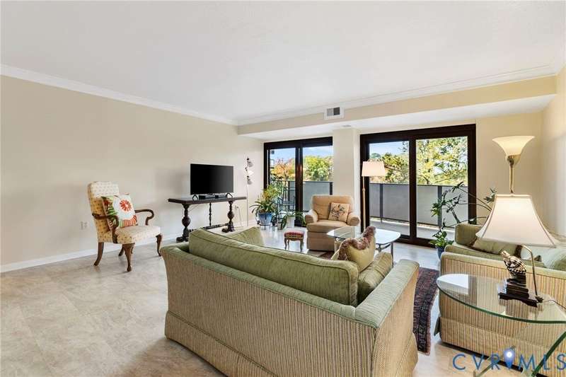 Welcome home to this freshly painted 2-bed, 2-bath condo in Hathaway Towers where you can sit at the treetop level and watch the sunset. The living room has two sliding glass doors that lead to the balcony and opens up to the dining room, which features adjustable track lighting, allowing you to show off your art. The renovated galley-style kitchen features modern glass-front cabinets, new counter-tops and a tile backsplash. The primary bedroom has a spacious walk-in closet and an attached full bath. The other large-sized bedroom has its own balcony access and a double-door closet. There is an in-unit washer and dryer, and all the windows are new along with the replaced sliding doors (Pella Brand). With the unit comes a designated covered parking space, same-floor storage, 24-hour security, gym, pool, water, sewer, trash, and cable. Close by are groceries, restaurants, shops, and the James River.