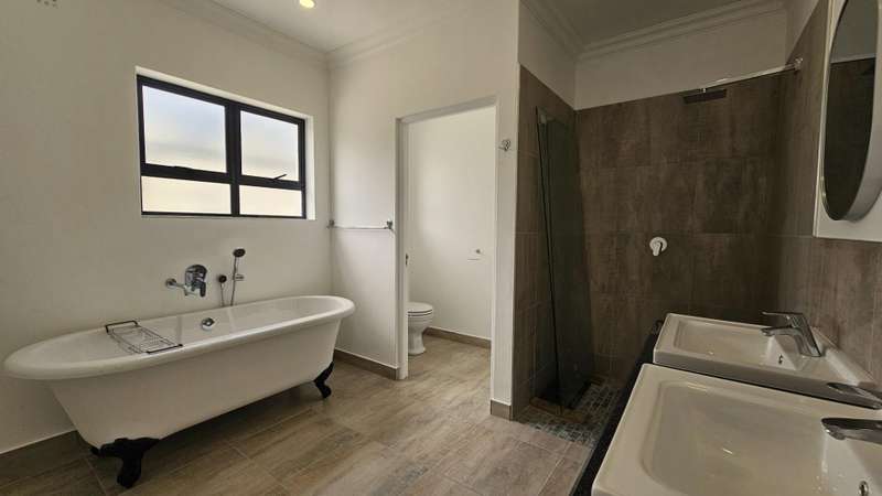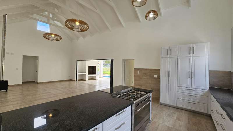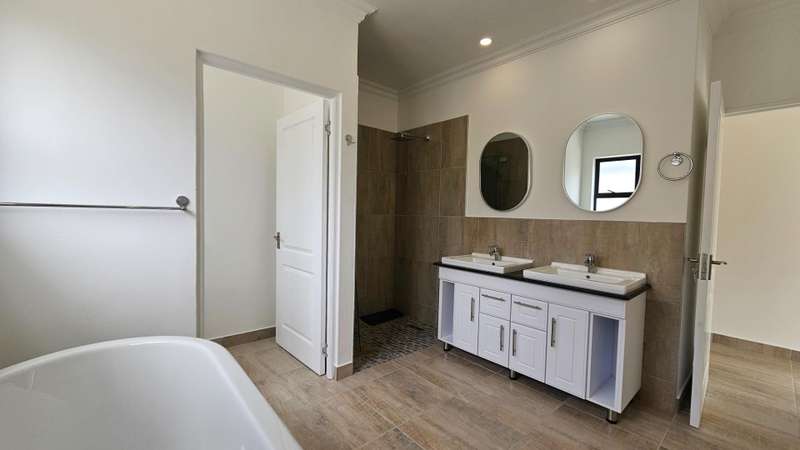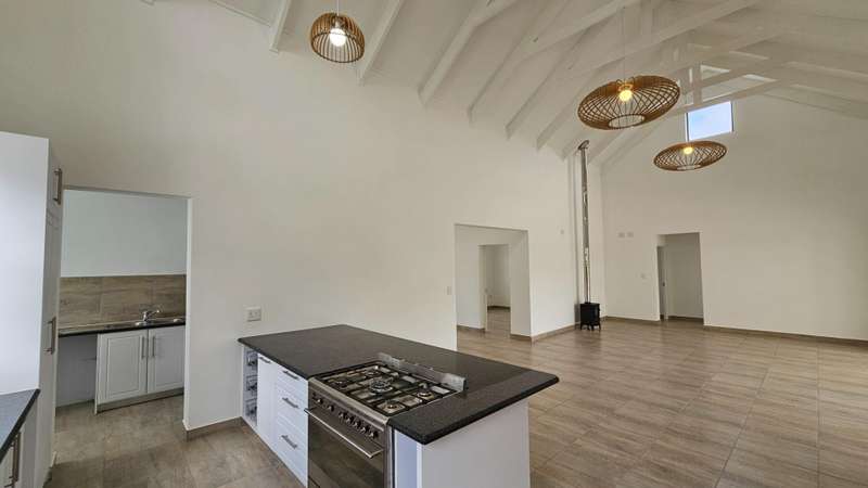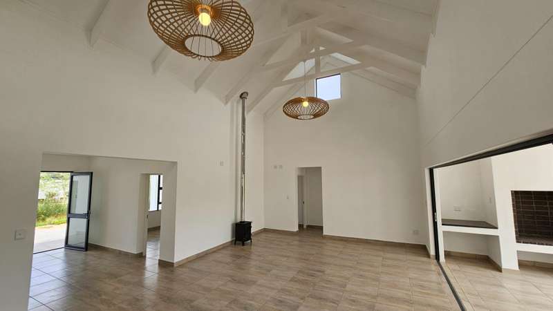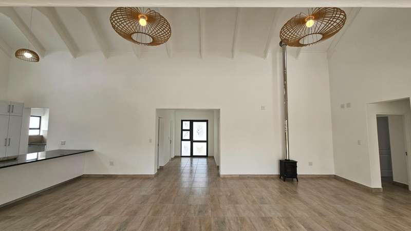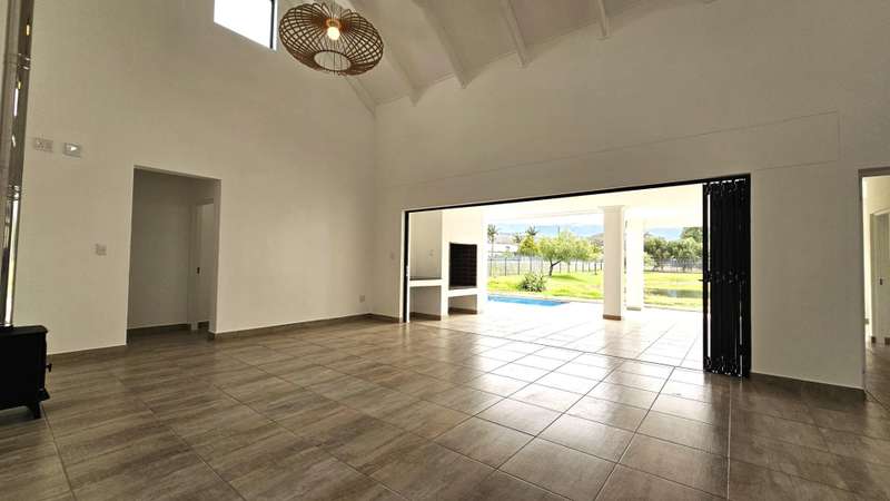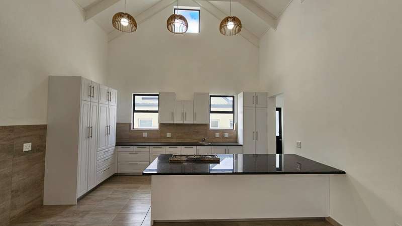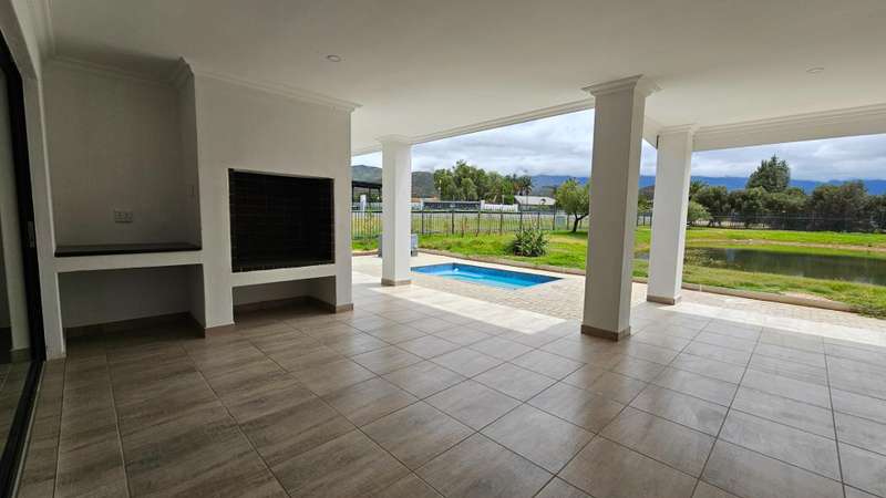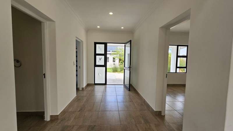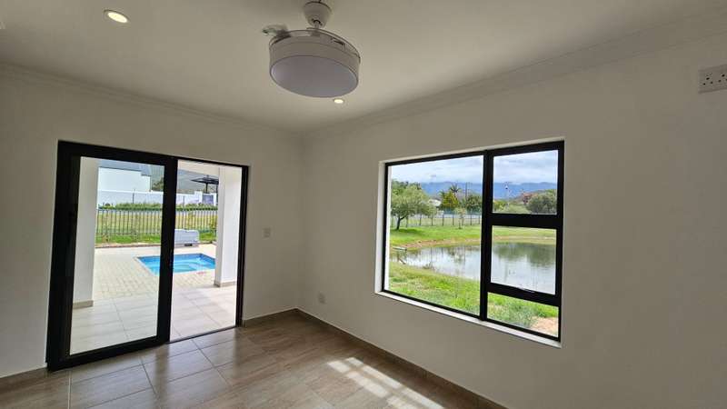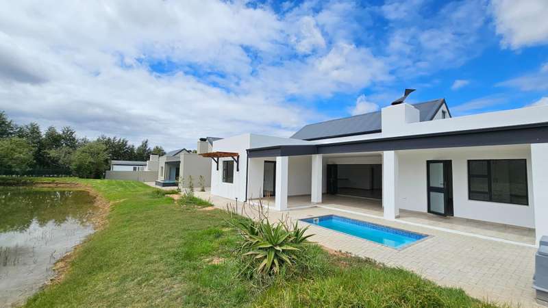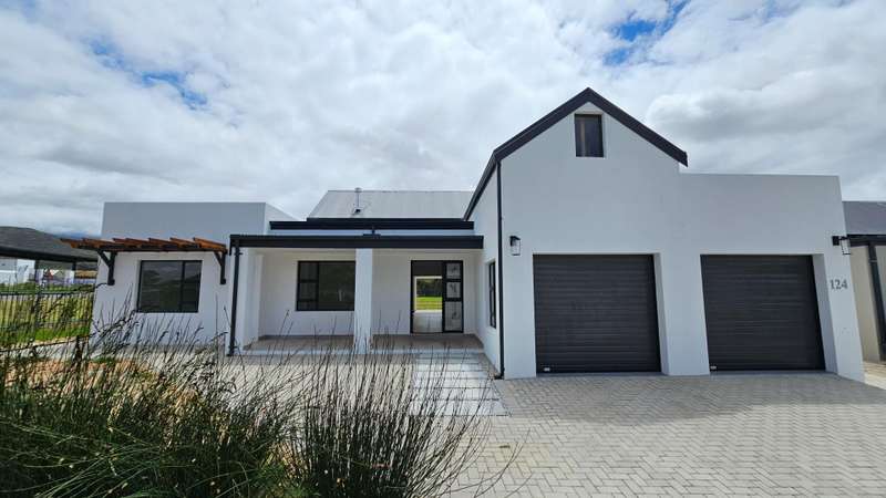 Newly built, modern home for sale in Silwerstrand Village Estate, seamlessly blending luxury and security. This three-bedroom en-suite property features a versatile fourth room for use as a study or additional bedroom. The spacious double-volume open plan living area boasts a cozy fireplace, connecting to the patio through stack doors leading to an undercover stoep with stunning views of a pond and the Langeberg Mountains. Entertain next to the sparkling pool and built-in braai, appreciating the scenic surroundings. A double automated garage provides direct access into the home. The beautiful kitchen is equipped with a gas stove, ample cupboard space, and a separate scullery. Enjoy the privacy of a cul-de-sac location within the estate, which offers 24-hour security and access to the golf course and clubhouse. No transfer duties payable.