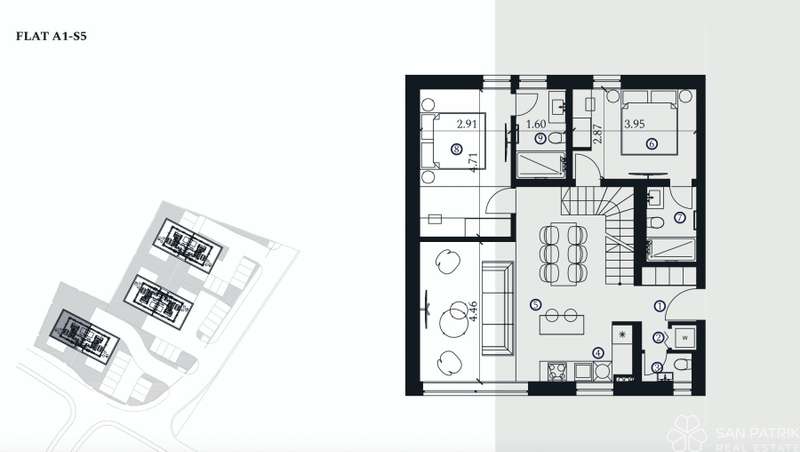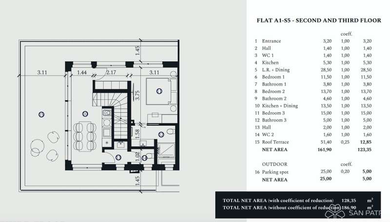 Apartment A1-S5 - 2nd and 3rd floor - living area 110.85 m2 (3 bedrooms + 3 bathrooms + 2 WCs) + rooftop terrace (51.40 m2) + two outdoor parking spaces, total net surface 128.35 m2 = EUR 707,053.00