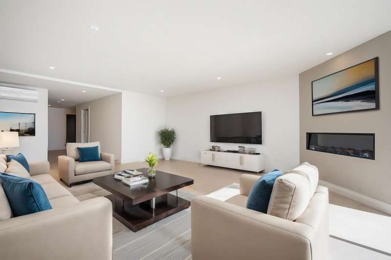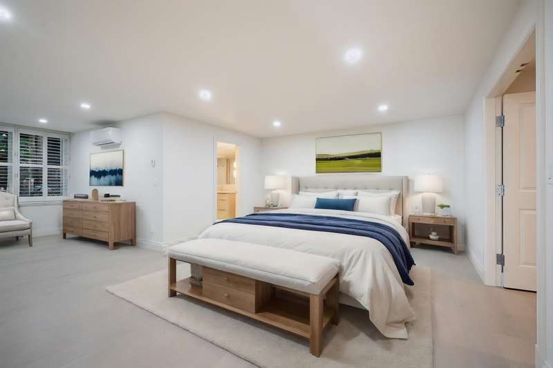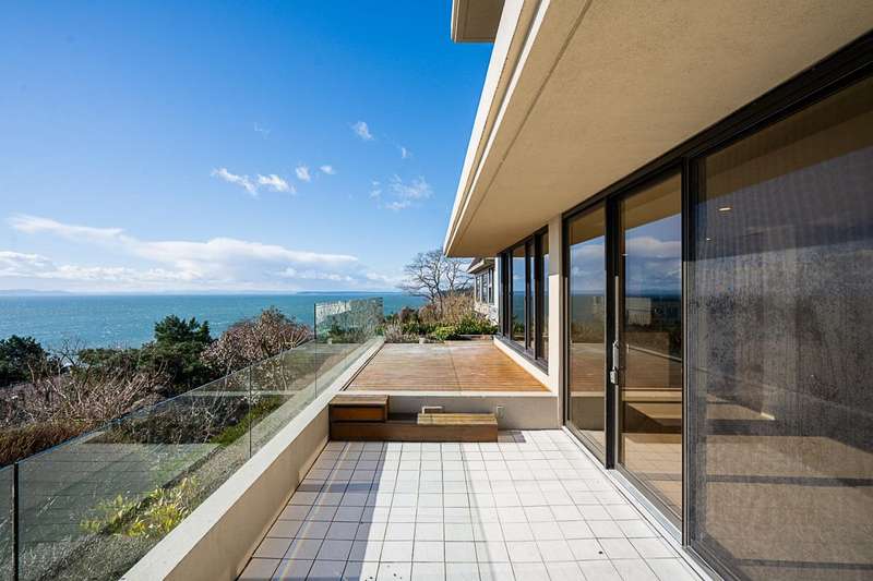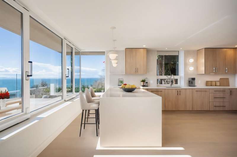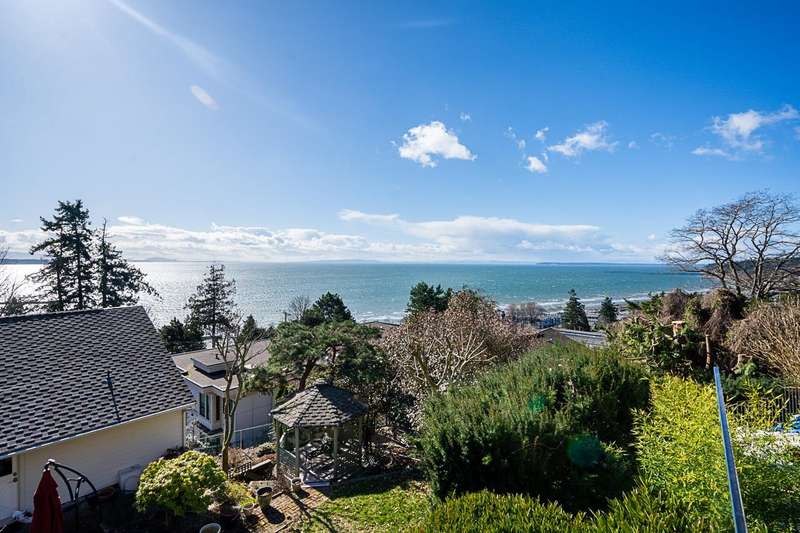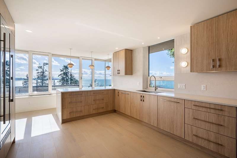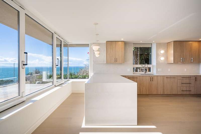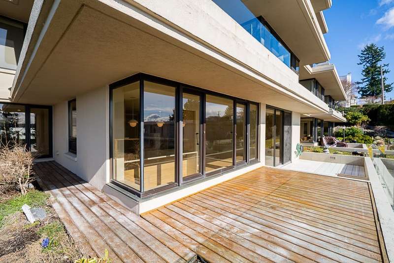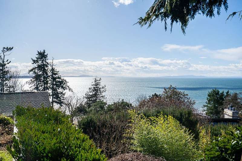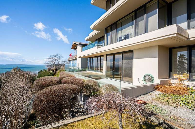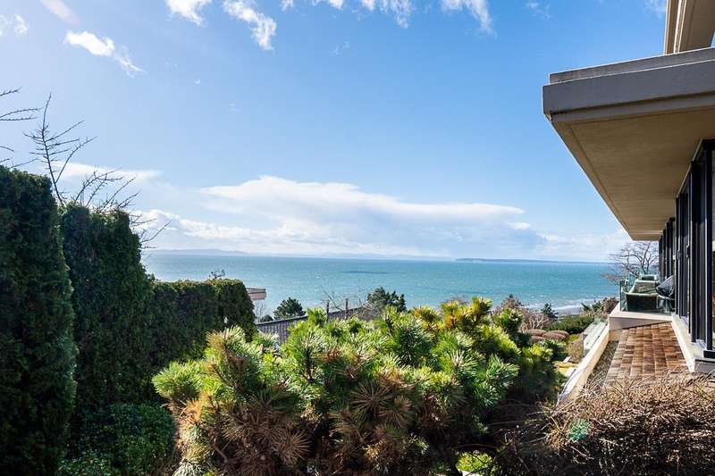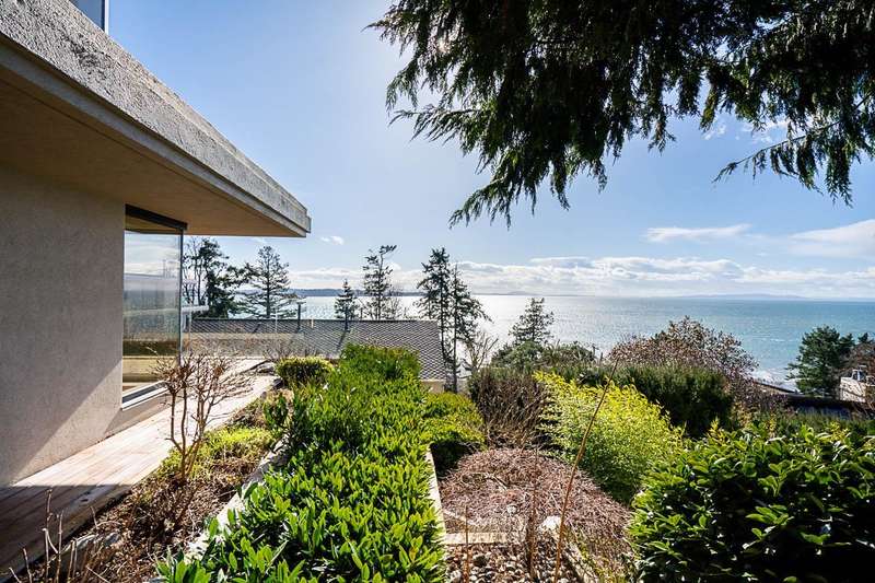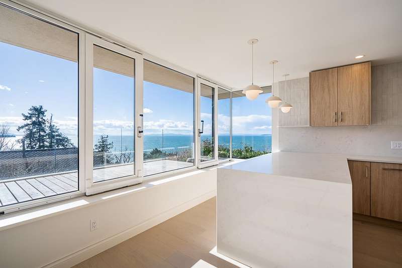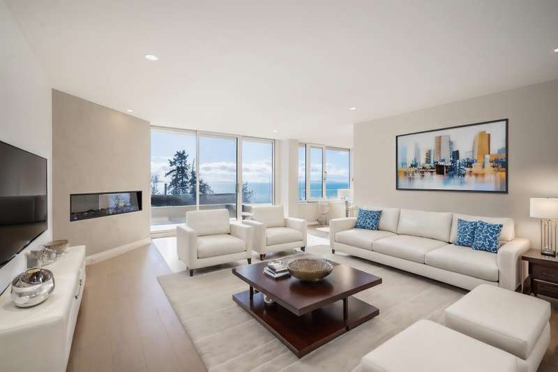 Experience the epitome of luxury living at The Contessa! One of White Rock's premier low rise concrete buildings, this magnificent SW corner unit offers unobstructed panoramic views of the ocean and islands. Boasting 2395 sqft of living space on a single level, this residence includes a beautiful outdoor patio and access to a private side yard. Step into a realm of elegance with high-end renovations throughout. The kitchen features new cabinetry, stone counters, and integrated Thermador appliances, including a built-in coffee machine and wine fridge. The primary bedroom is a sanctuary, offering a spa-like ensuite and a generously sized walk-in closet. Heat Pump, A/C, EV charger included and with only 2 homes per level, privacy is a given.