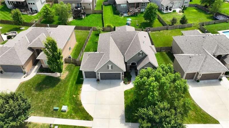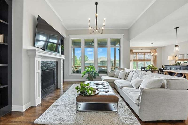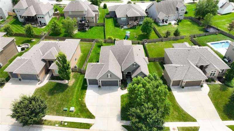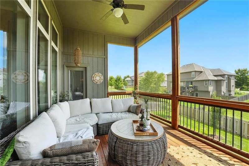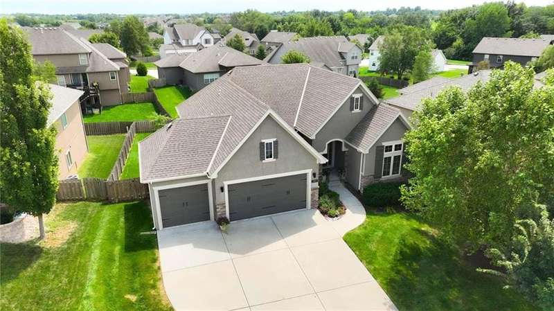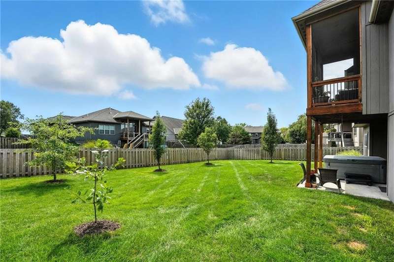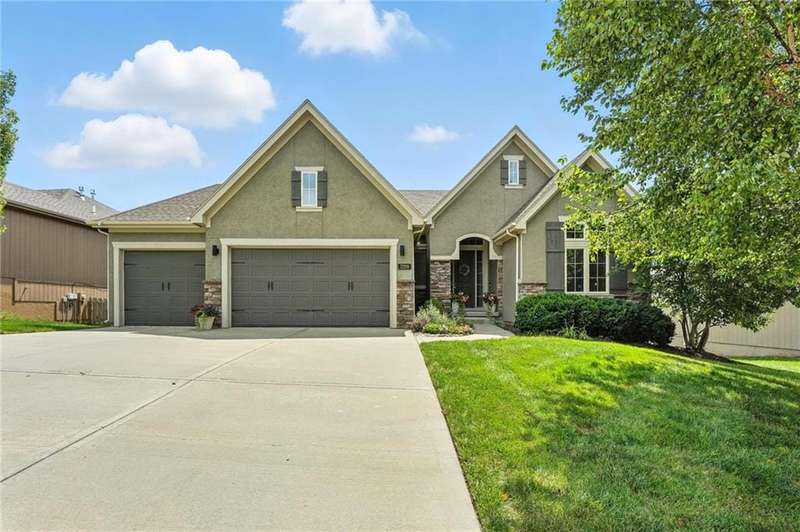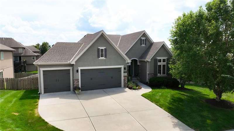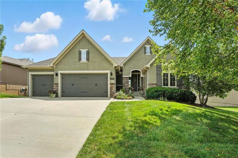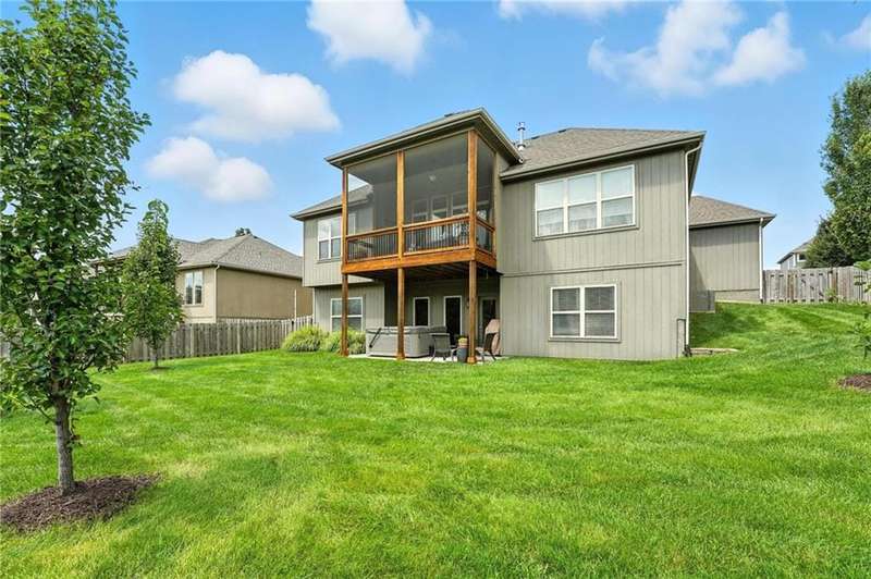 Back on Market at No Fault of Seller! Meticulously maintained and impeccably designed, this reverse 1.5 story in sought-after Staley Hills offers refined main-level living with every detail thoughtfully curated. Rich hardwood floors flow throughout the open main living spaces, where a gourmet kitchen takes center stage with a striking quartz island, granite perimeter countertops, stainless steel appliances, a single-basin sink, and an amazing walk-in pantry complete with custom built-in cabinetry. The great room is a showpiece with a stone fireplace, built-in shelving, and walls of windows that flood the home with natural light. The serene primary suite offers private access to the screened-in deck and a spa-worthy bath with dual granite vanities, a soaker tub, oversized tiled shower with double shower heads, generous linen storage, and a walk-in closet seamlessly connected to the laundry room. A mudroom with bench and cubbies adds both style and function. A secondary main-level bedroom doubles beautifully as a home office, while custom shades and designer window treatments elevate every room. The lower level extends the living space with a spacious family/rec room, wet bar, two large bedrooms with walk-in closets, a full and half bath, and abundant storage. Brand-new high-end carpet in all bedrooms and the lower level provides a fresh, luxurious touch. Outdoor living shines with a screened-in deck, beautifully landscaped and fenced yard, and a full-yard sprinkler system. Residents enjoy neighborhood pools, ponds, walking trails, a play area, and the ability to stroll to Anne Garney Park. This home is truly turn-key offering an elevated lifestyle where upscale design meets effortless livability. Conveniently located in Staley High School attendance area in the Award Winning North Kansas City School District.